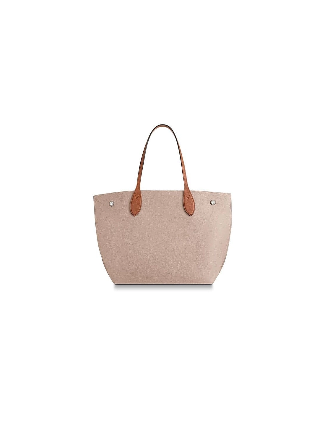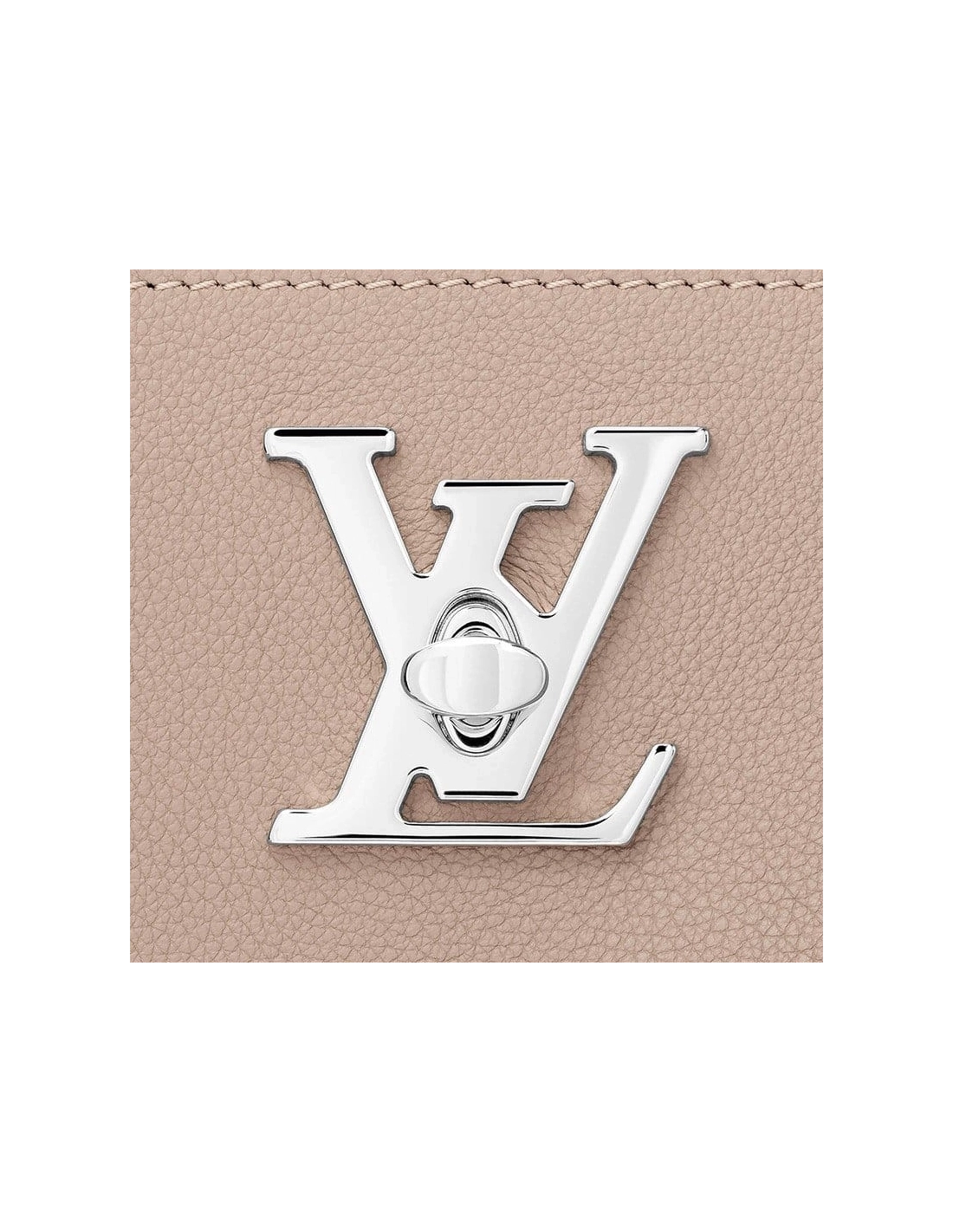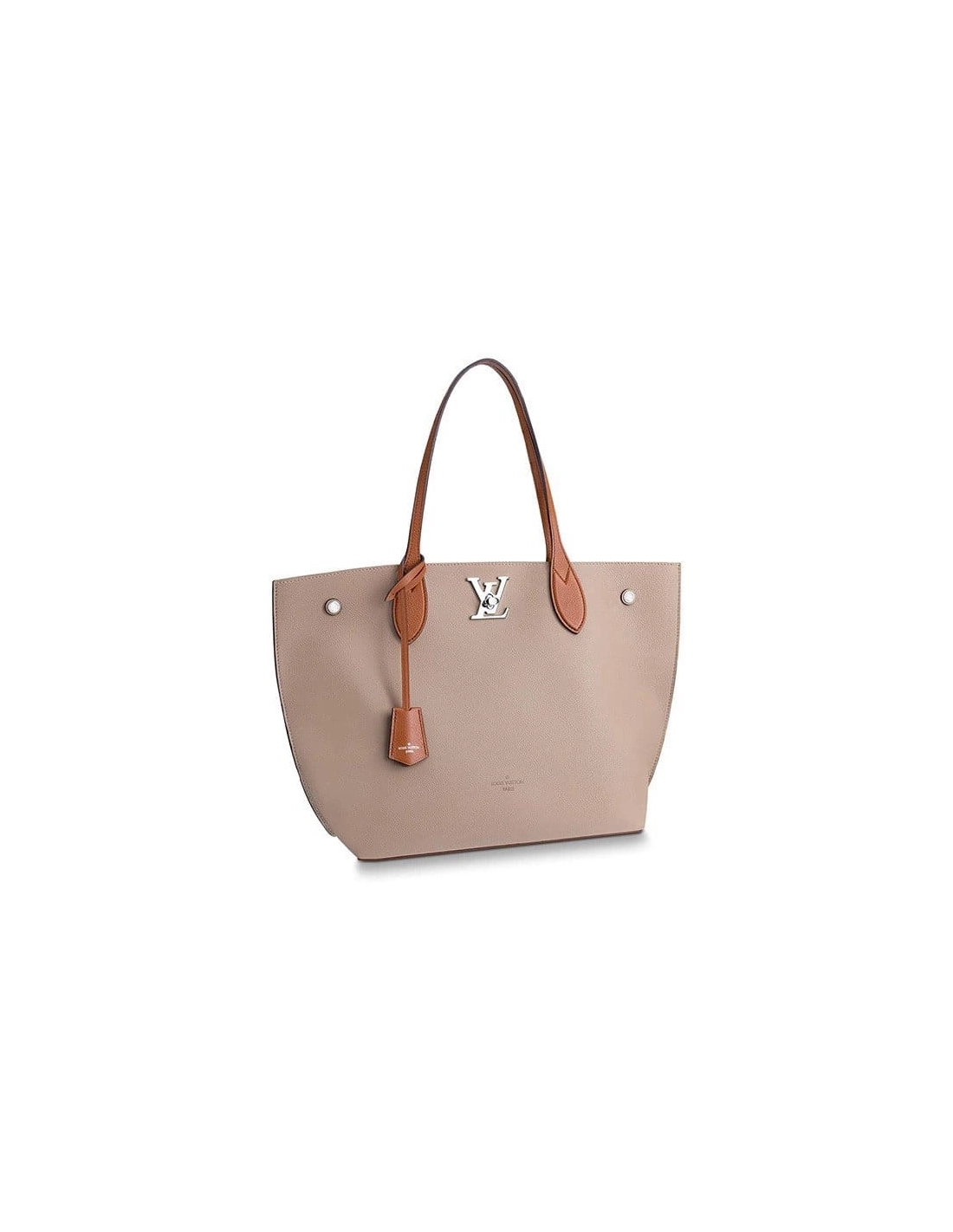 Dedicated to the elegant, active woman, this Lockme Go tote offers both flawless functionality and uncompromising style. Crafted from soft, grained calfskin, with double handles designed for comfortable over-the-shoulder wear, this essential modern carry-all is accented with a silvery LV turn lock and two snap buttons to keep belongings secure.