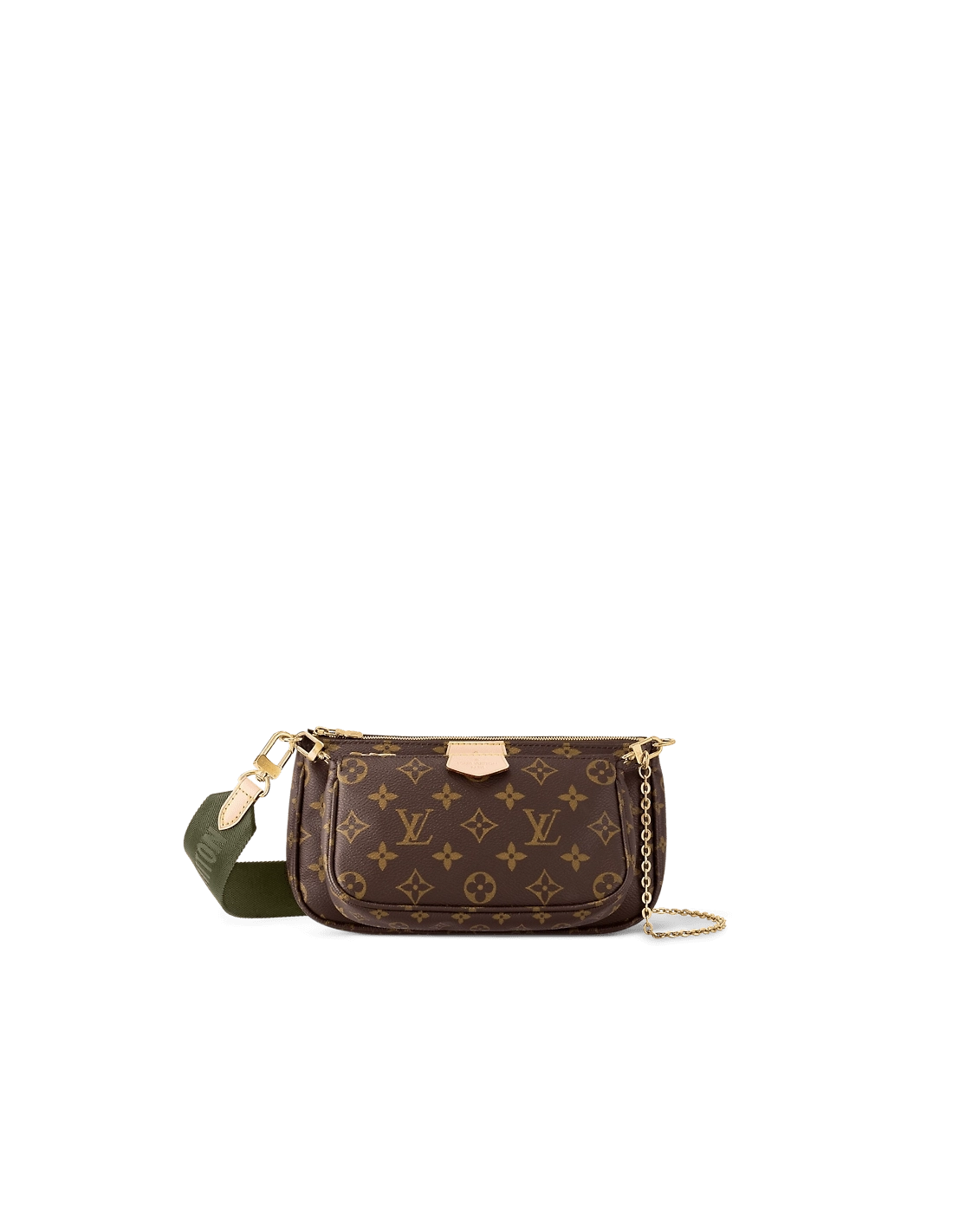 The Multi Pochette Accessoires is a hybrid cross-body bag with multiple pockets and compartments that brings together a Pochette Accessoires, a Mini Pochette Accessoires and a Round Coin Purse. Fashioned from Monogram canvas with a mini Monogram pattern on the sides of the two pochettes, it has both a removable gold-tone chain and an adjustable Louis Vuitton inscribed Jacquard strap for multiple carrying options.