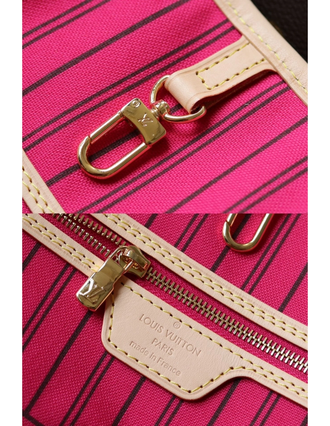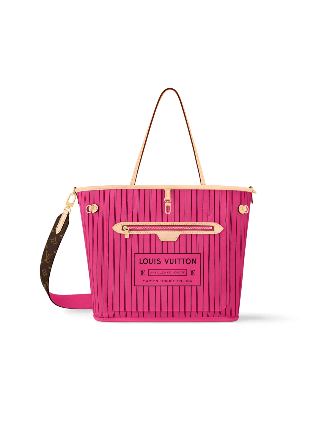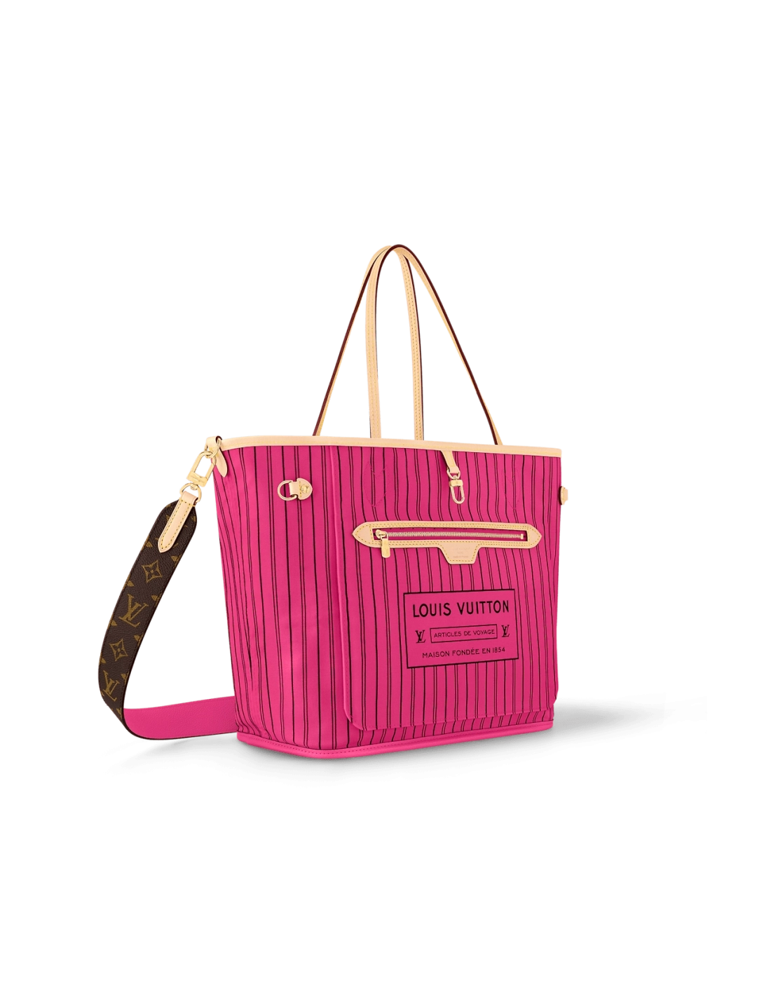 Offered in a new reversible design, the iconic Neverfull Bandouliere Inside Out MM tote is a timeless choice. This edition is made from Monogram canvas and has a brightly colored textile thats patterned with stripes. It also features a removable strap that allows for crossbody carry. Use the side hooks to transform it into a hobo silhouette.