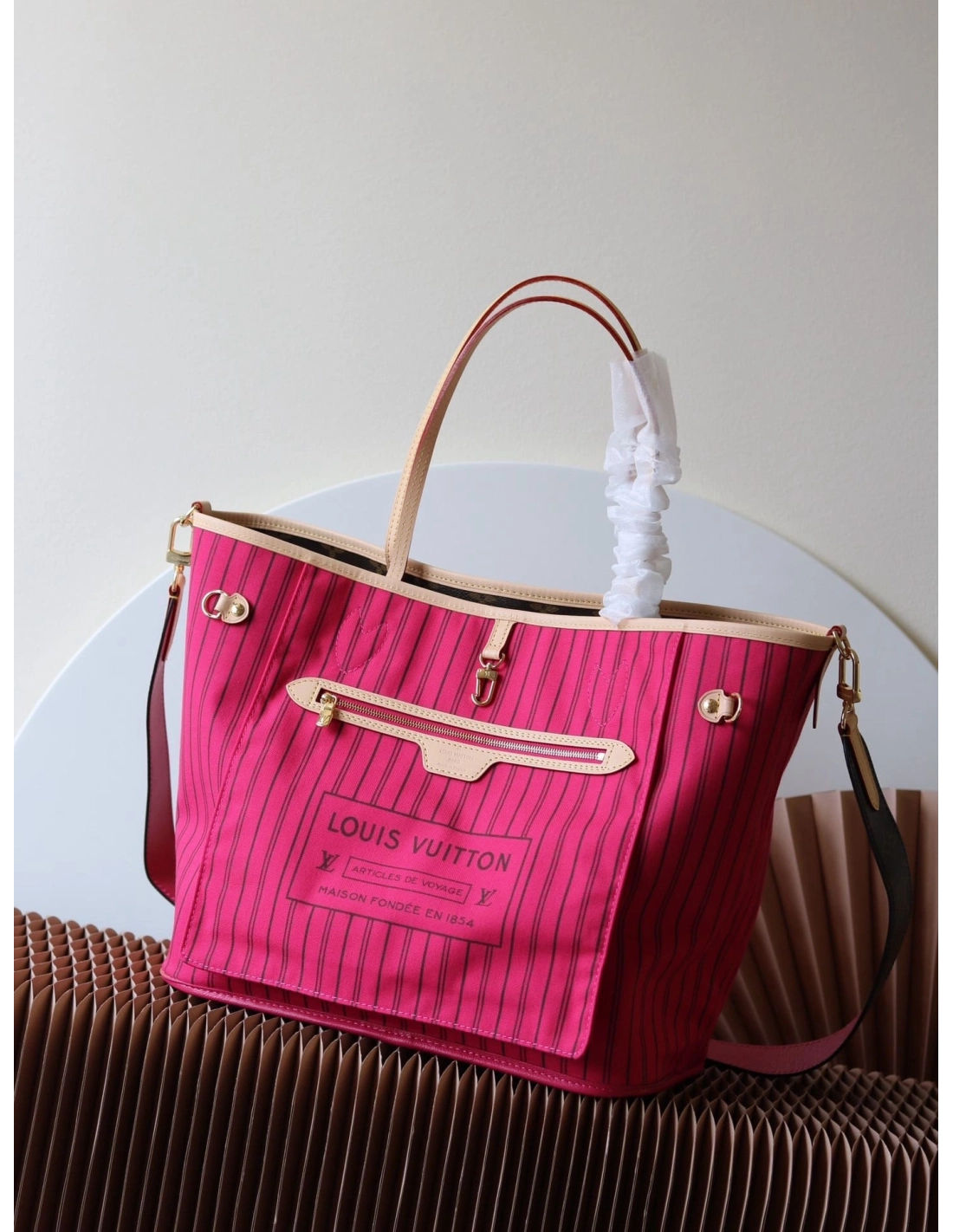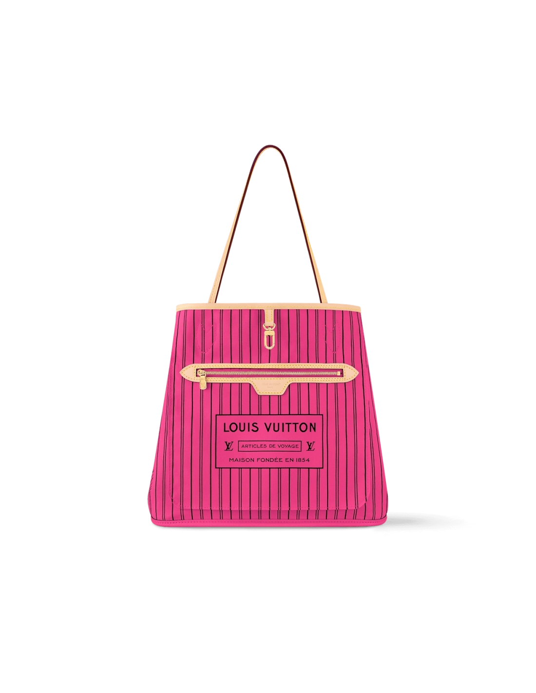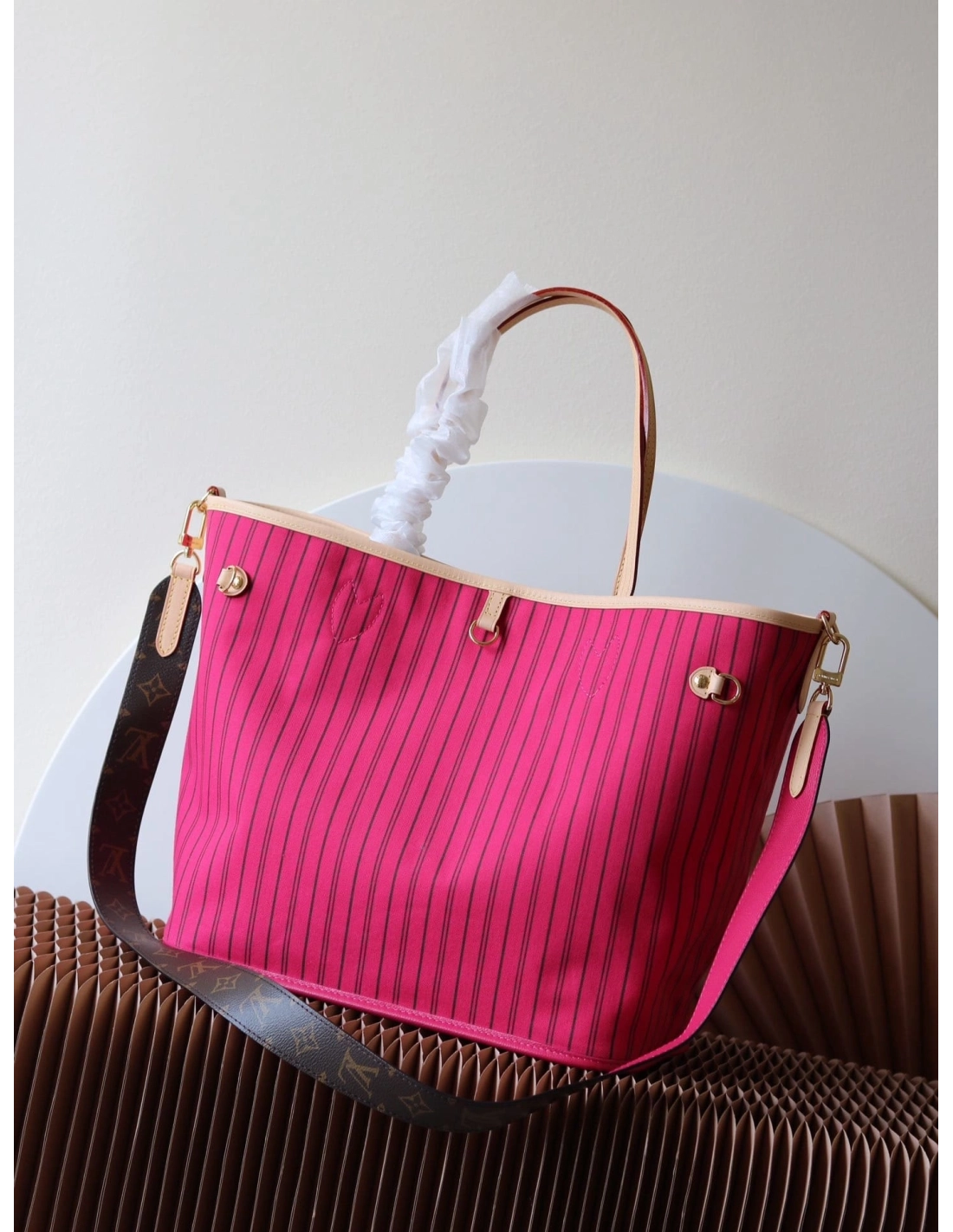 Offered in a new reversible design, the iconic Neverfull Bandouliere Inside Out MM tote is a timeless choice. This edition is made from Monogram canvas and has a brightly colored textile thats patterned with stripes. It also features a removable strap that allows for crossbody carry. Use the side hooks to transform it into a hobo silhouette.