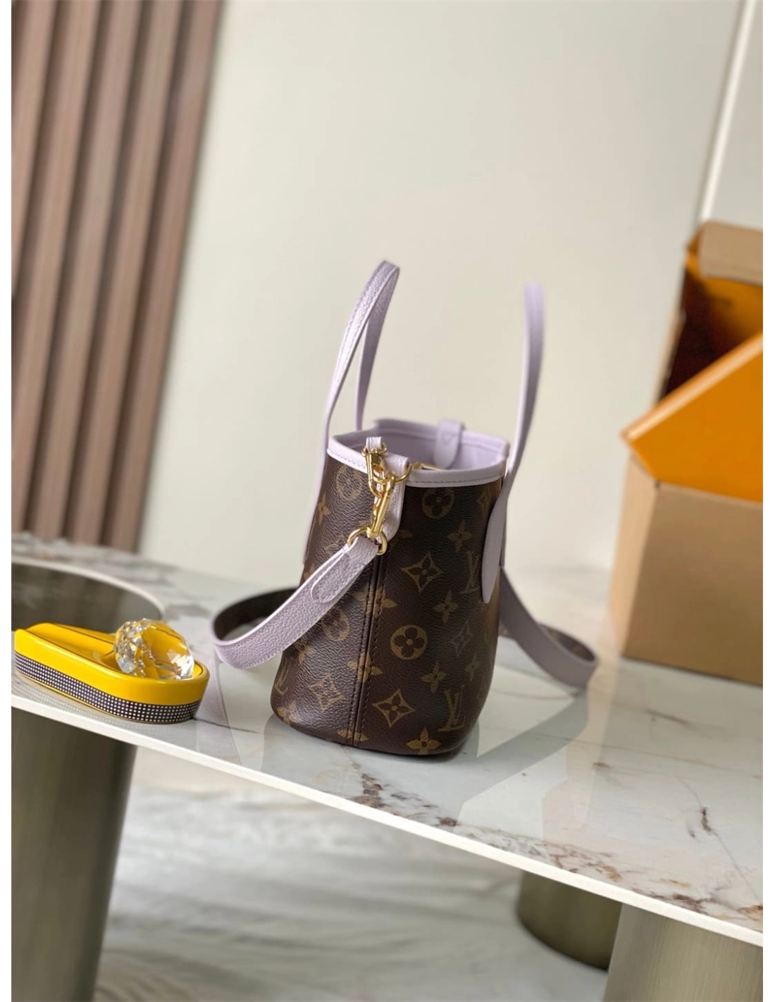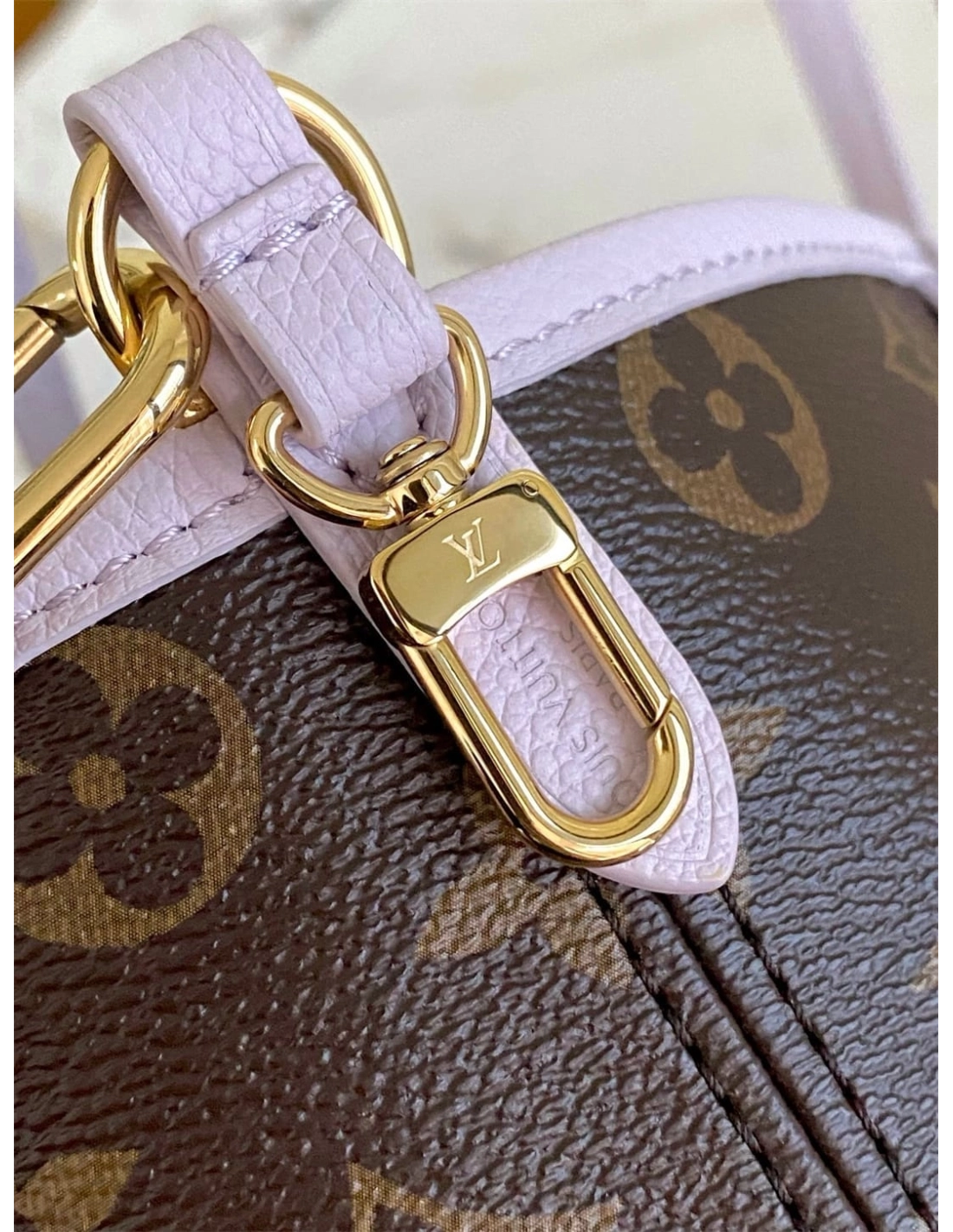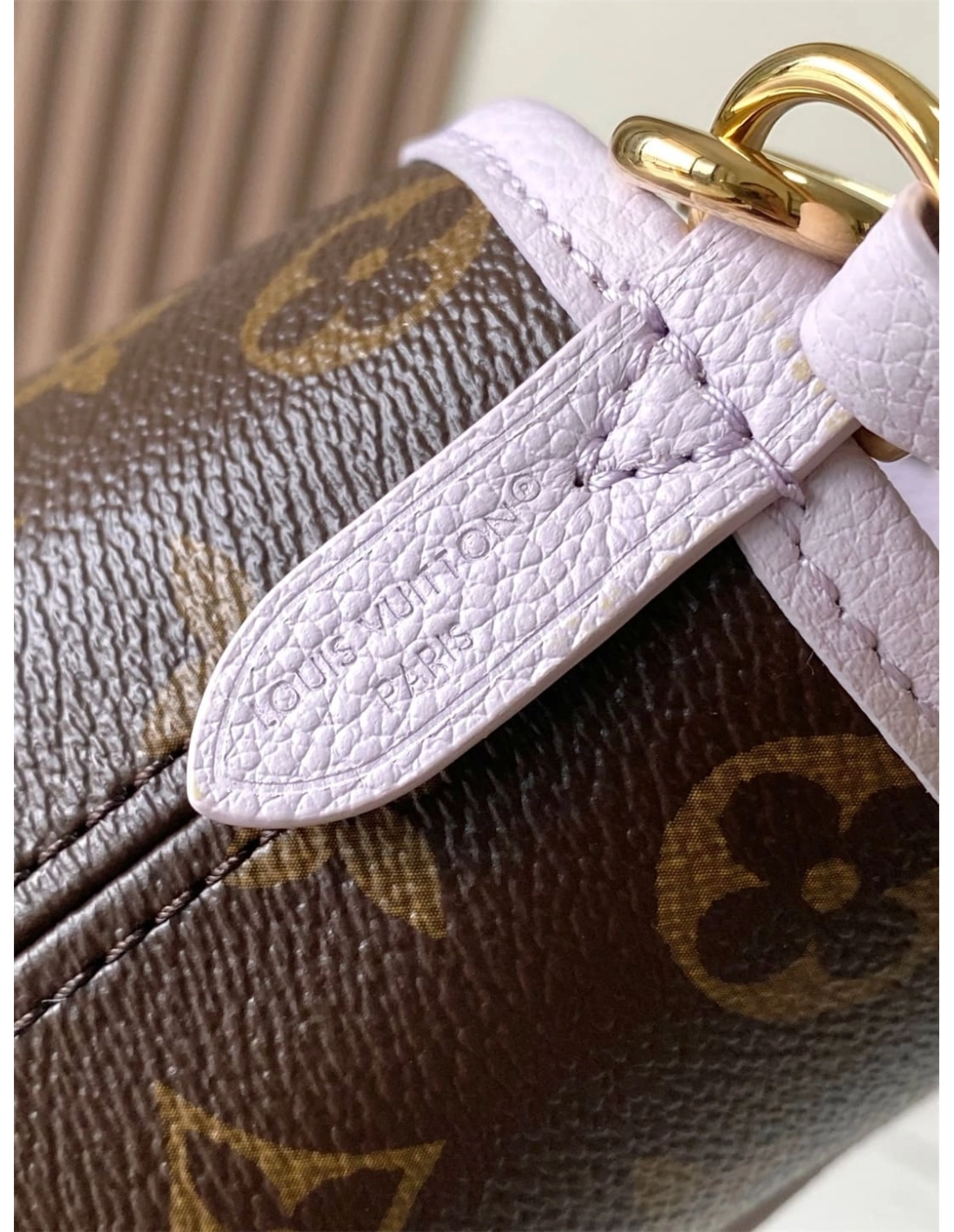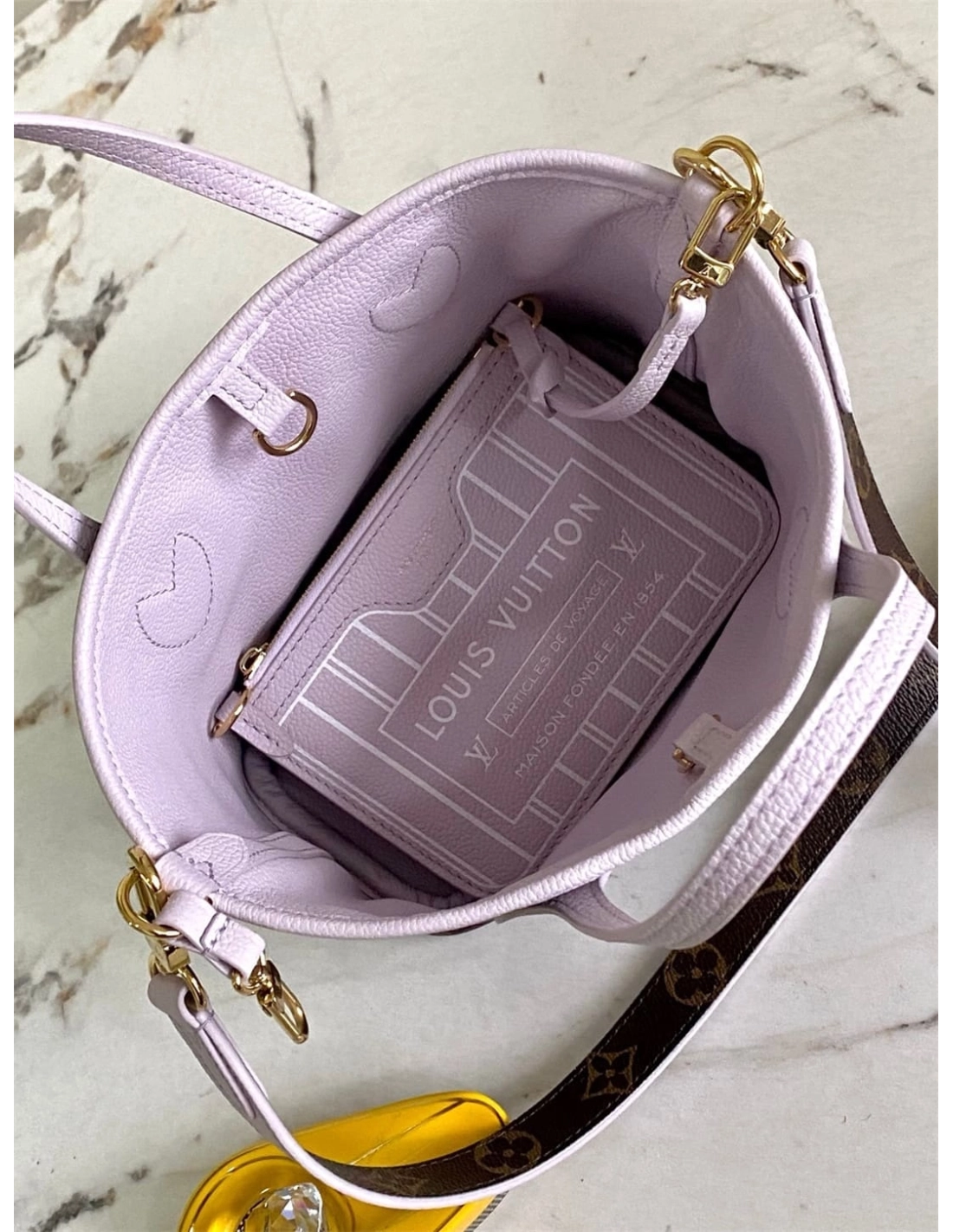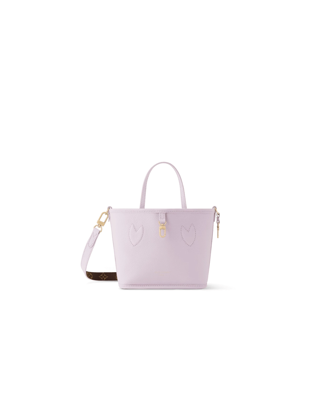 This edition of the Neverfull Bandouliere Inside Out BB can be worn two ways: showcasing Misty Lilac grained leather on one side, or reversed to feature the Houses signature Monogram canvas. It comes with a removable zipped pouch that can be used on its own or attached as an exterior pocket. Gleaming gold-toned hardware adds the final touch. Use the longer strap to wear it crossbody.