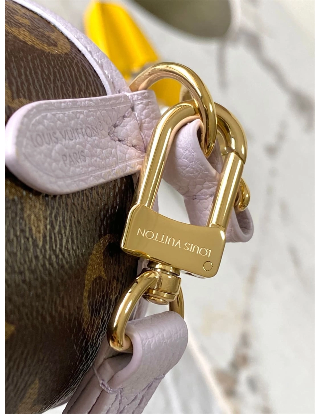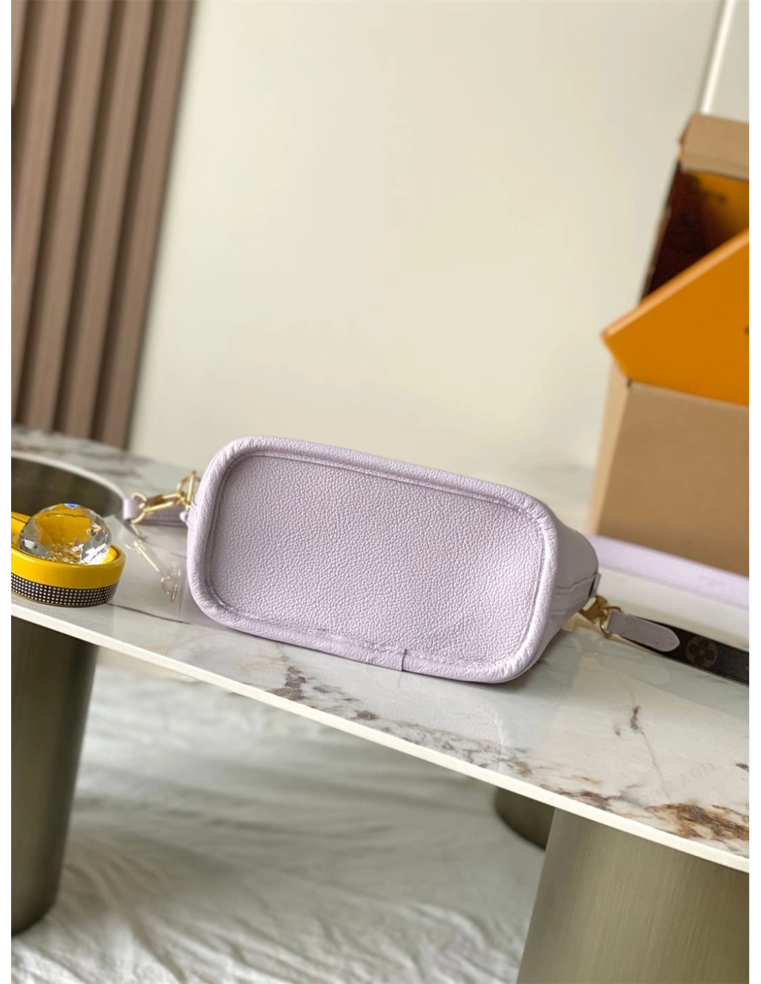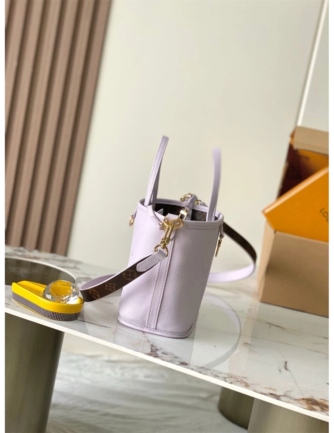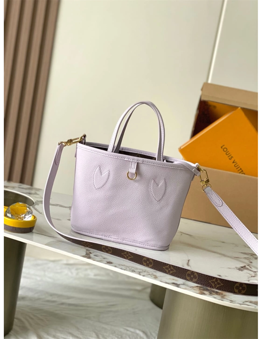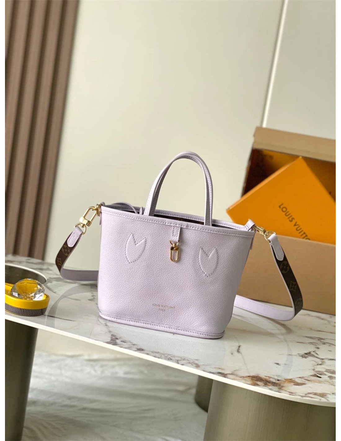 This edition of the Neverfull Bandouliere Inside Out BB can be worn two ways: showcasing Misty Lilac grained leather on one side, or reversed to feature the Houses signature Monogram canvas. It comes with a removable zipped pouch that can be used on its own or attached as an exterior pocket. Gleaming gold-toned hardware adds the final touch. Use the longer strap to wear it crossbody.