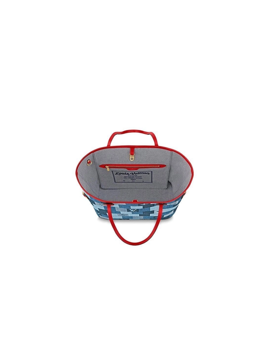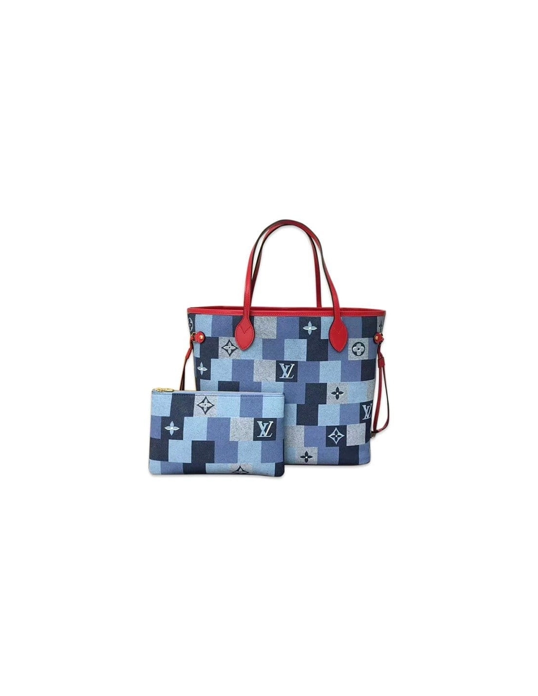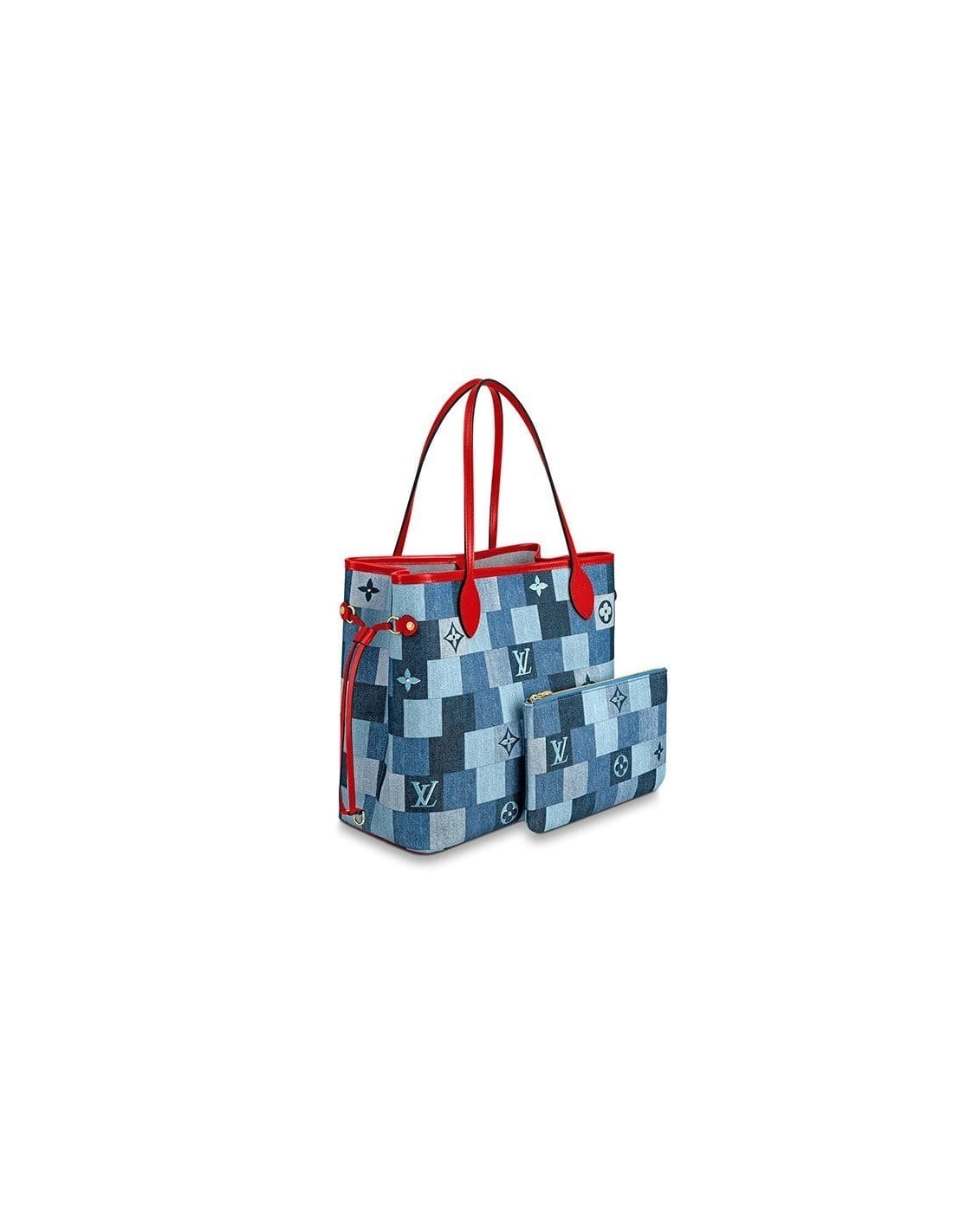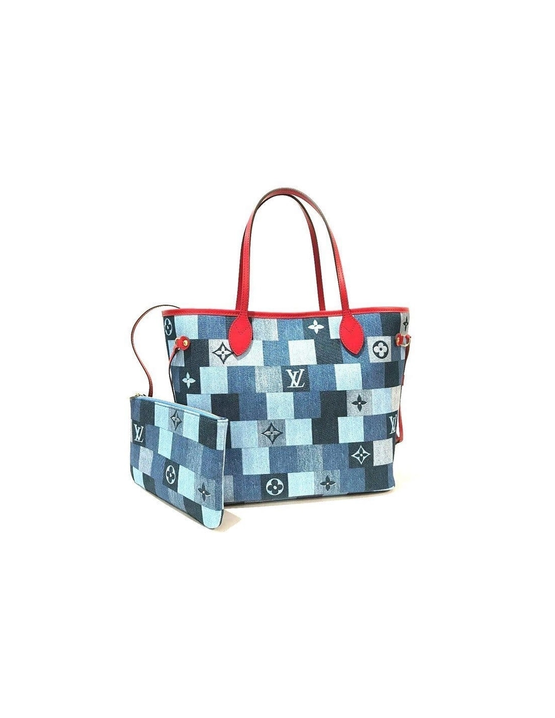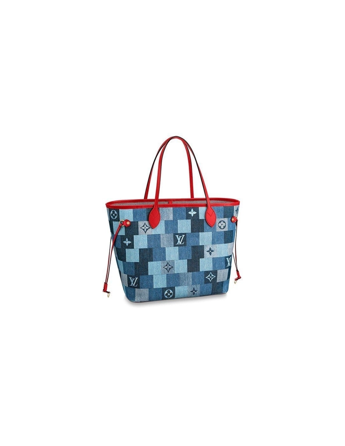This edition of the legendary Neverfull tote looks fresh and fashionable, dressed in a patchwork of denim-blue hues. The pattern combines Damier with Monogram motifs, expertly printed on the canvas to give the illusion of texture and volume. Handles and side laces made of brilliant red leather enhance the crafted look of this versatile signature bag.