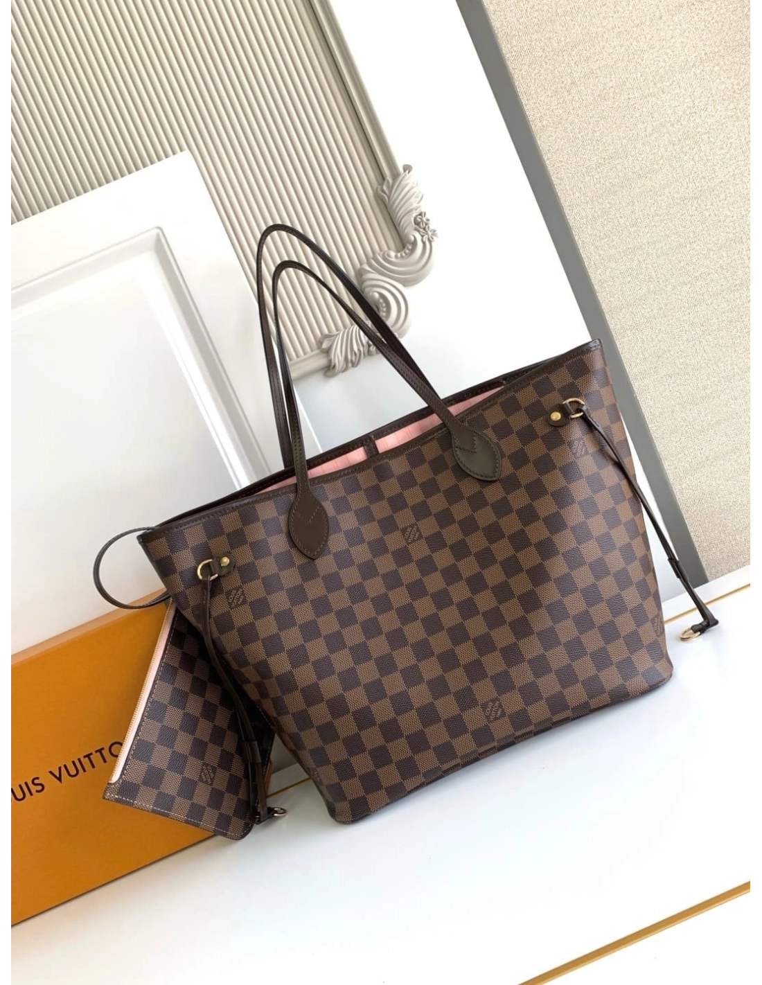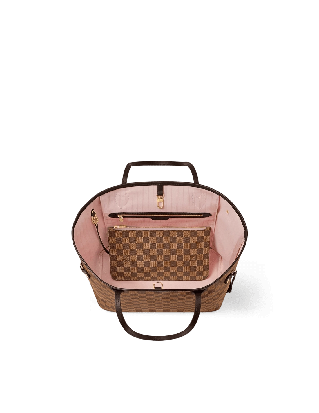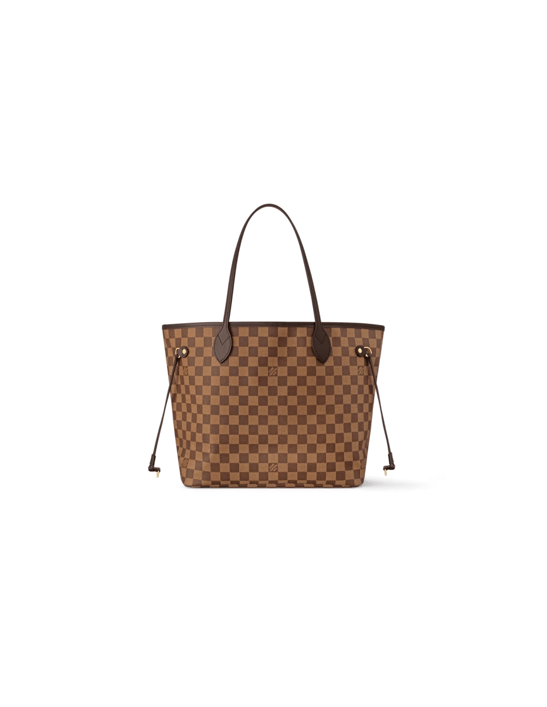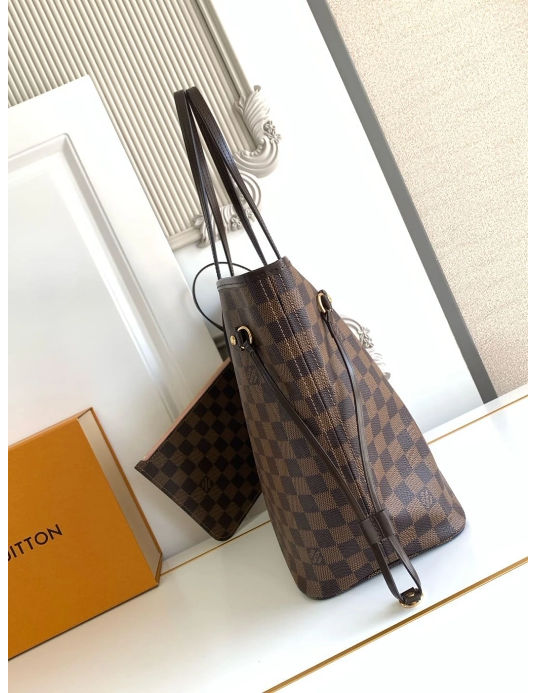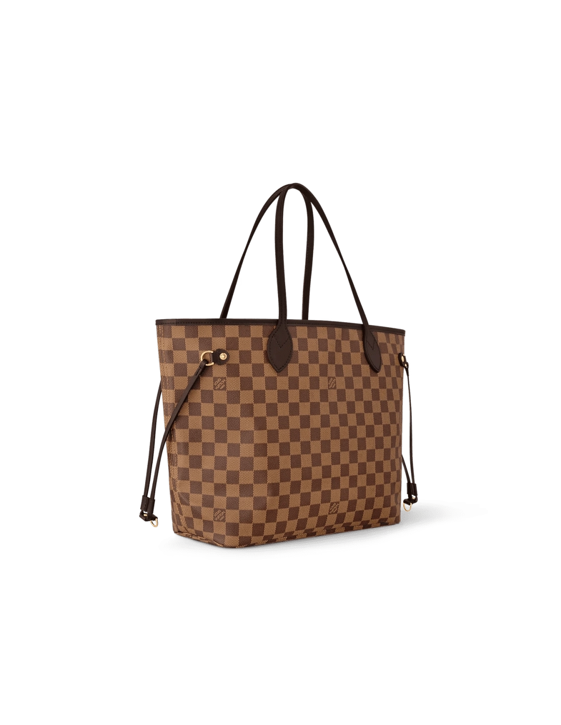 The Neverfull MM tote unites timeless design with heritage details. Elegant in Damier Ebene canvas with natural cowhide trim, it is roomy but not bulky, with side laces that cinch for a sleek allure or loosen for a casual look. Slim, comfortable handles slip easily over the shoulder or arm. Lined in colorful textile, it features a removable pouch which can be used as a clutch or an extra pocket.