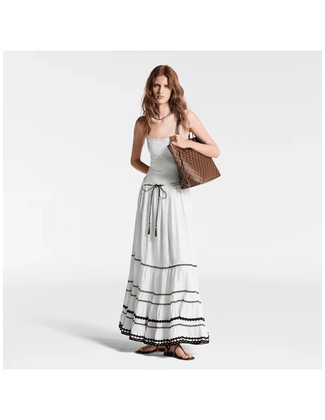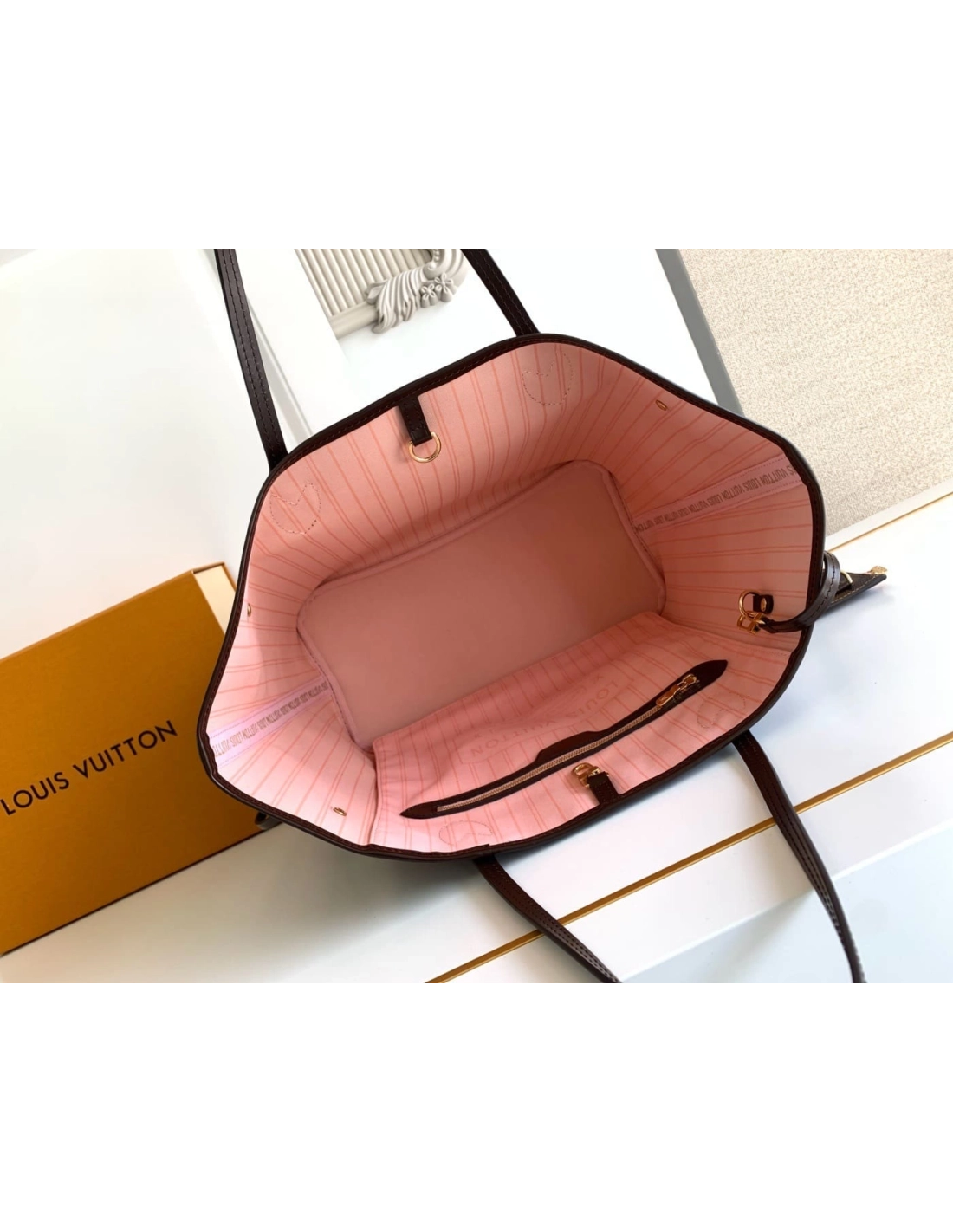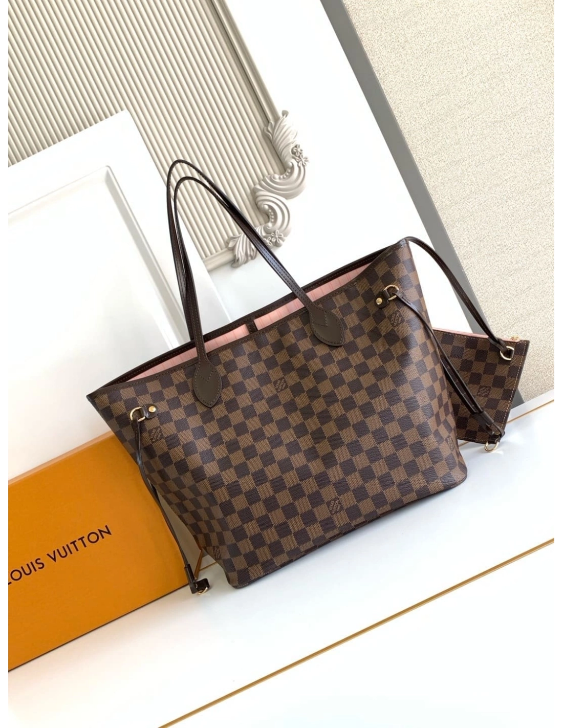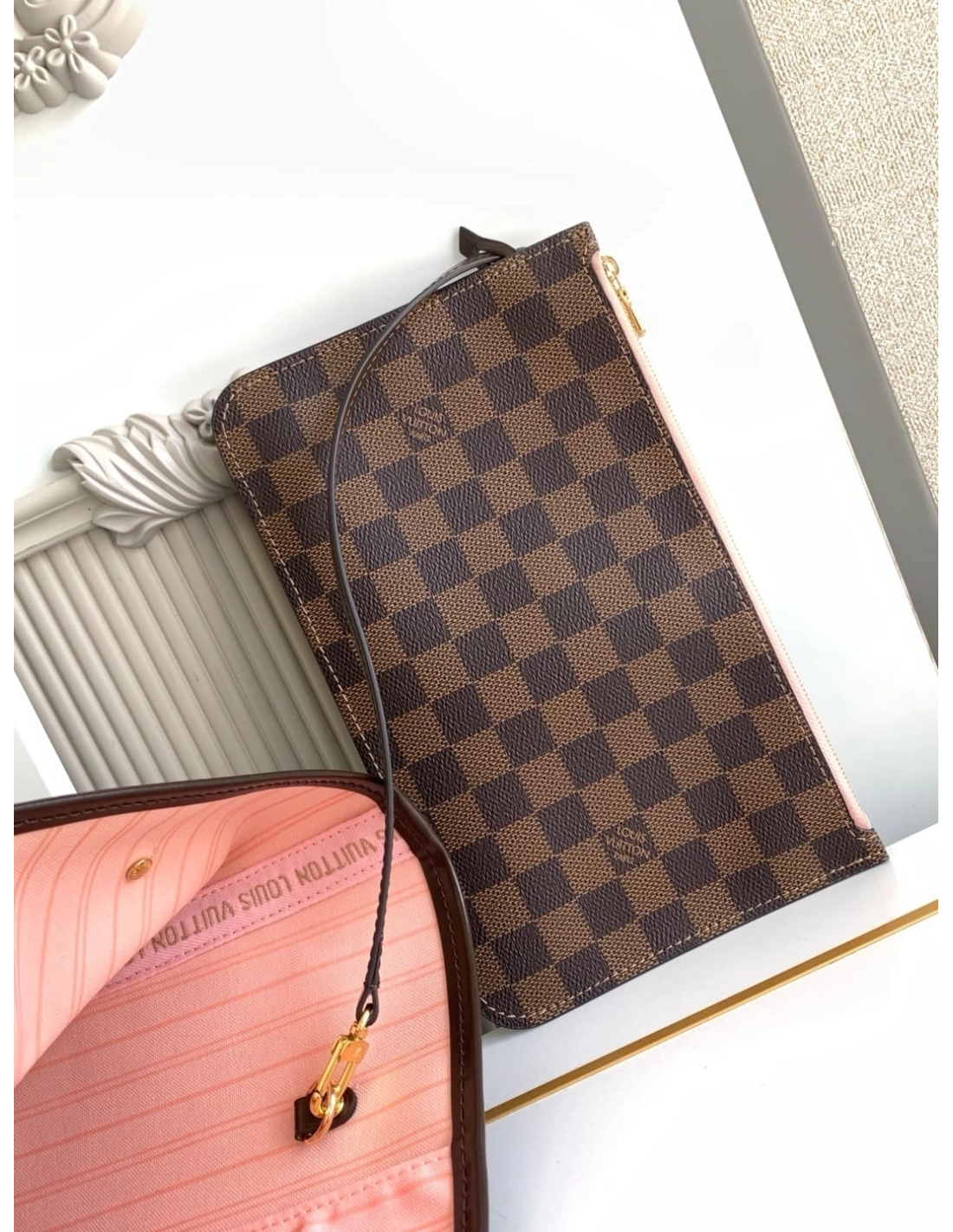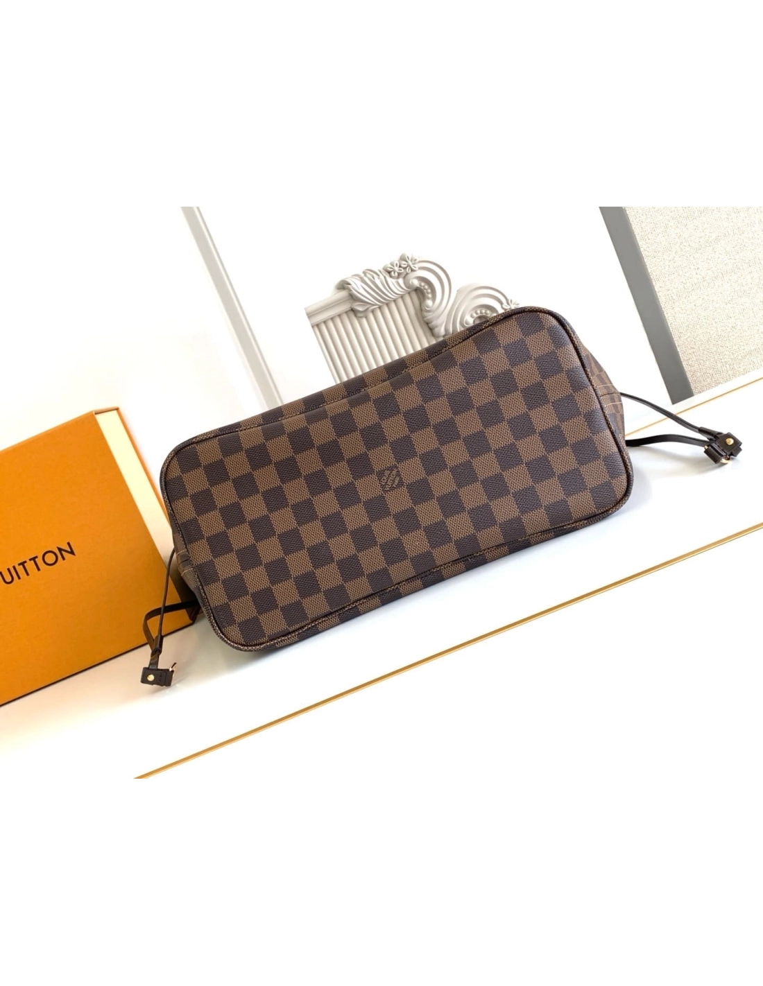 The Neverfull MM tote unites timeless design with heritage details. Elegant in Damier Ebene canvas with natural cowhide trim, it is roomy but not bulky, with side laces that cinch for a sleek allure or loosen for a casual look. Slim, comfortable handles slip easily over the shoulder or arm. Lined in colorful textile, it features a removable pouch which can be used as a clutch or an extra pocket.