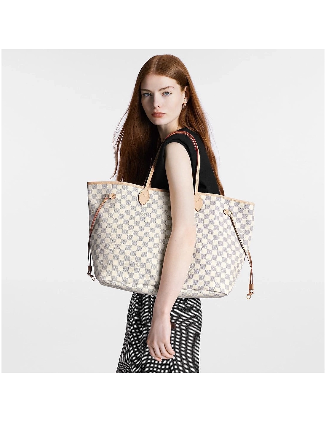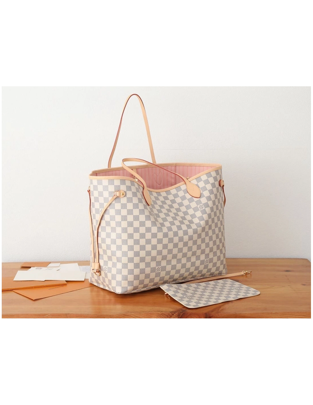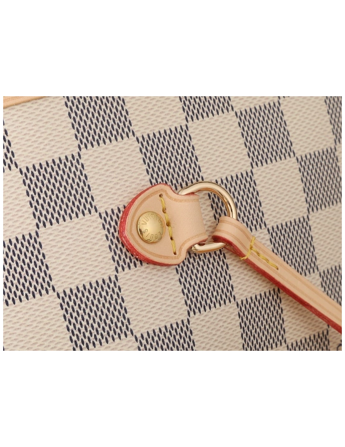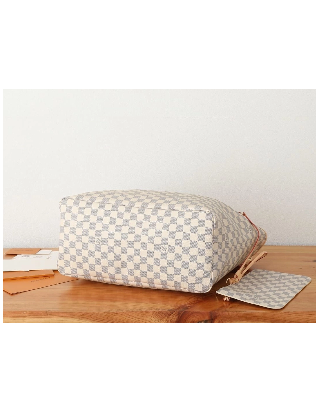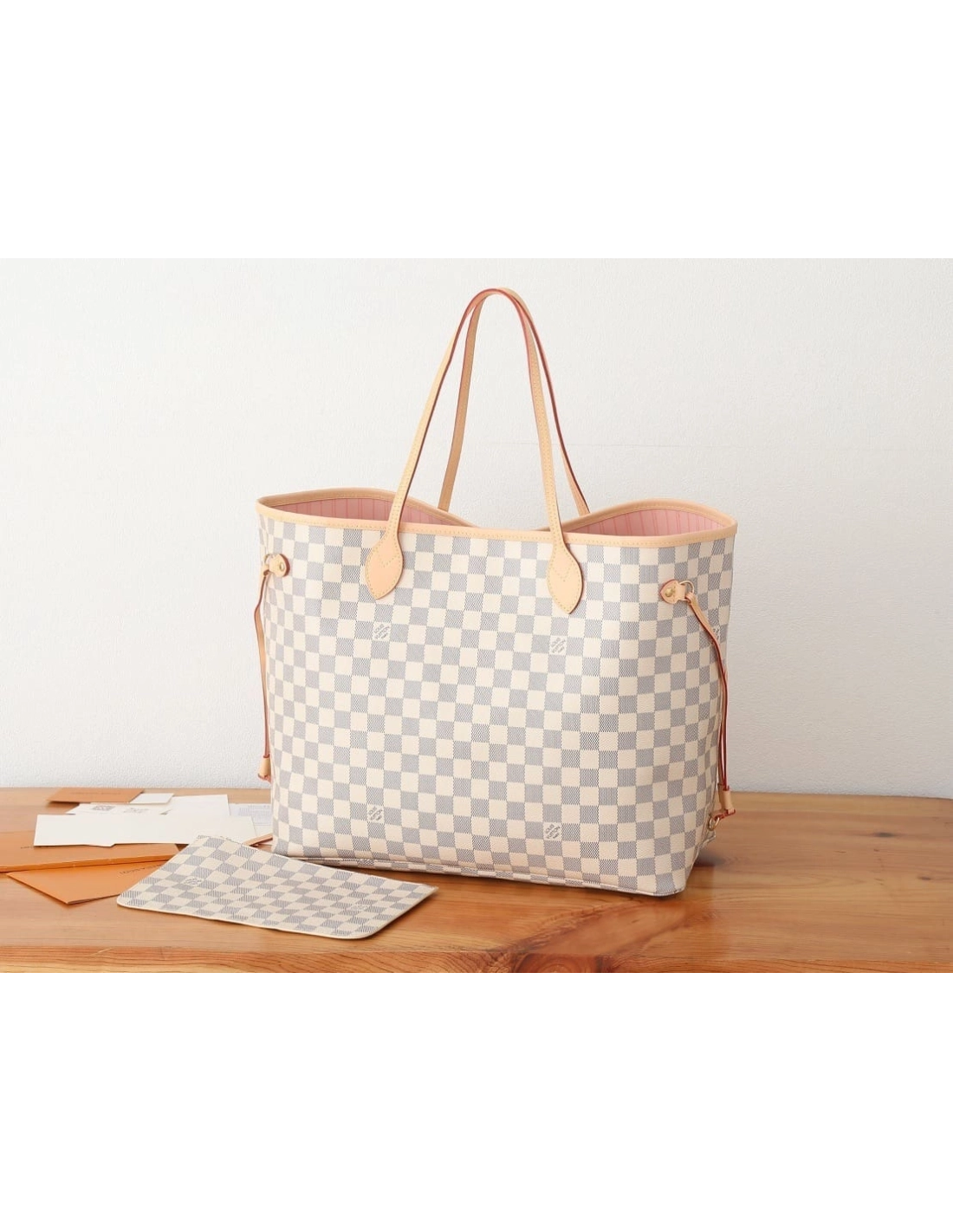 The Neverfull GM tote unites timeless design with heritage details. Crafted from fresh Damier Azur canvas with natural cowhide trim, it is ultra-roomy yet never bulky, with side laces that cinch for a sleek allure or loosen for a more casual look. Slim, comfortable handles slip easily over the shoulder or arm. Lined in colorful textile, it features a removable pouch which can serve as a clutch or an extra pocket.