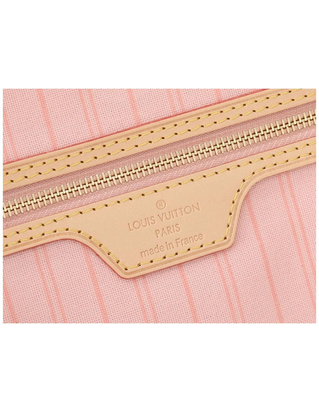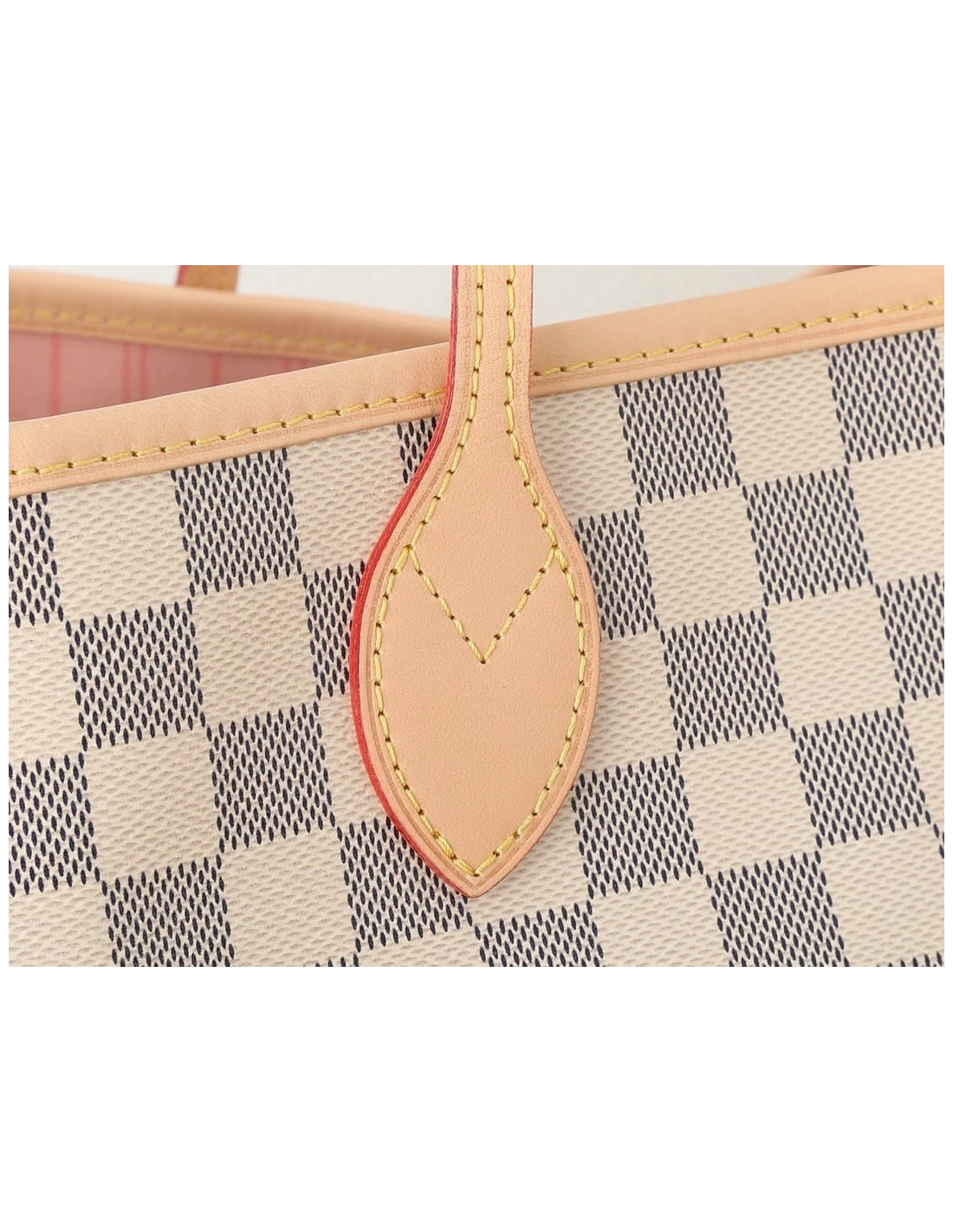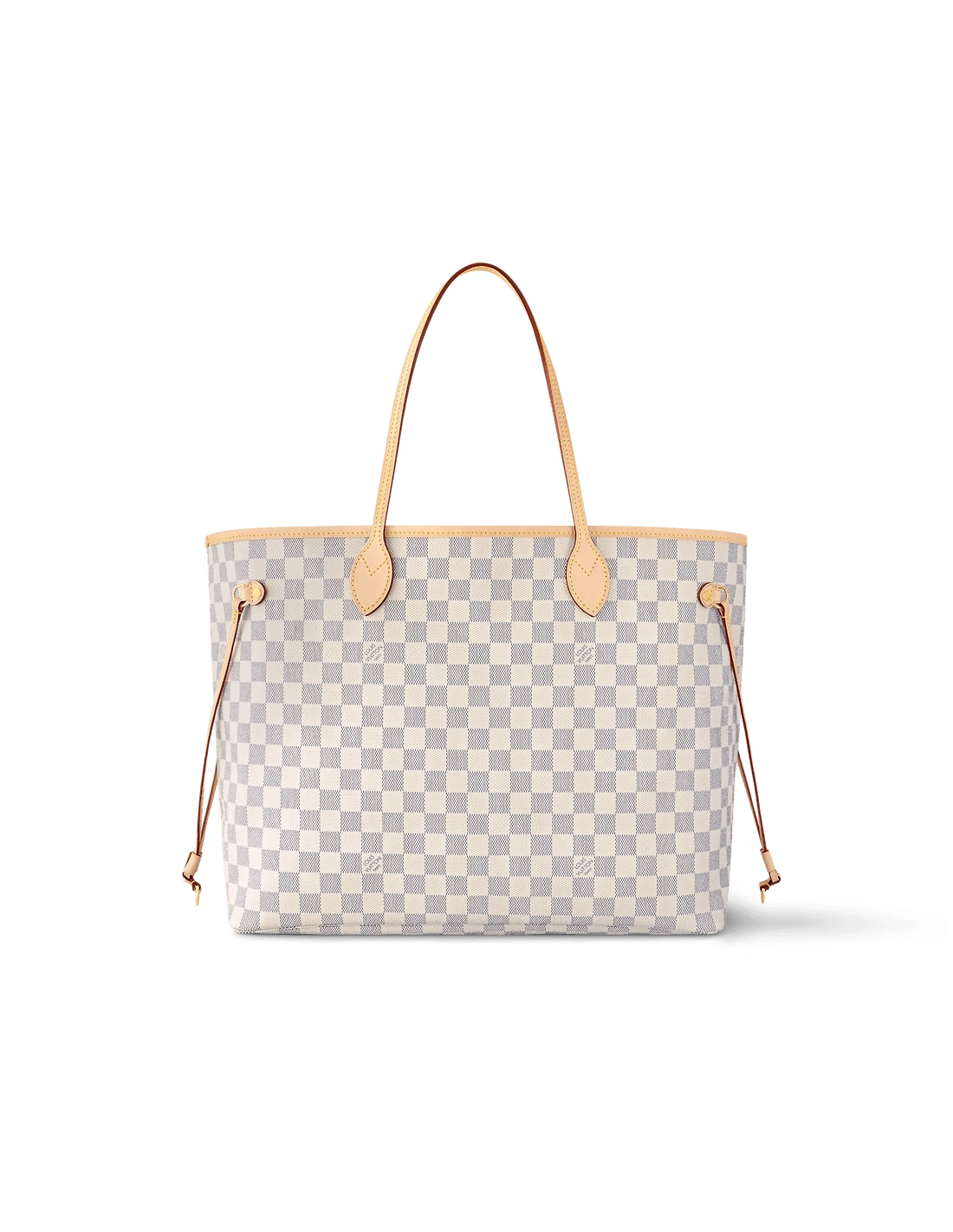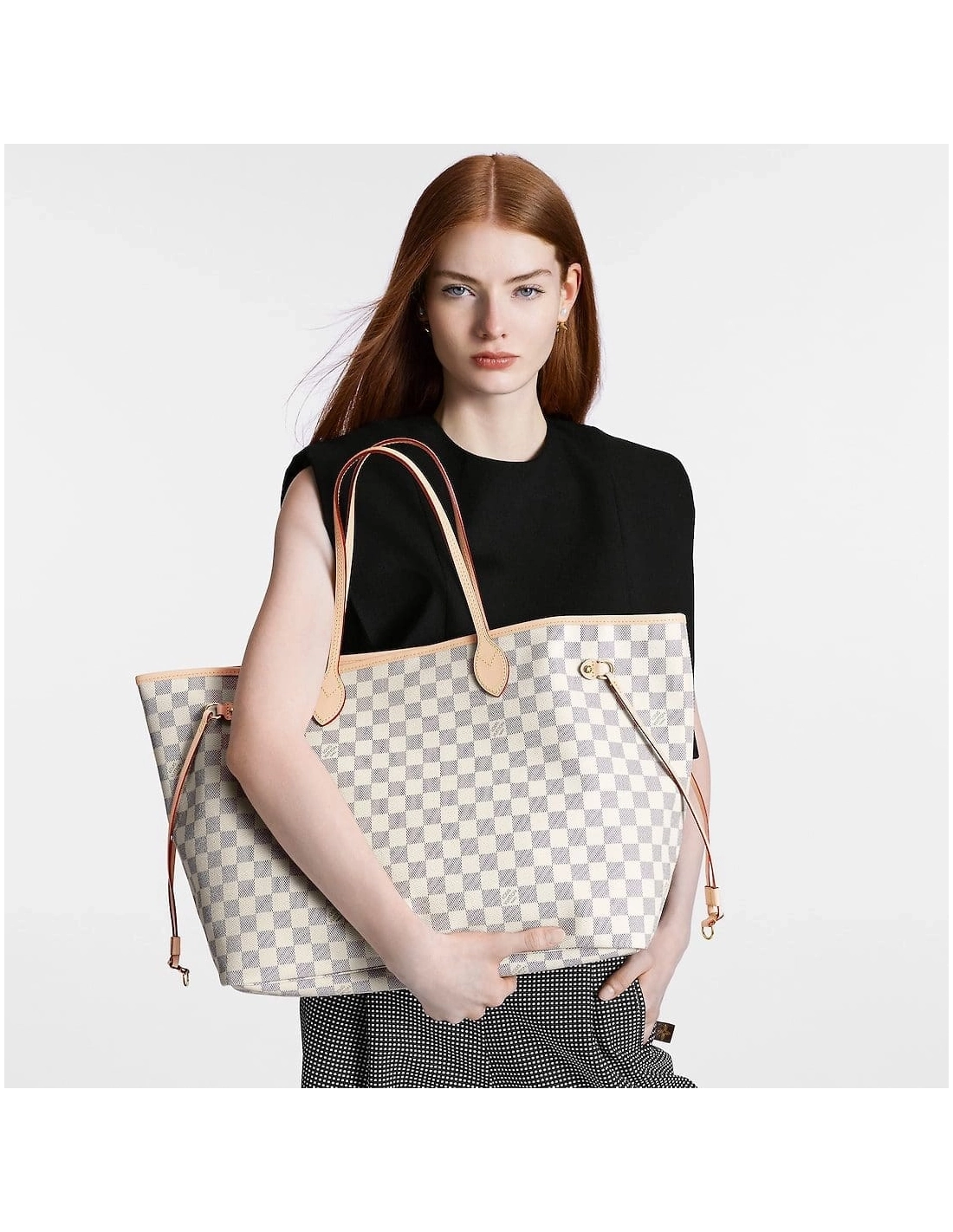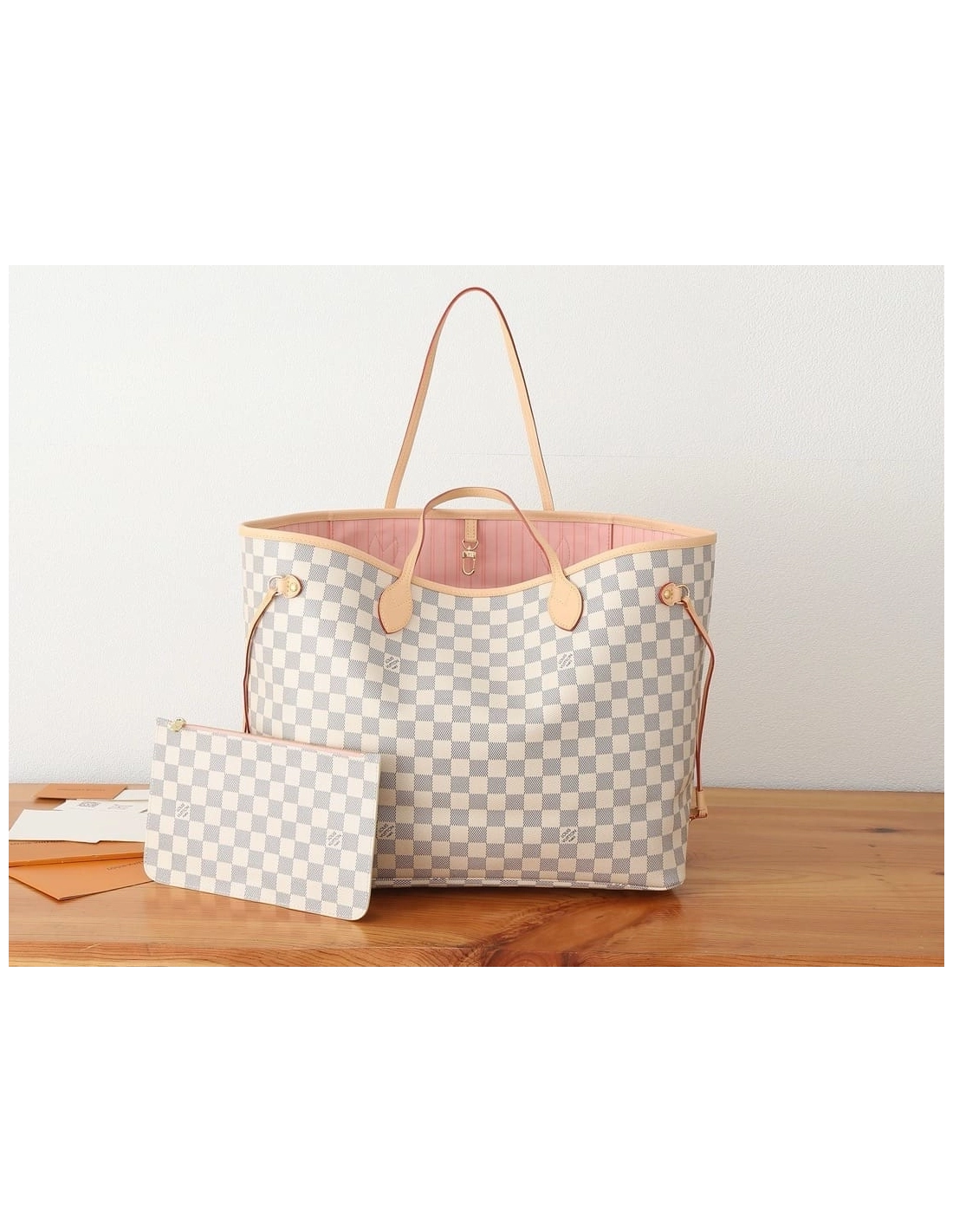 The Neverfull GM tote unites timeless design with heritage details. Crafted from fresh Damier Azur canvas with natural cowhide trim, it is ultra-roomy yet never bulky, with side laces that cinch for a sleek allure or loosen for a more casual look. Slim, comfortable handles slip easily over the shoulder or arm. Lined in colorful textile, it features a removable pouch which can serve as a clutch or an extra pocket.