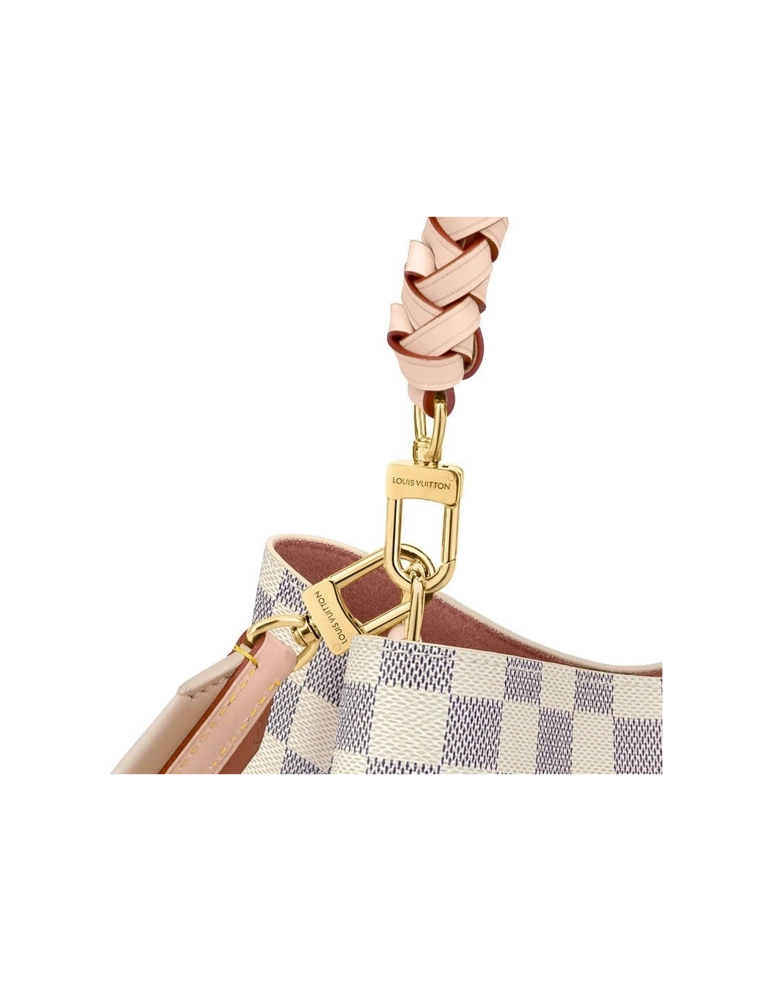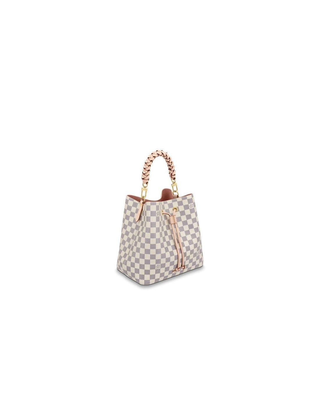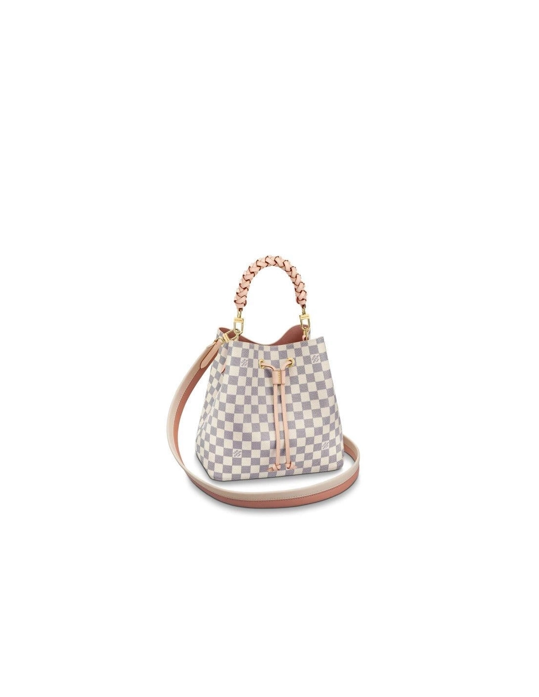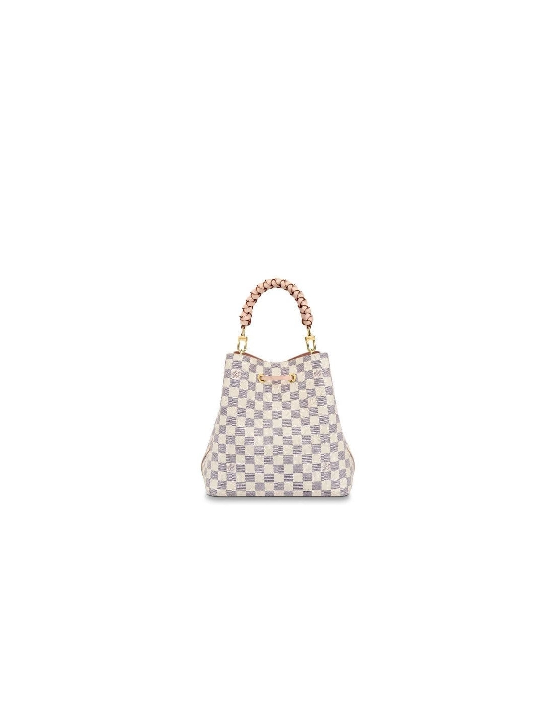 For Summer 2020, the NeoNoe bucket bag in Damier Azur canvas features a braided-leather top handle. The hand-painted edge-dyeing of the top-handle leather is a gauge of the Houses commitment to craftsmanship. It can be hand-carried or worn over the shoulder and cross-body, with its bicolor, removable leather strap.