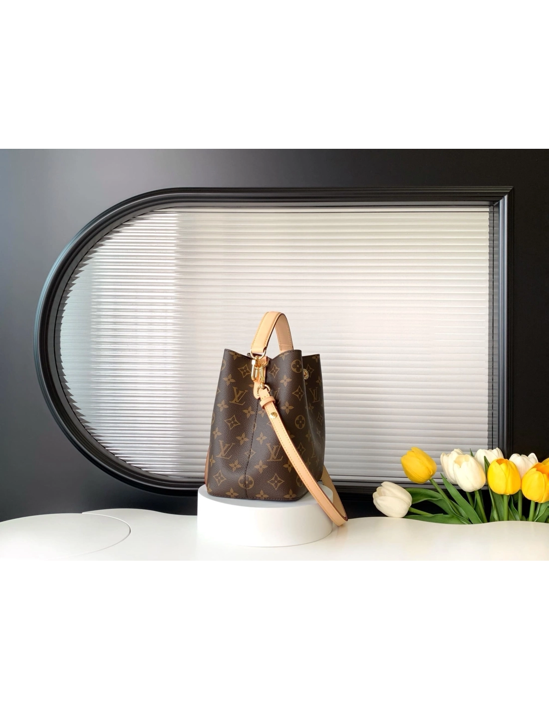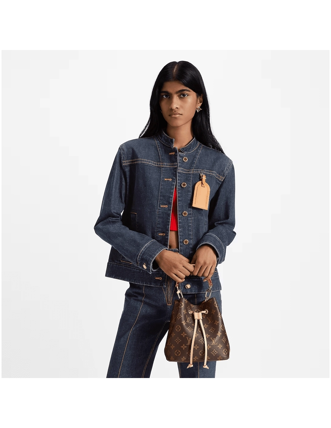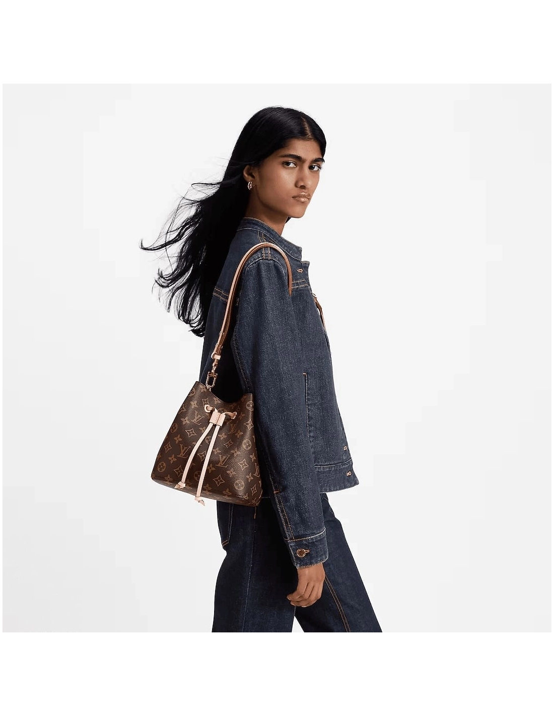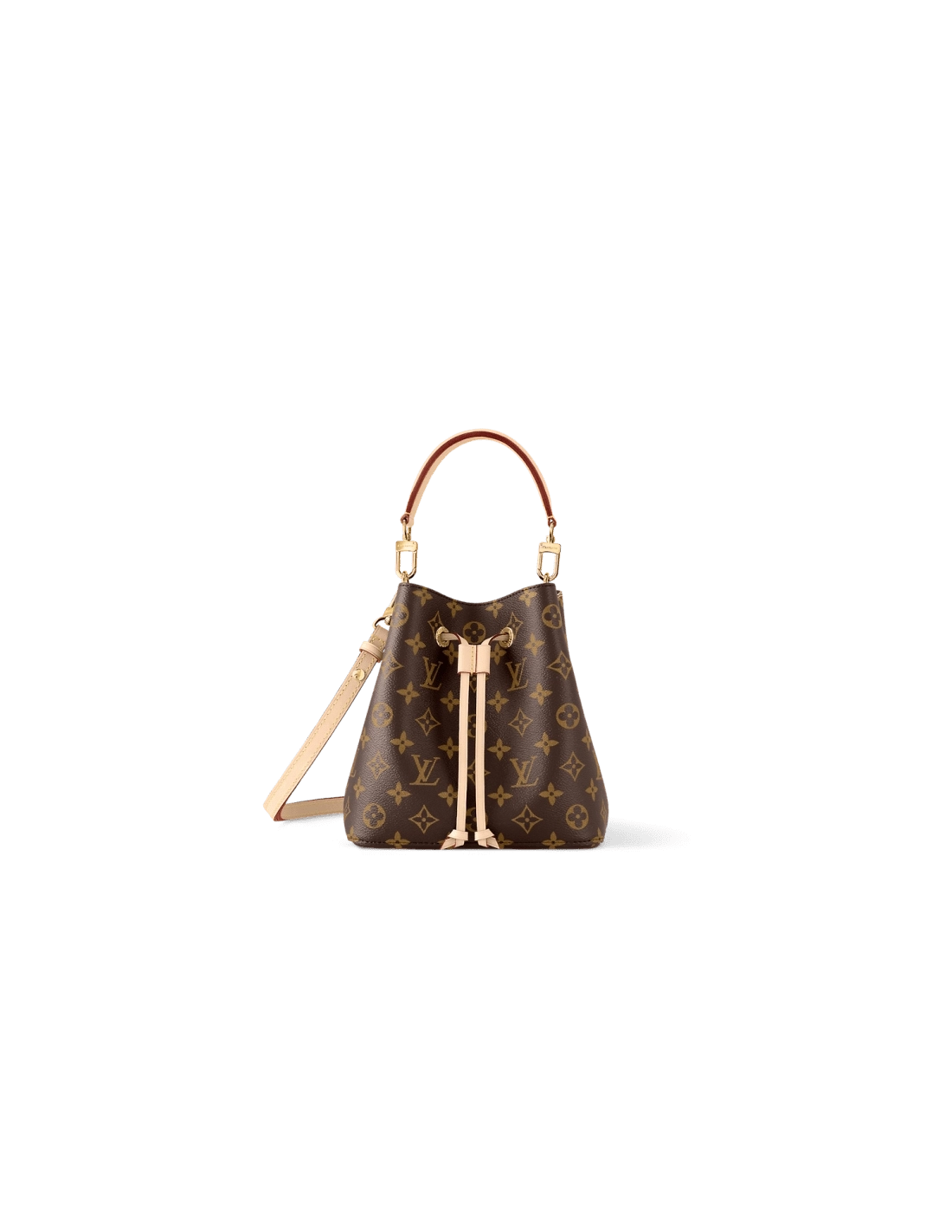 The NeoNoe BB in Monogram canvas with natural leather trim is a smaller interpretation of the Houses iconic NeoNoe bucket bag. Spacious enough to hold essentials such as keys, Airpods, and an iPhone, it features a leather drawstring to close the bag and keep belongings secure. A removable handle and detachable, adjustable strap offer multiple carry options.
