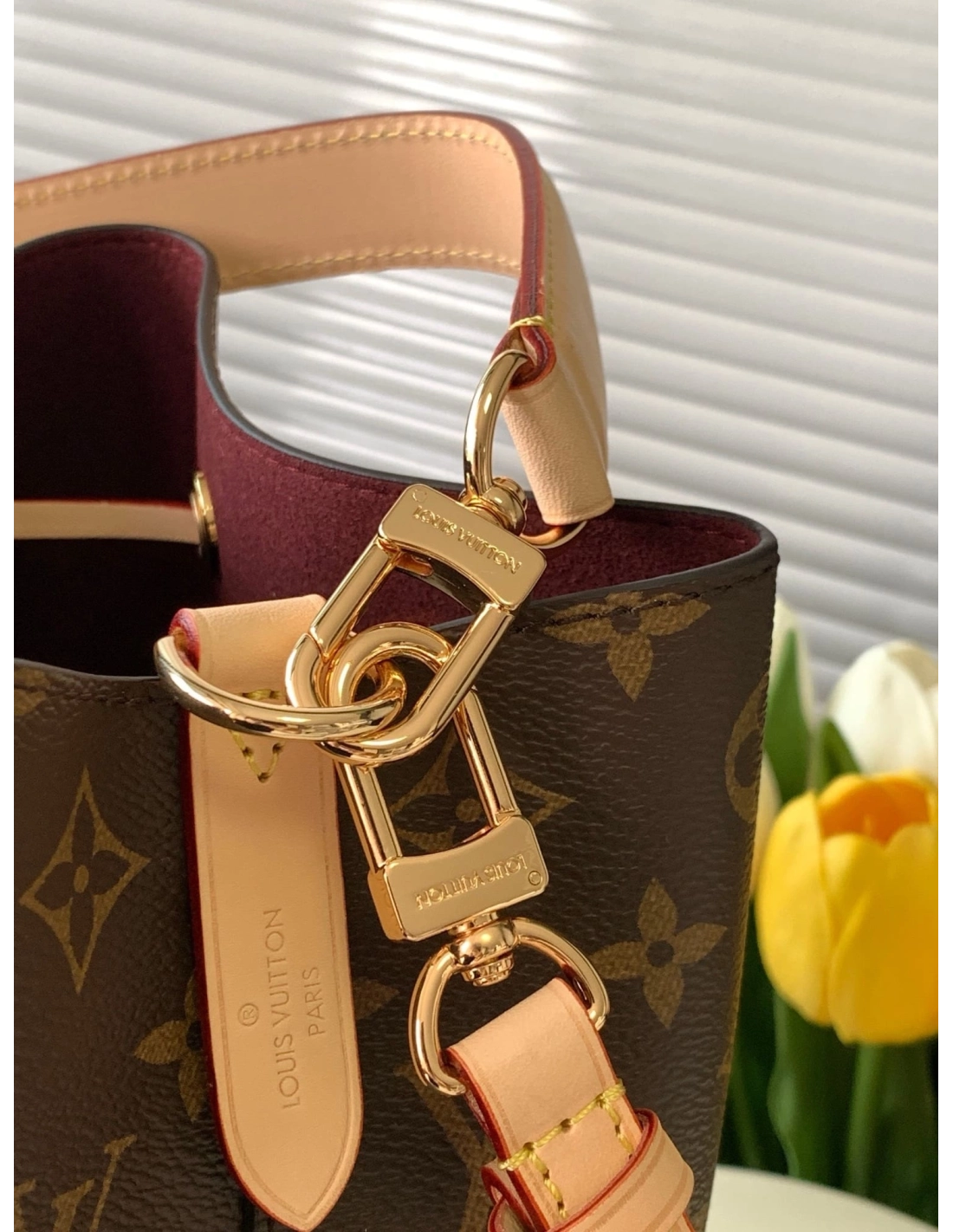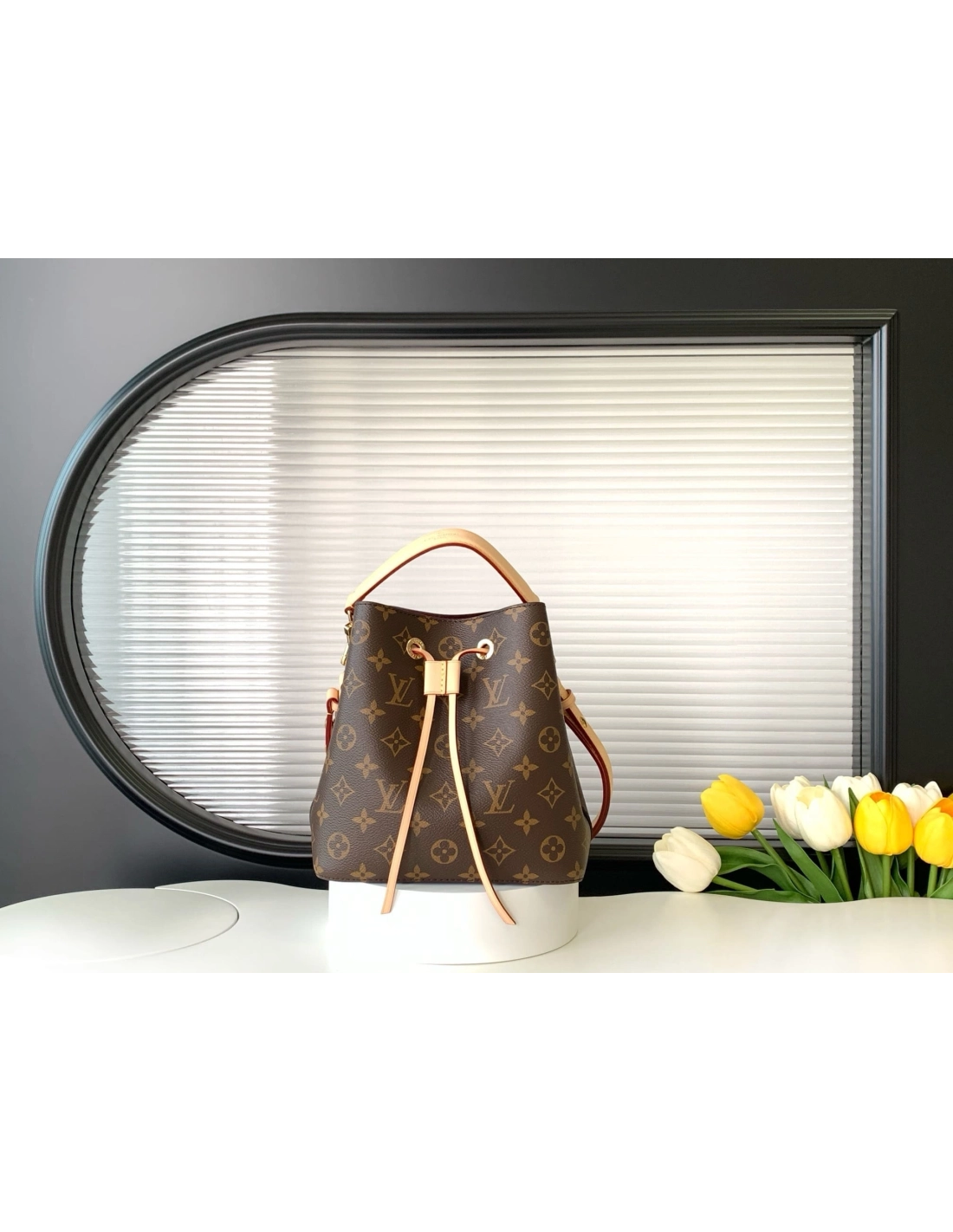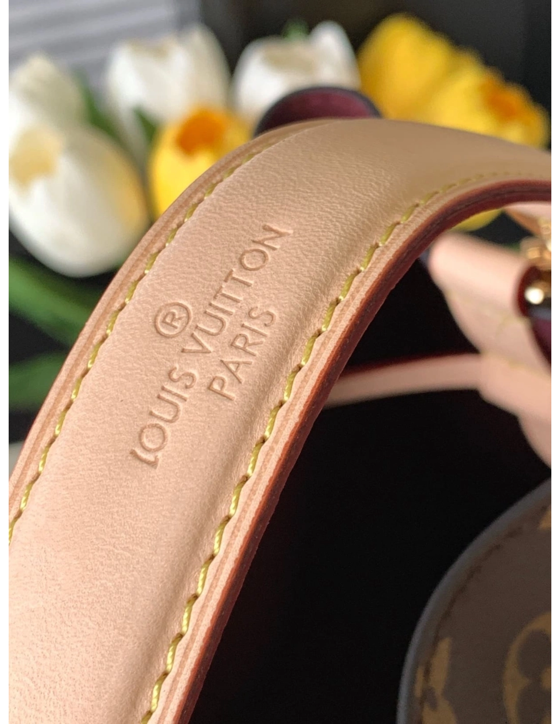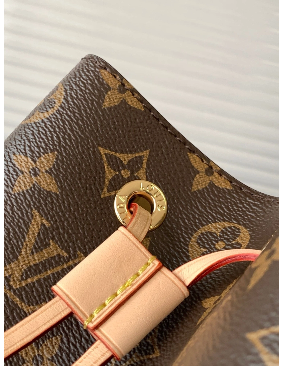 The NeoNoe BB in Monogram canvas with natural leather trim is a smaller interpretation of the Houses iconic NeoNoe bucket bag. Spacious enough to hold essentials such as keys, Airpods, and an iPhone, it features a leather drawstring to close the bag and keep belongings secure. A removable handle and detachable, adjustable strap offer multiple carry options.