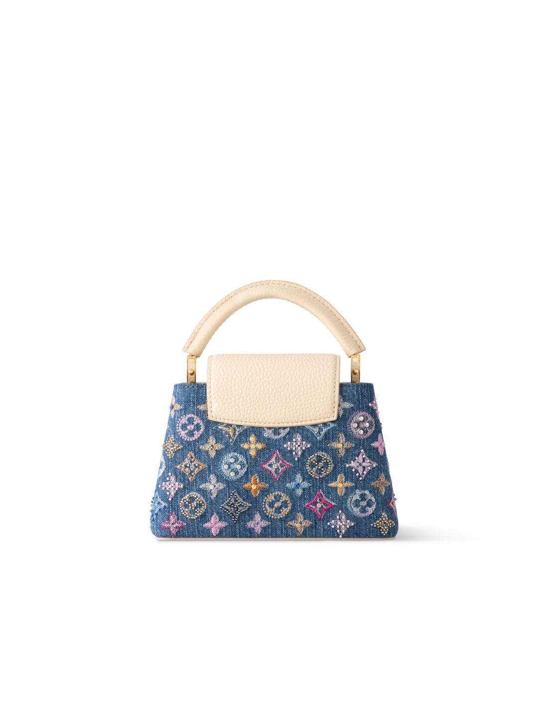 The Capucines Mini bag is reimagined for the season in Monogram denim, embroidered with intricate beads and metallic lurex threads. It is trimmed with contrasting leather and adorned with gold-coloured hardware, including LV Initials and a braided chain. The double carry style opens to reveal a compartmented interior and can be worn multiple ways.
