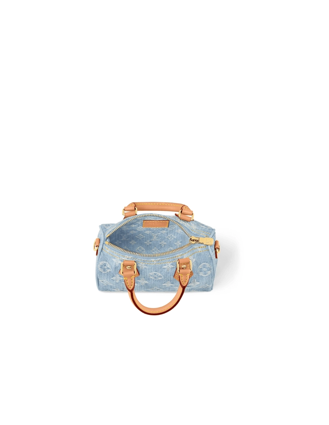 This summery iteration of the Nano Speedy bag comes in pure cotton denim, which is first woven with the Monogram pattern, then bleached and stonewashed to create a fashionable vintage look. The denim is complemented by natural leather with a subtly aged appearance on the bags two handles and removable, adjustable shoulder strap.