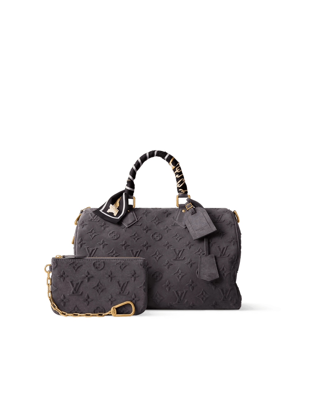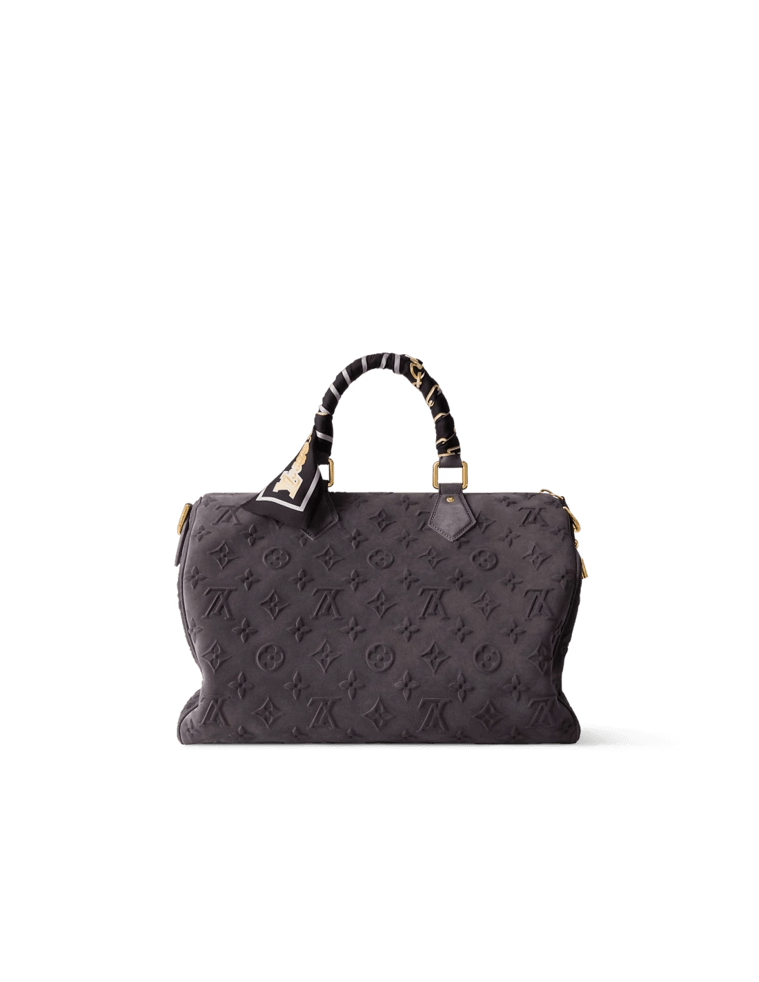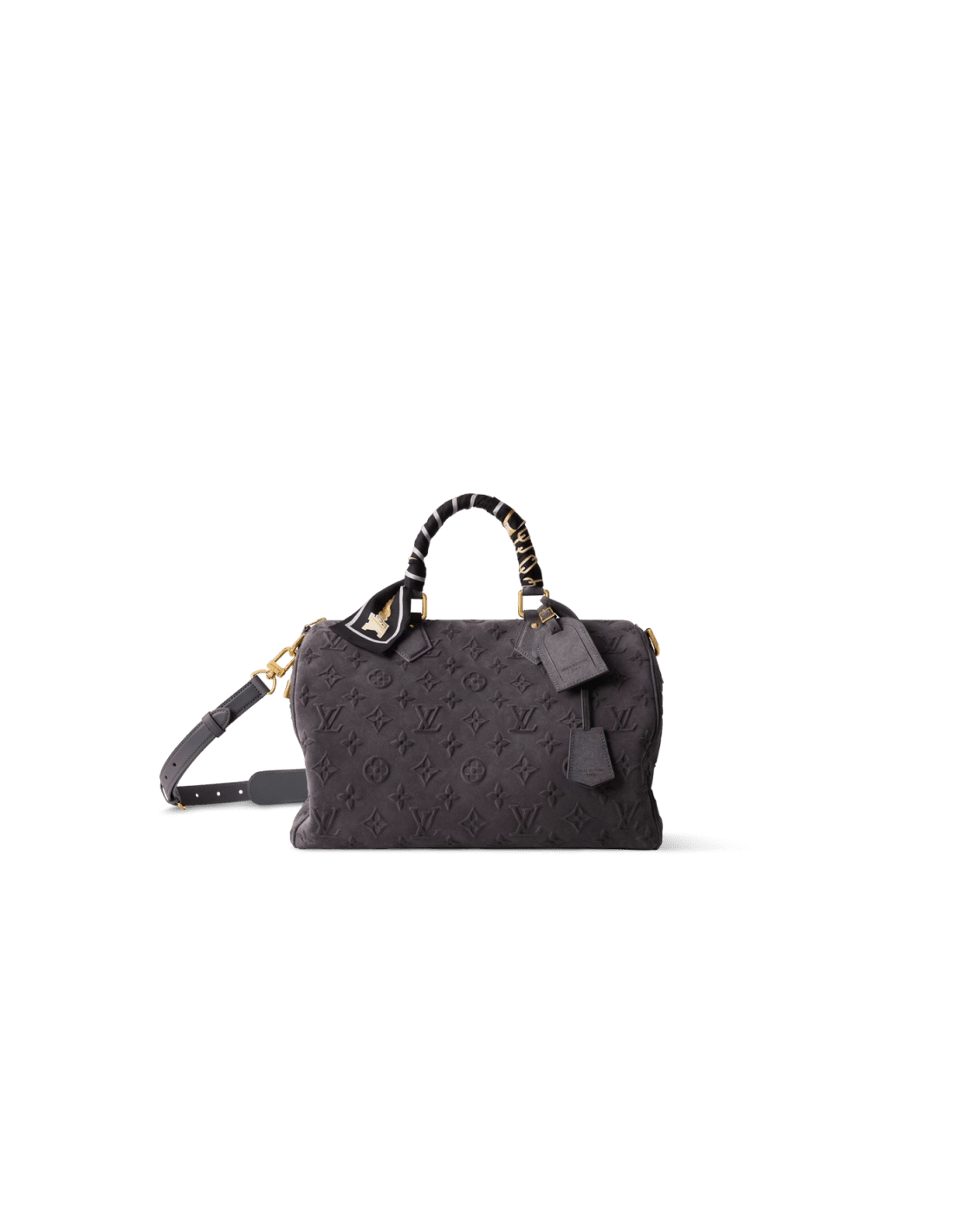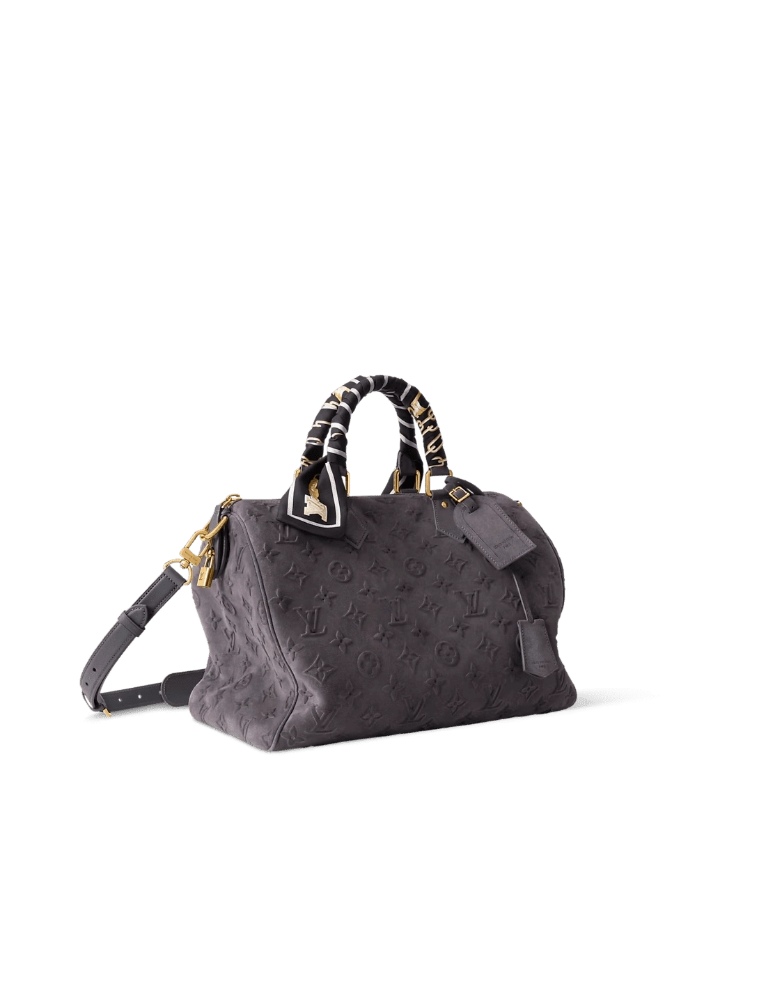 This Speedy P9 Bandouliere 40 bag is crafted from smooth suede leather, embossed with the Monogram flower and LV initials for a rich texture. The included silk scarf allows you to decorate the handles as desired, complementing the elegant hue for a sophisticated look.
