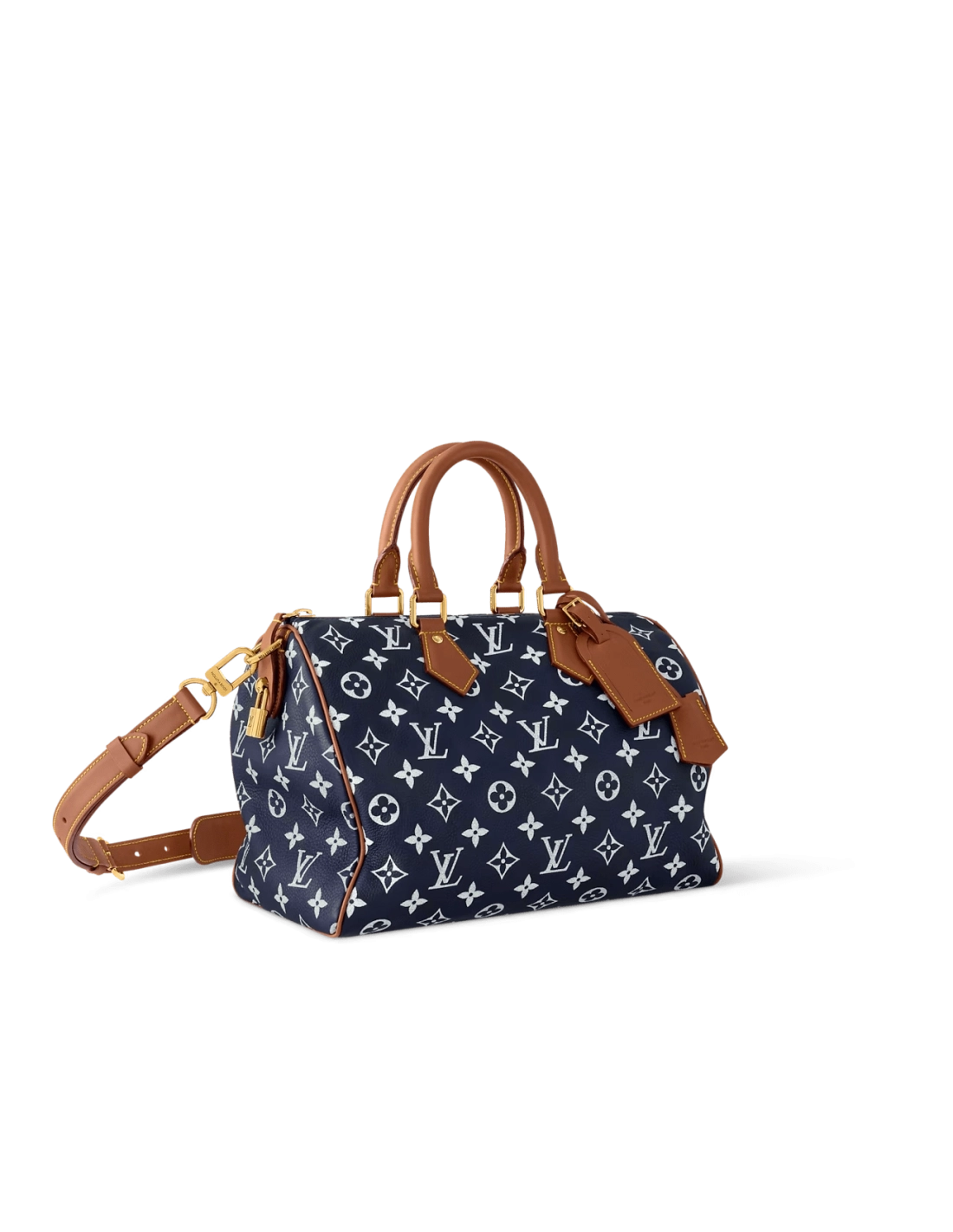 This Speedy P9 Bandouliere 30 bag is fashioned from calfskin in a subtle colorway with the Monogram motif. It is lined with striped lambskin and features a removable pouch and numerous pockets. Details like the lobster embossed on the handle mounts and the golden side lock, engraved with LV Initials, bring a luxurious feel.