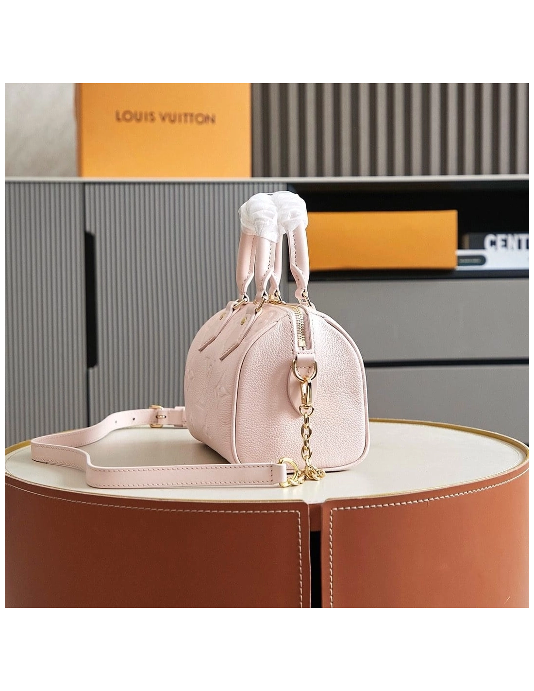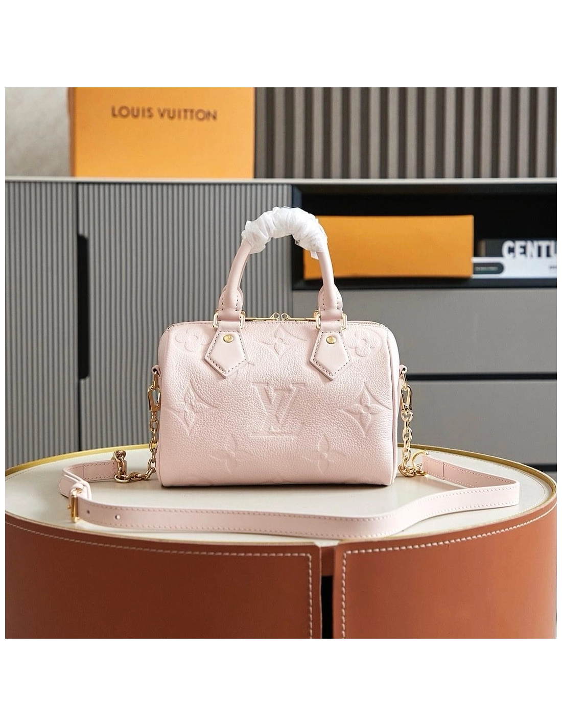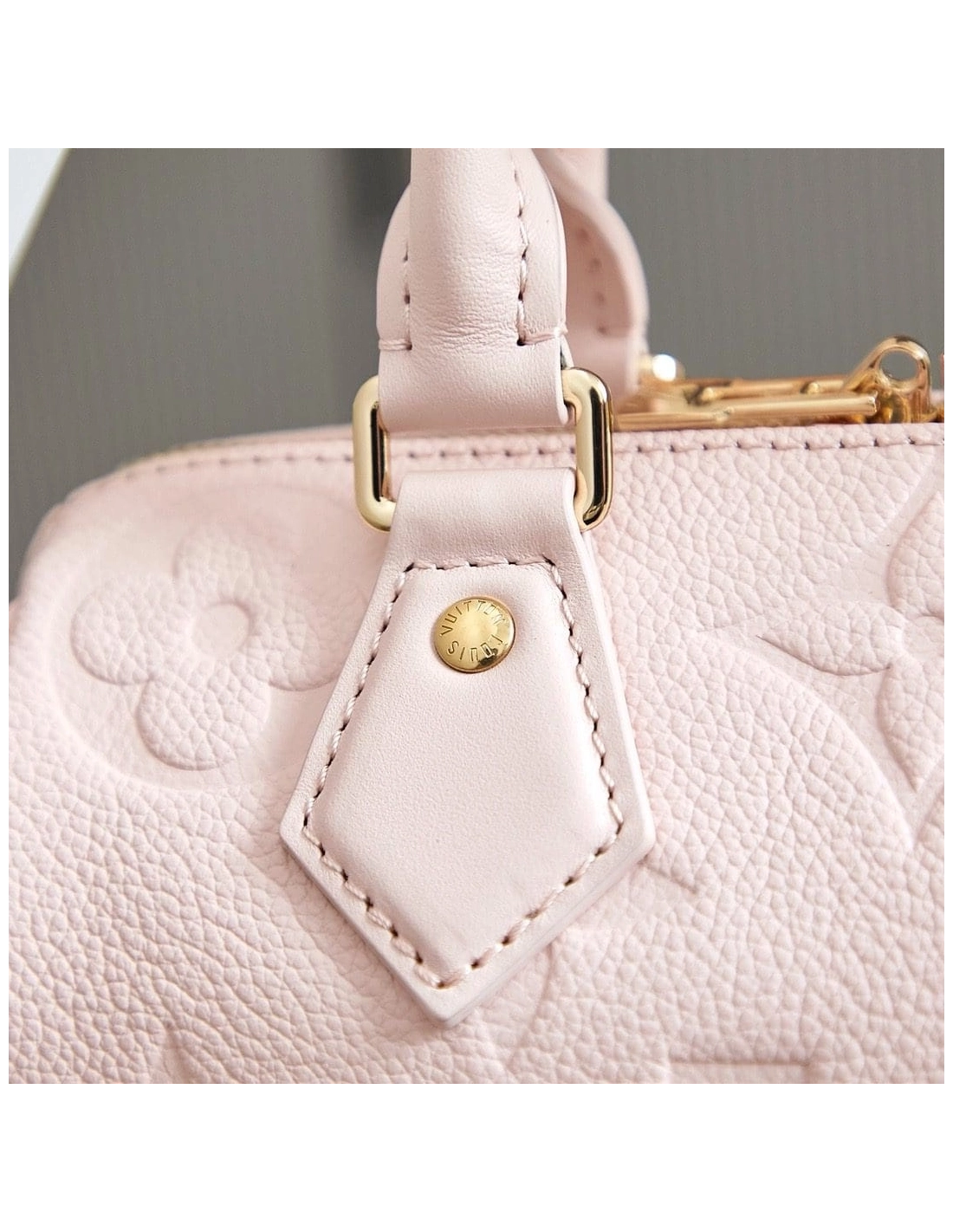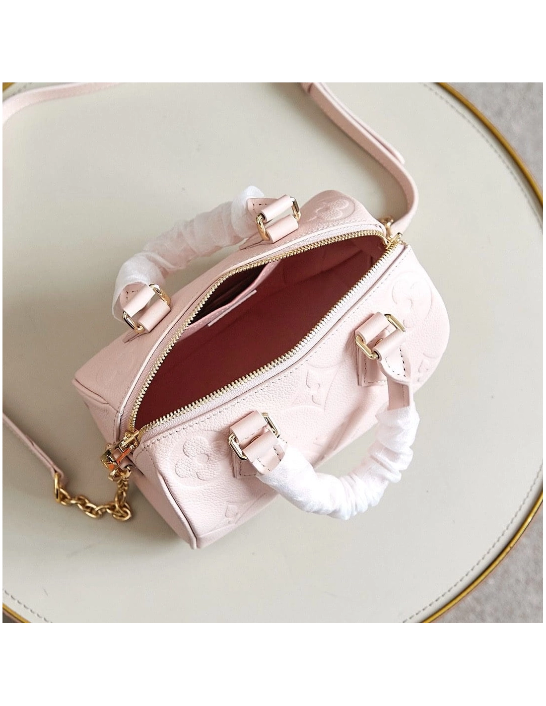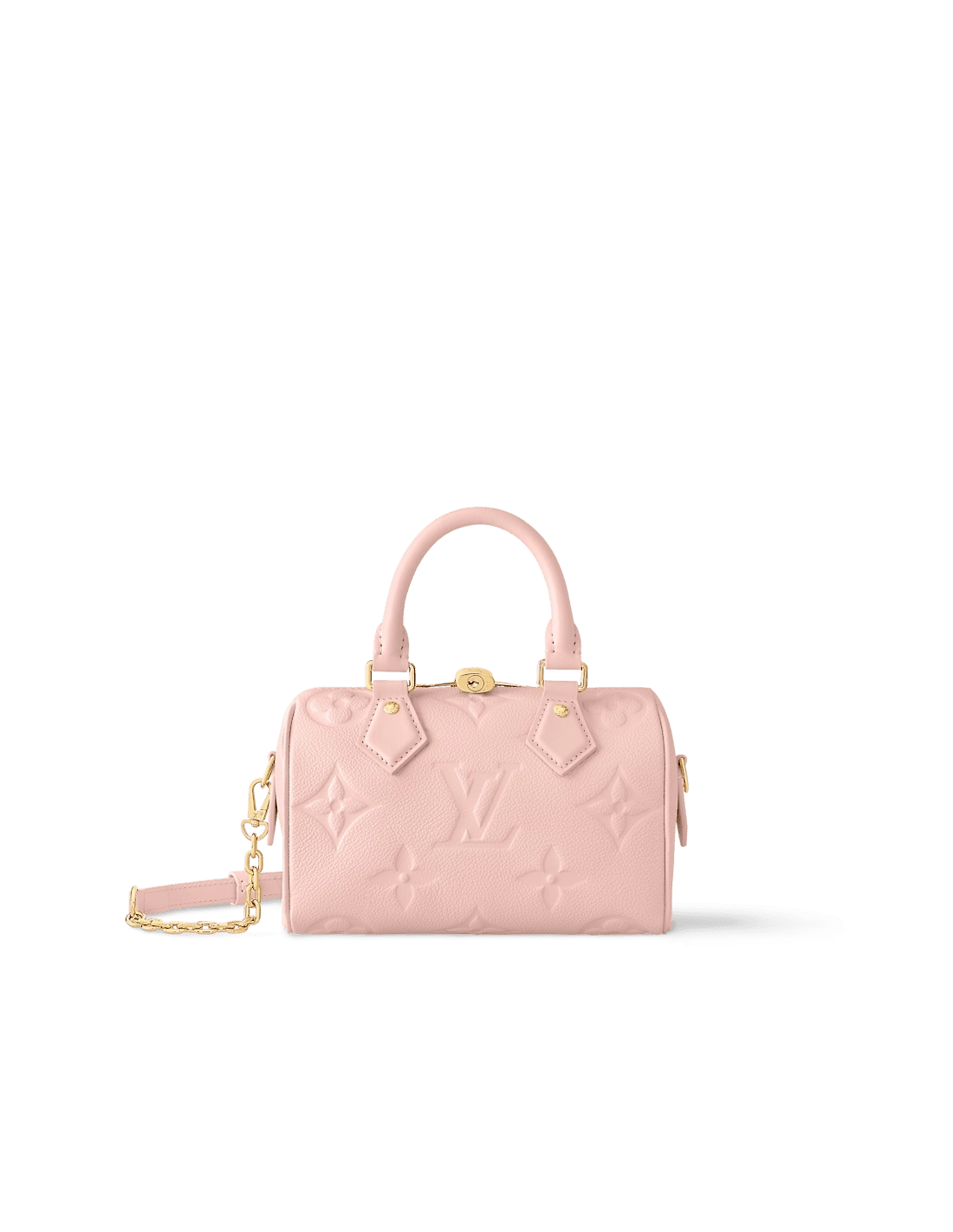 The Speedy 20 Bandouliere handbag is made from Monogram Empreinte leather in a soft pastel colorway. The bags unique shape is inspired by the Houses Speedy travel bag from the 1930s. A removable and adjustable chain-strap enables shoulder wear while the two top handles allow hand carry.