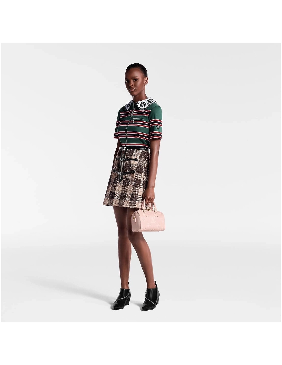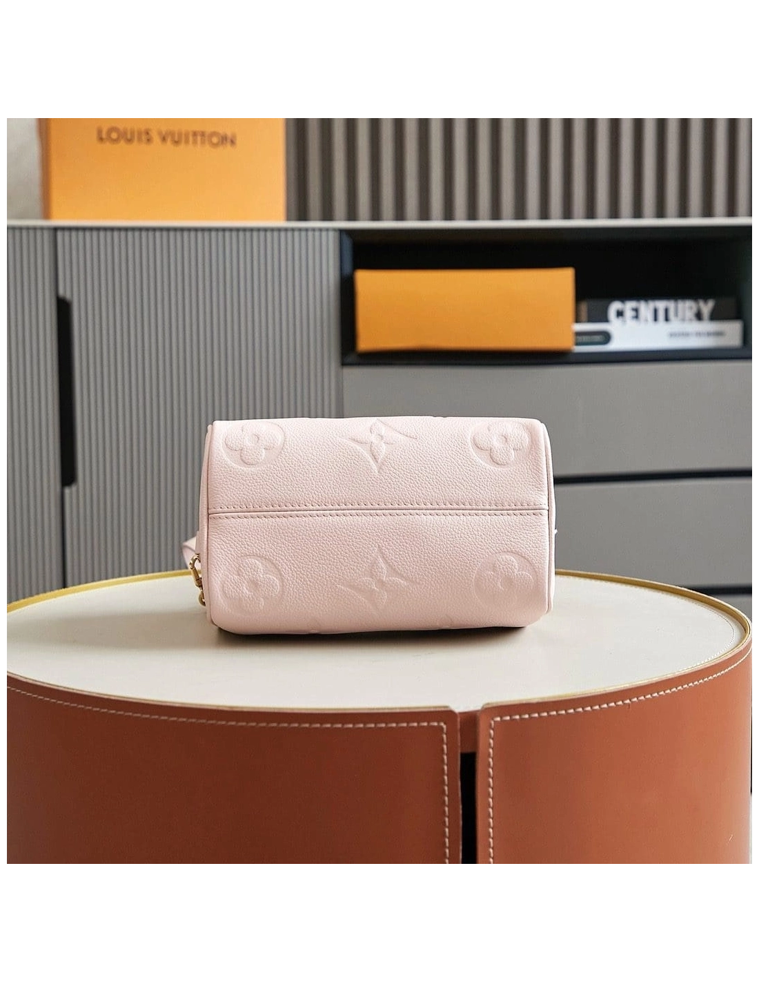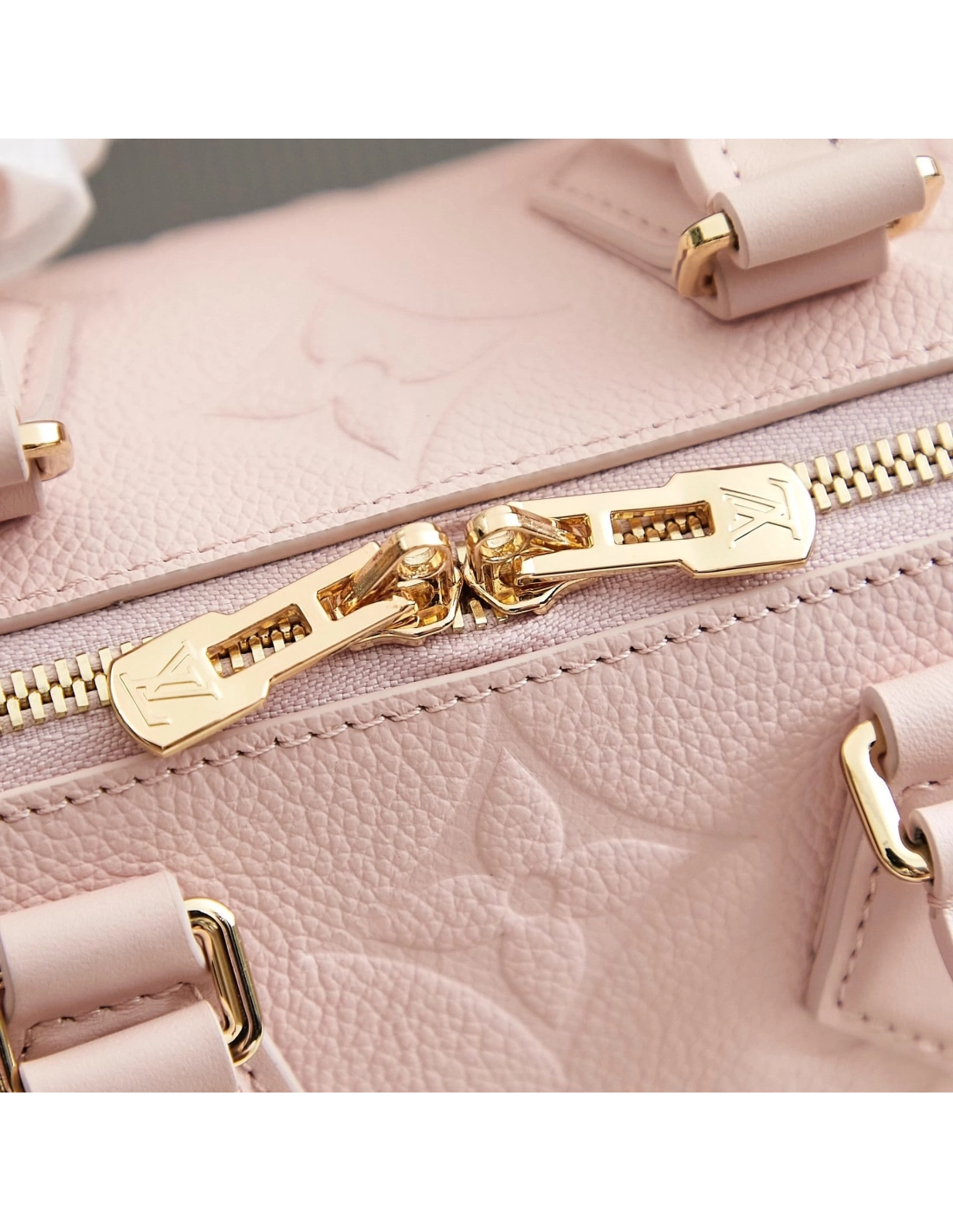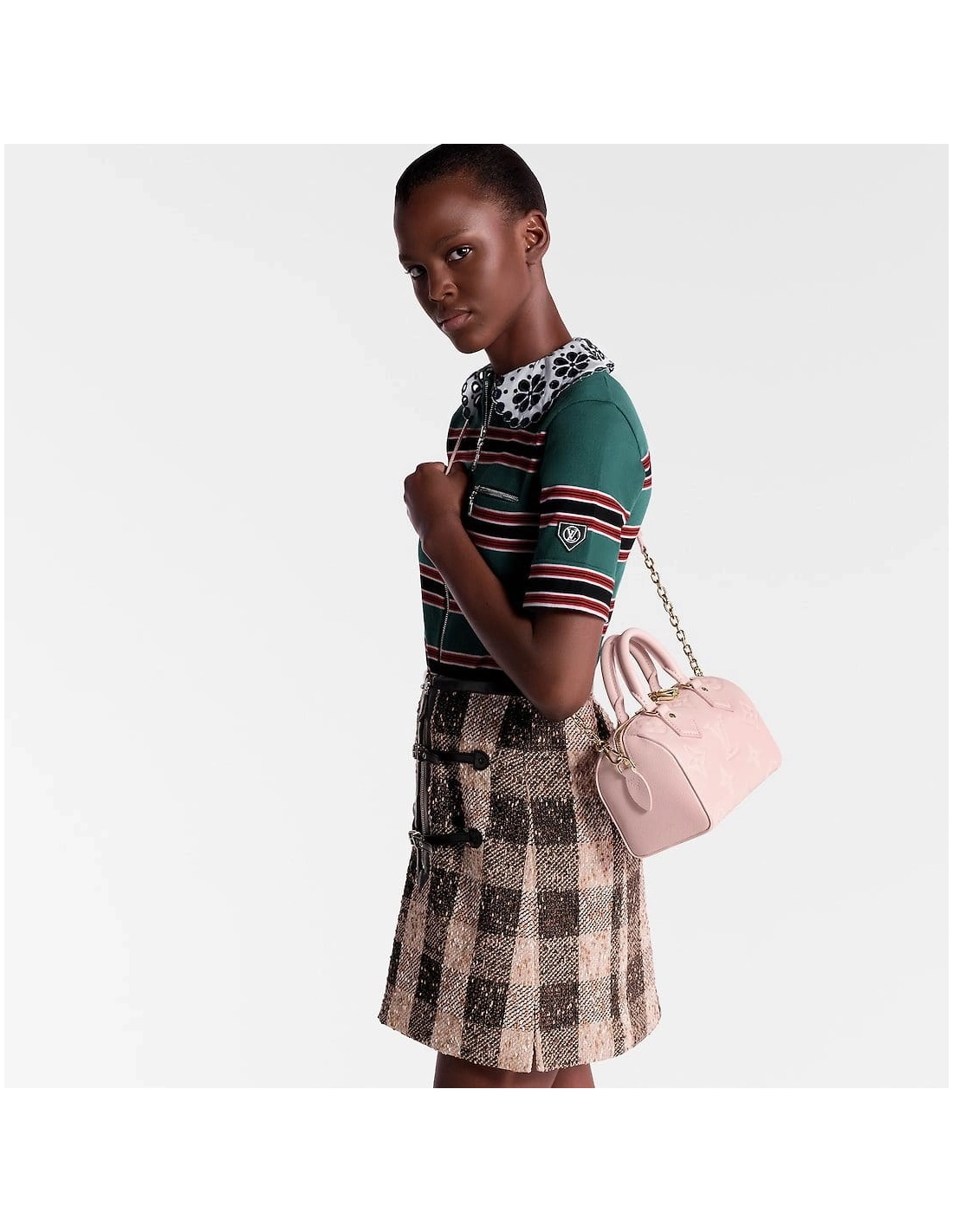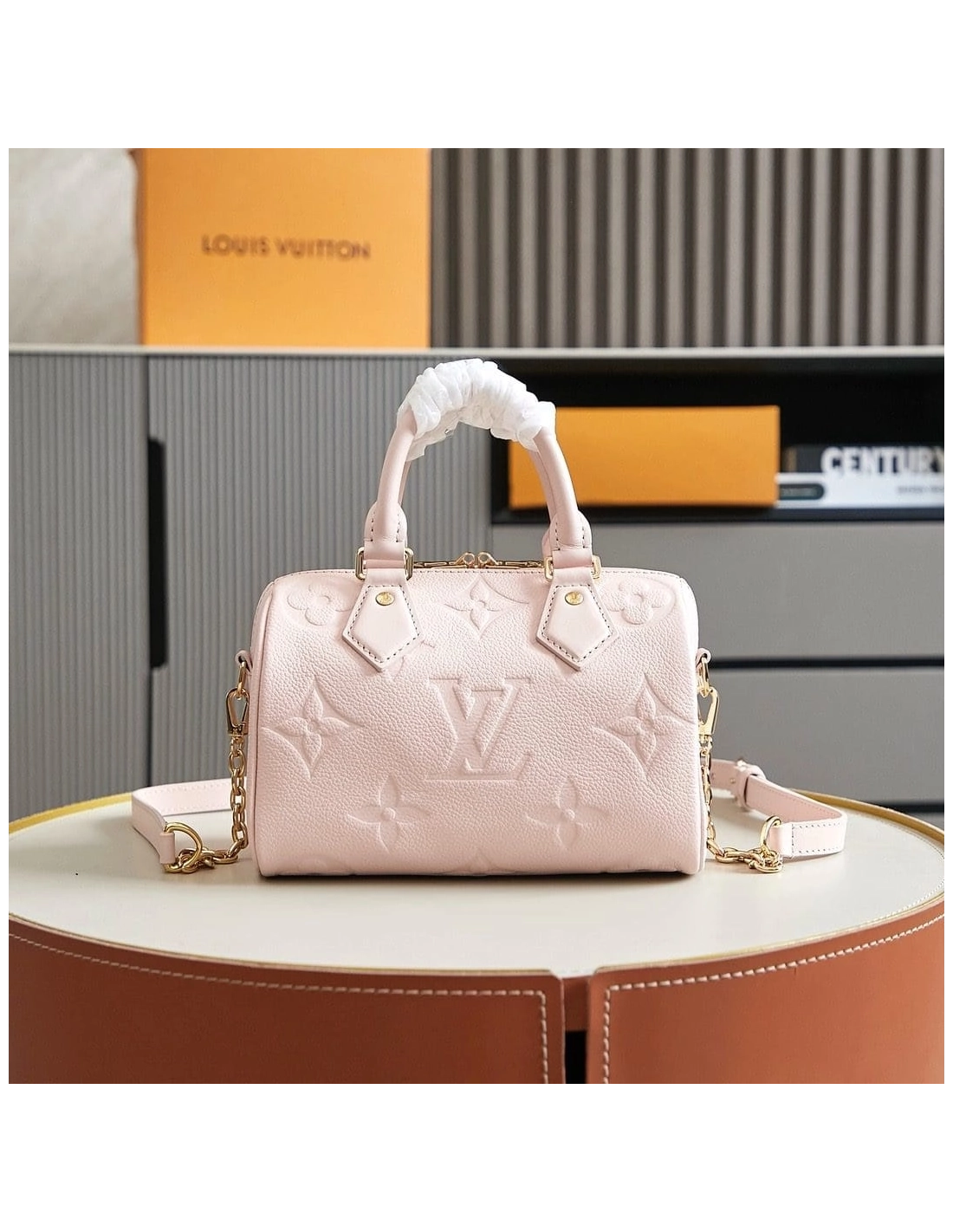 The Speedy 20 Bandouliere handbag is made from Monogram Empreinte leather in a soft pastel colorway. The bags unique shape is inspired by the Houses Speedy travel bag from the 1930s. A removable and adjustable chain-strap enables shoulder wear while the two top handles allow hand carry.