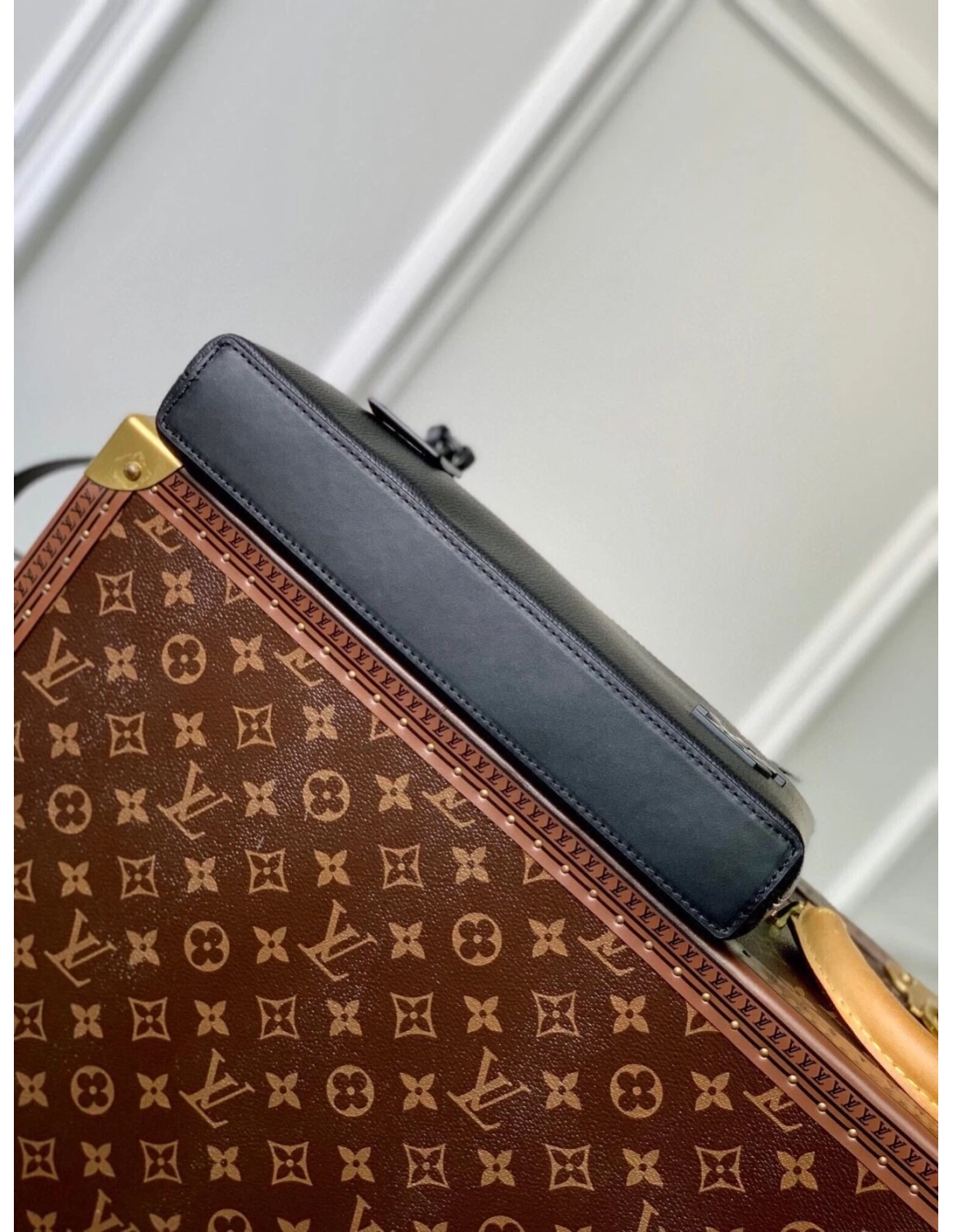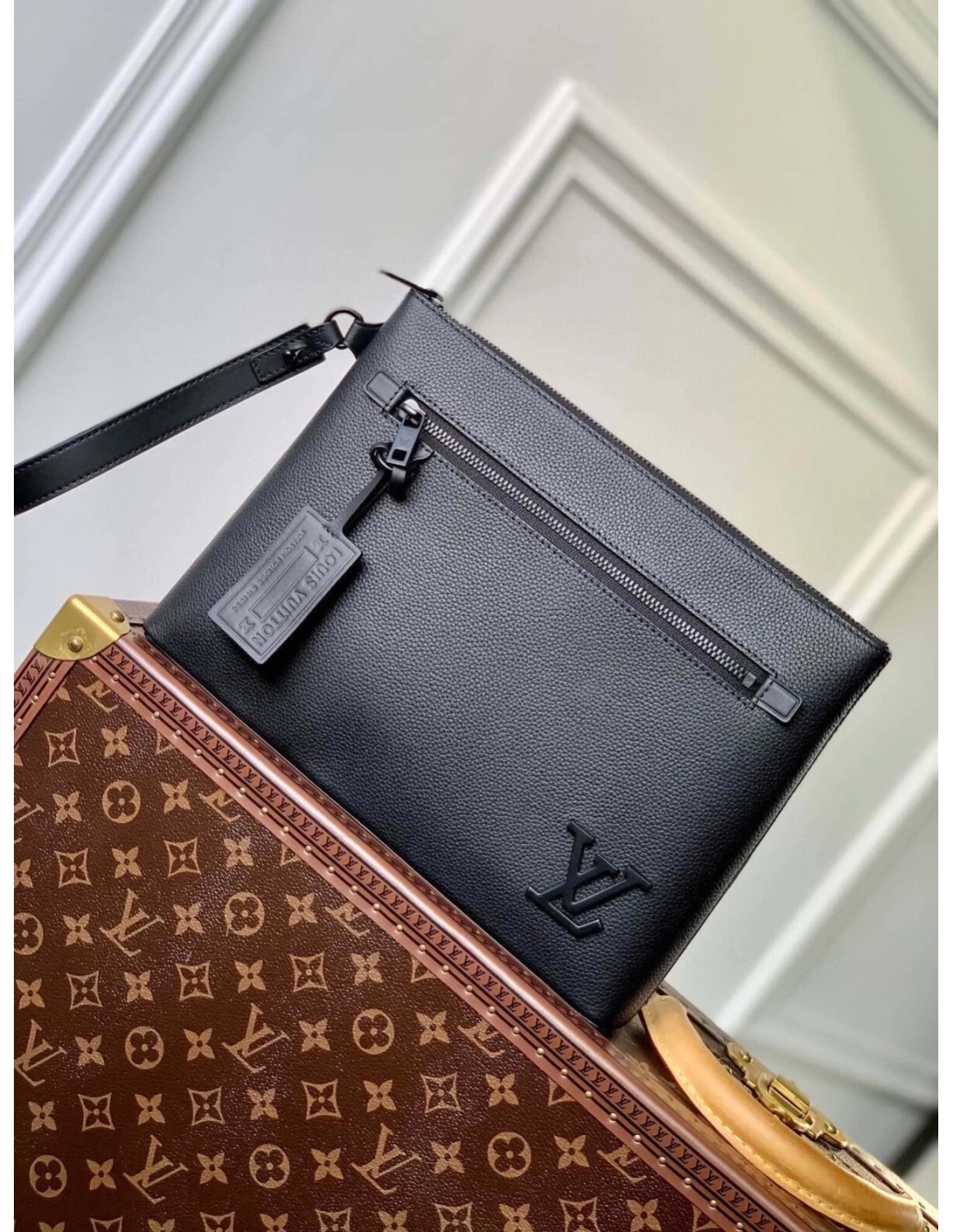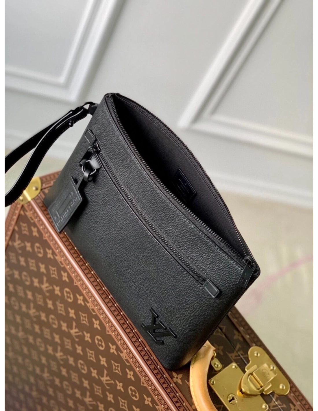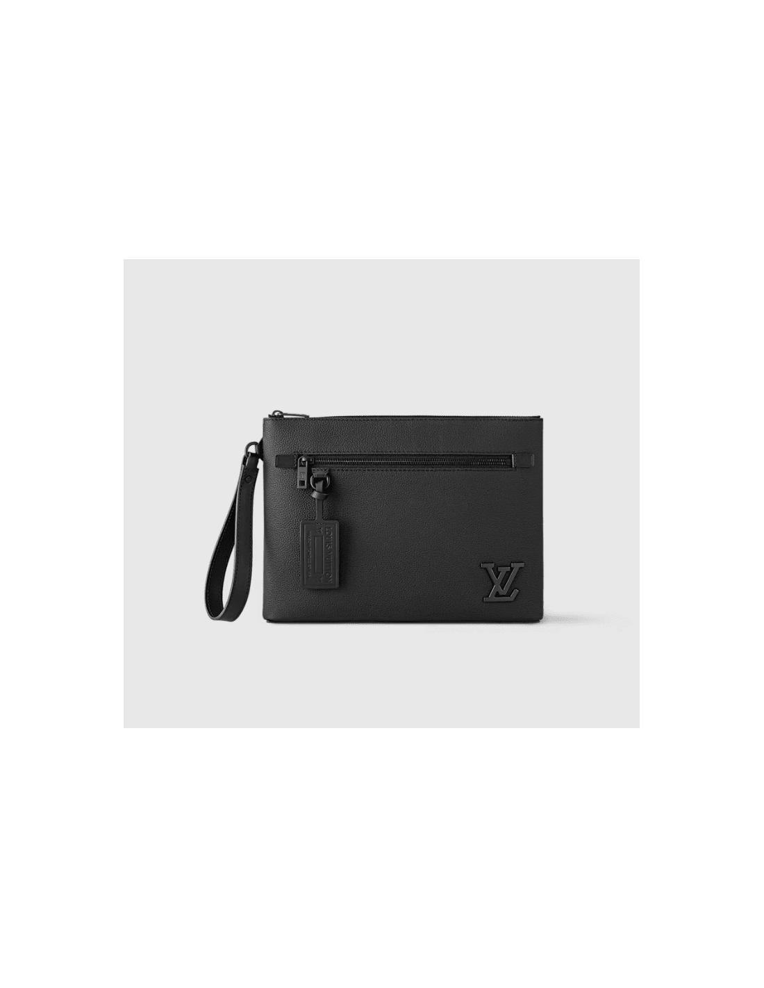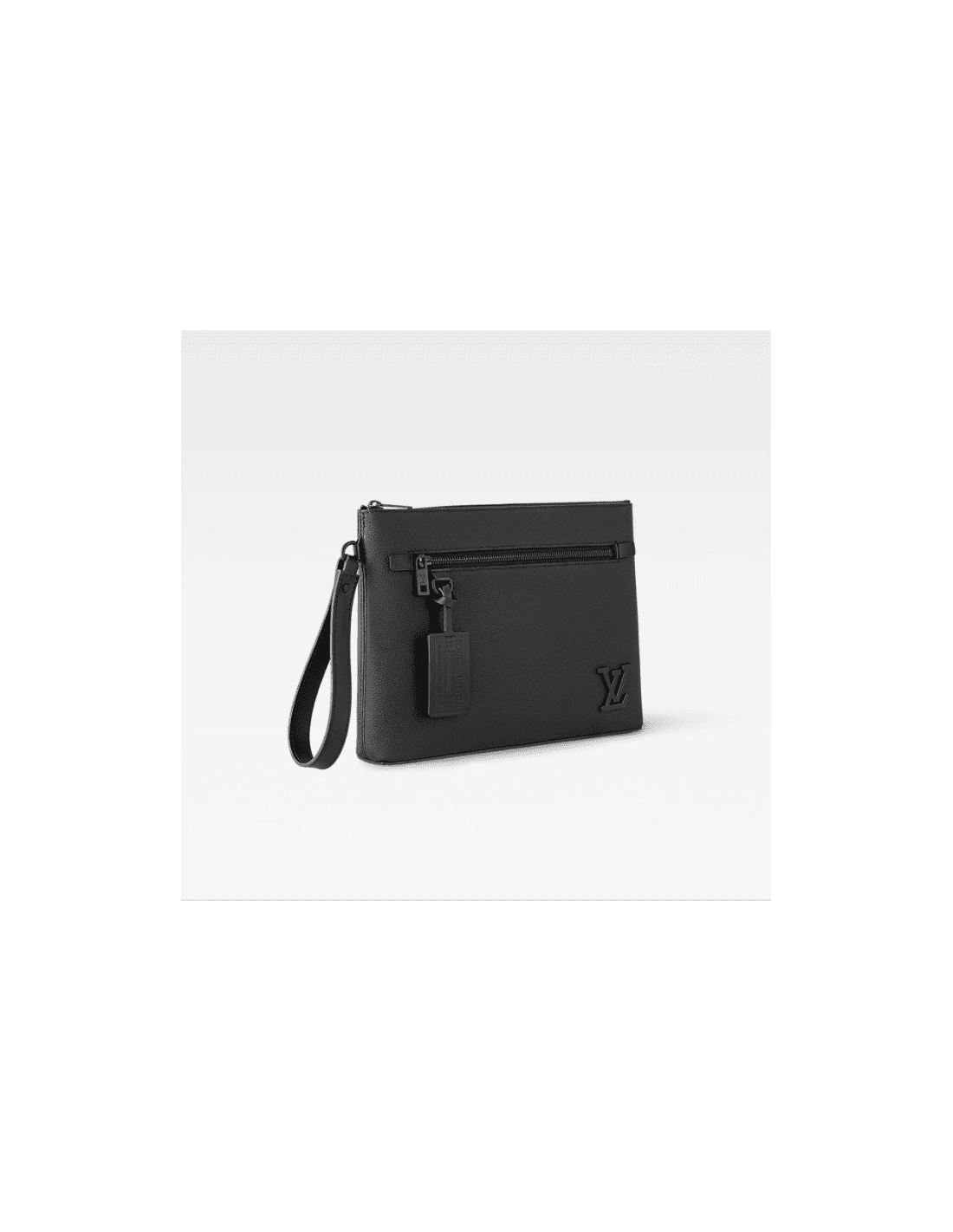 The pared-down design of the LV Aerogram Takeoff Pouch makes it a fashionable and functional accessory. Crafted in fine black calf leather, whose soft, supple feel recalls an old-fashioned aerogram, it features theLV initials in black metal and a customizable tag for an understated signature touch ¨C plus user-friendly extras like a removable leather wristband.
