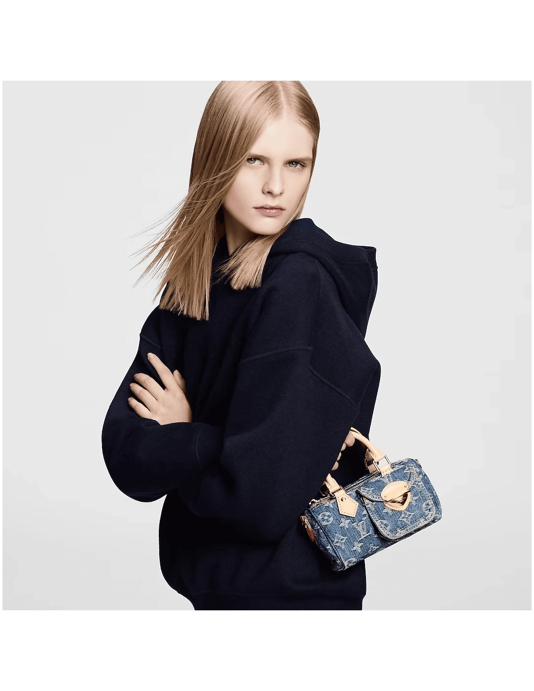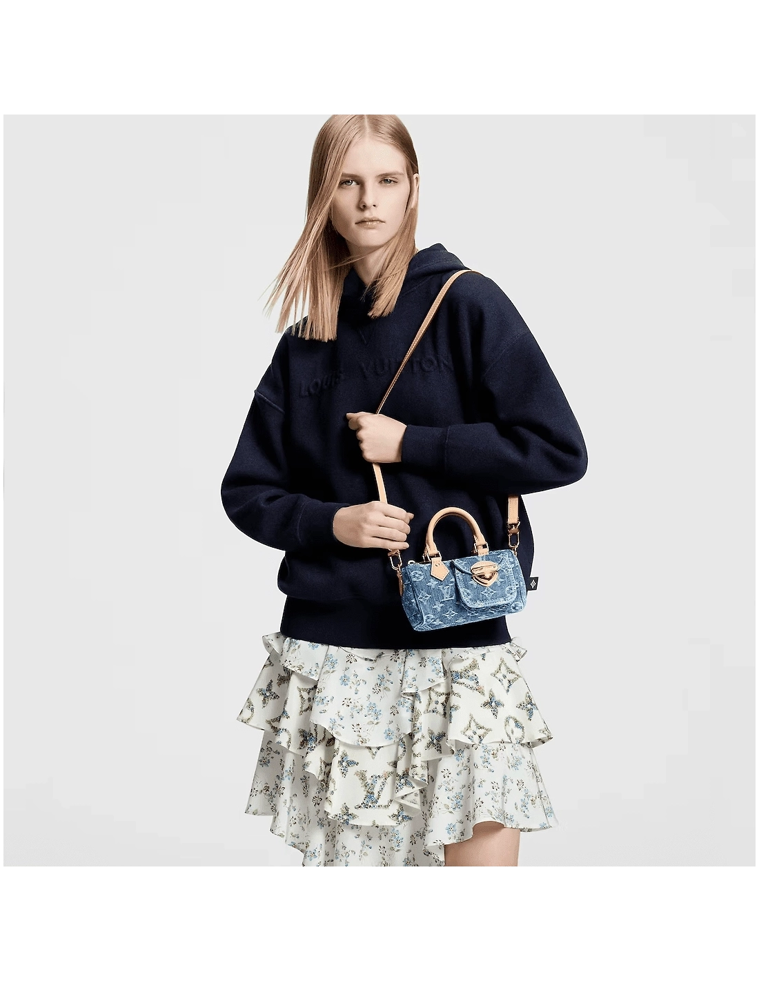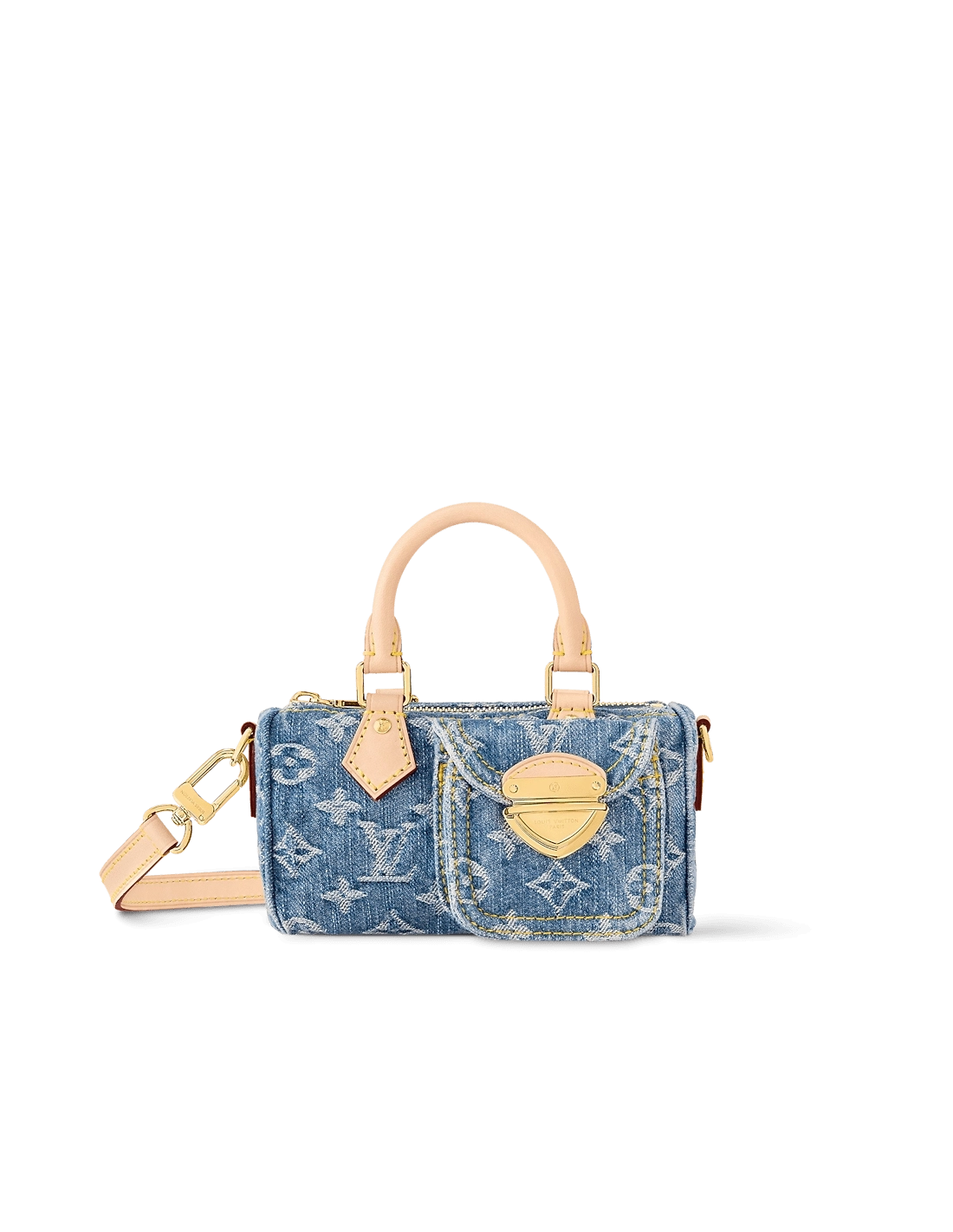 The adorable Speedy Nano handbag is even cuter in stone-washed Monogram Denim with natural leather handles and removable shoulder strap. The denim canvas is made from certified-organic cotton. On the side of the bag is a small pocket that opens and closes with a distinctive tuck lock. The Nano fits an iPhone, compact wallet, and lipstick.