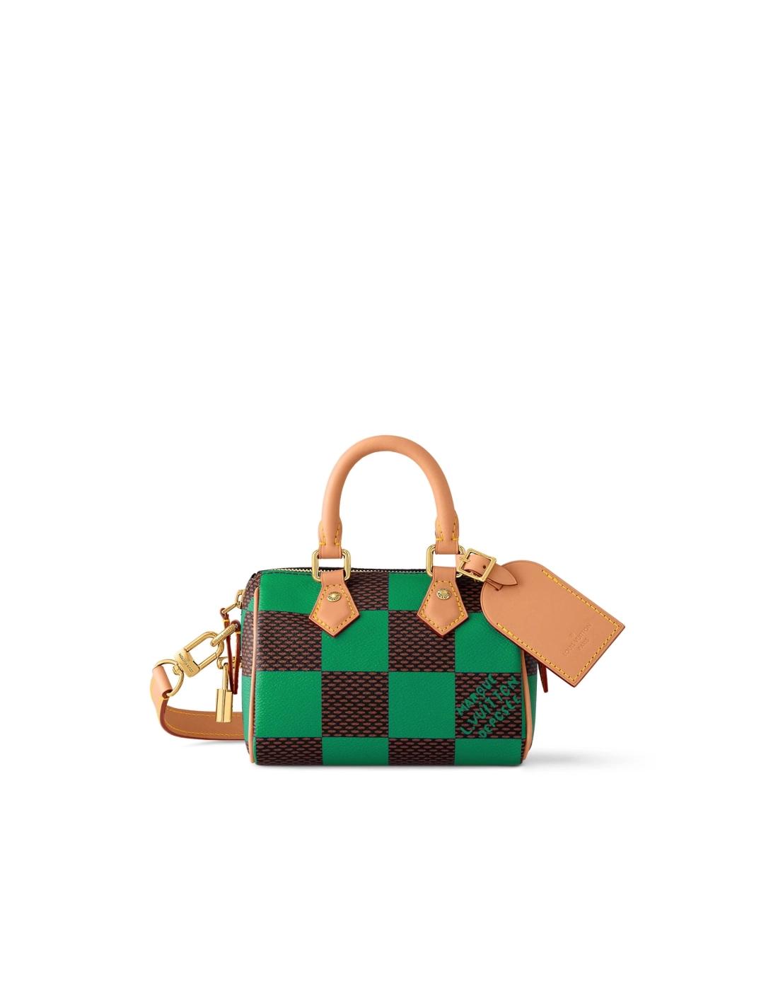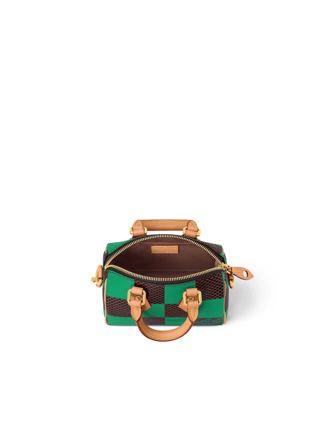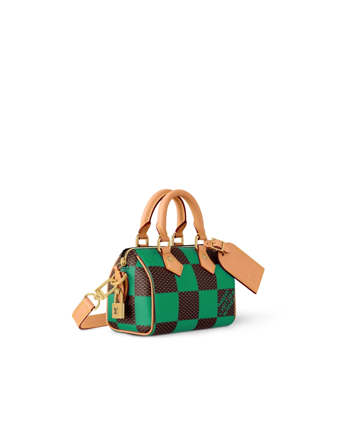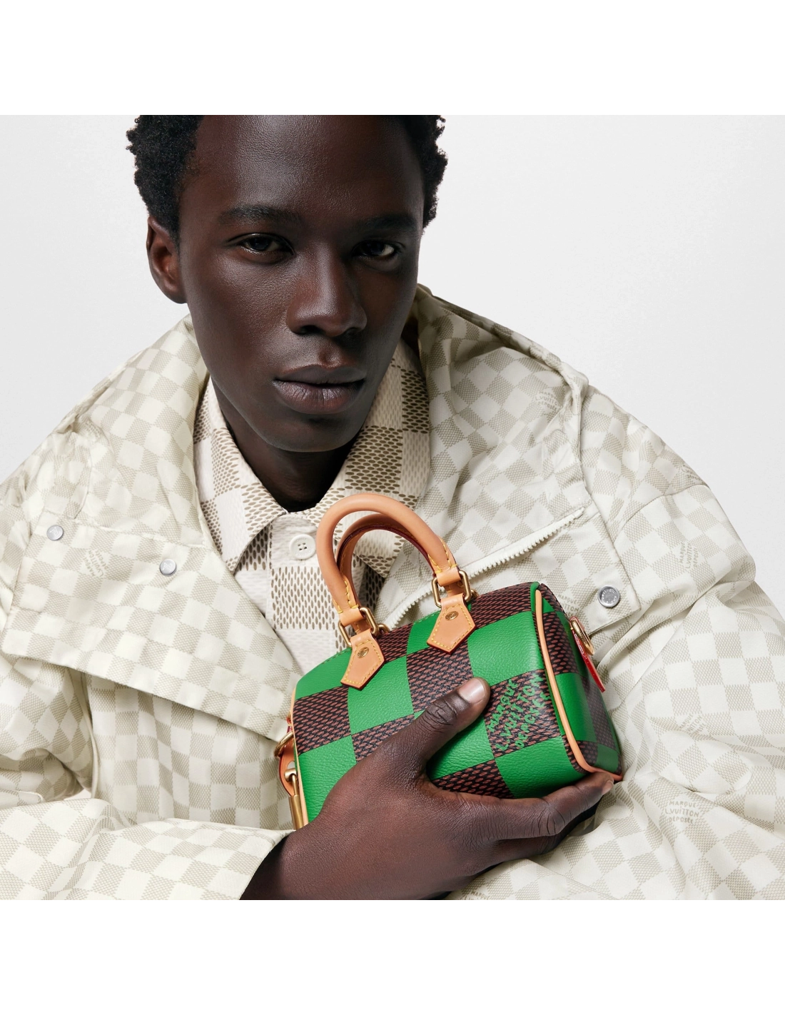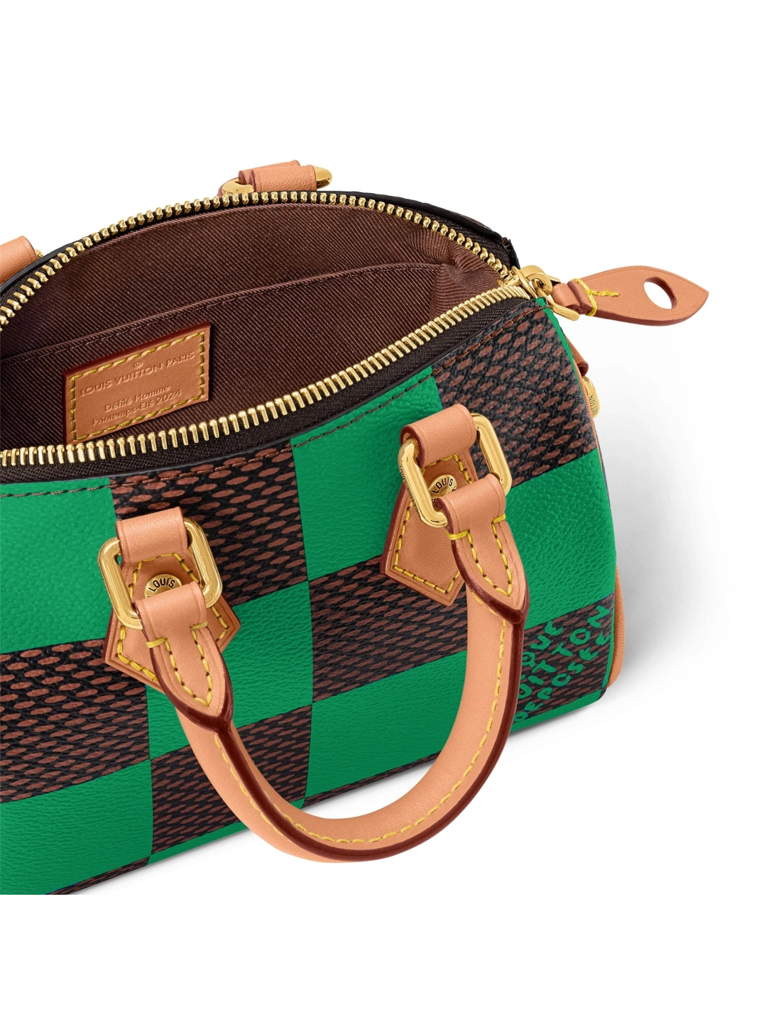 Inspired by the Speedy, a Louis Vuitton bag from the 1930s, the Speedy 18 Bandouliere is a miniature version made from Damier Pop coated canvas. By bringing a bright primary color to the Houses famed Damier checkerboard print, Creative Director Pharrell Williams has produced a canvas that perfectly matches the Speedys iconic lines.
