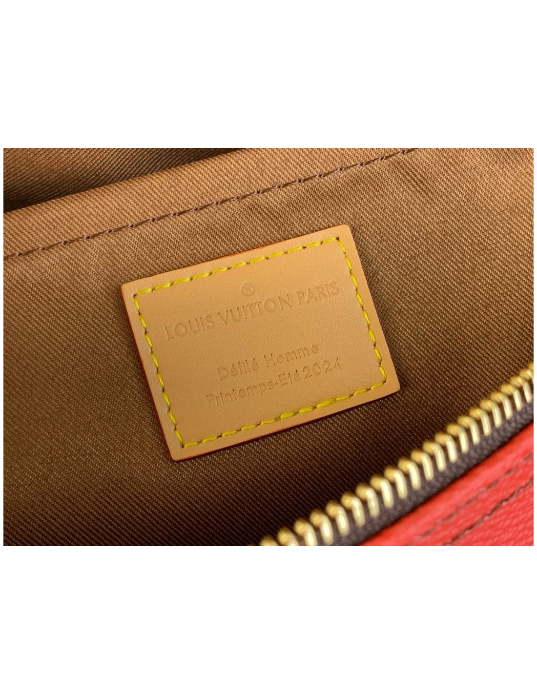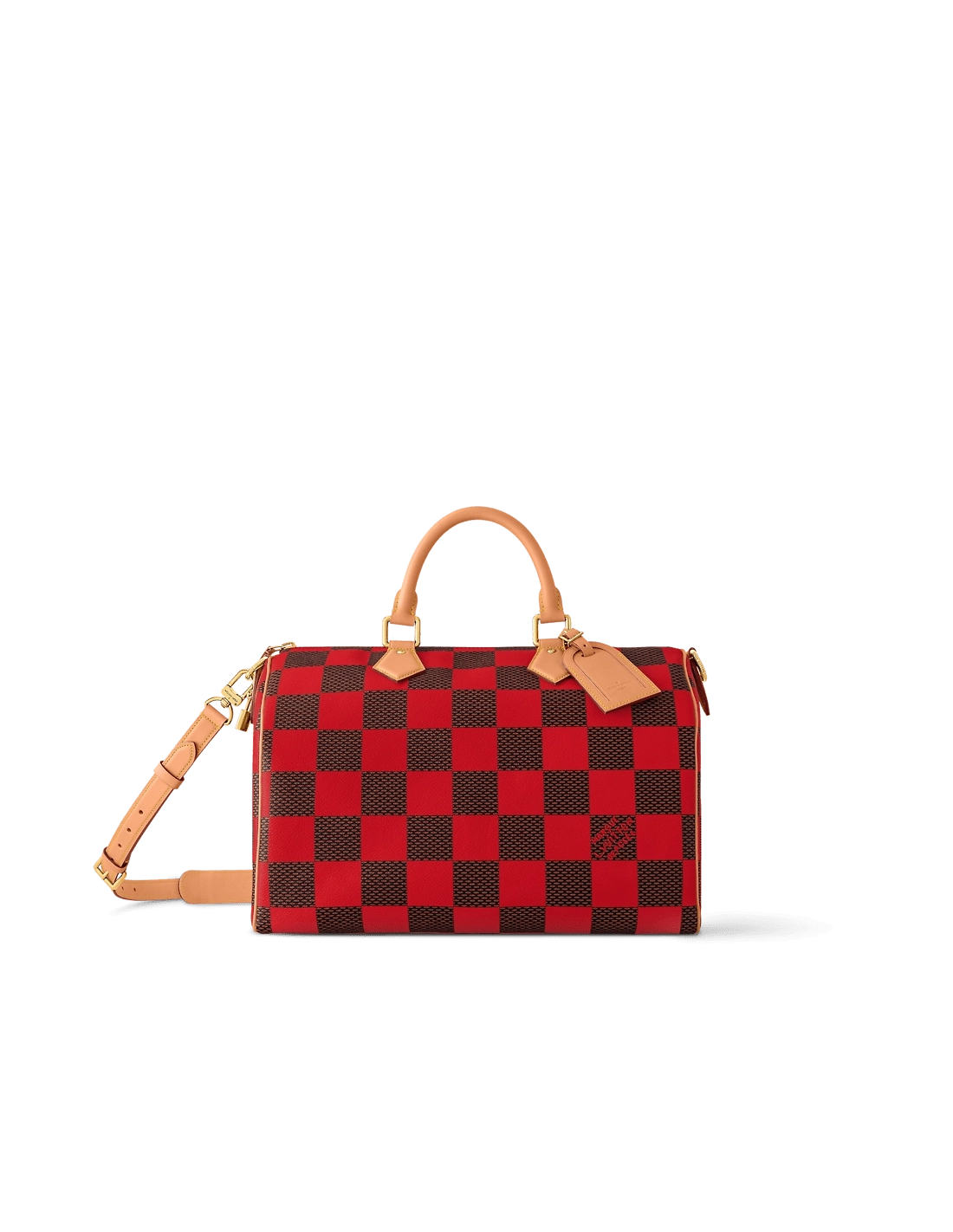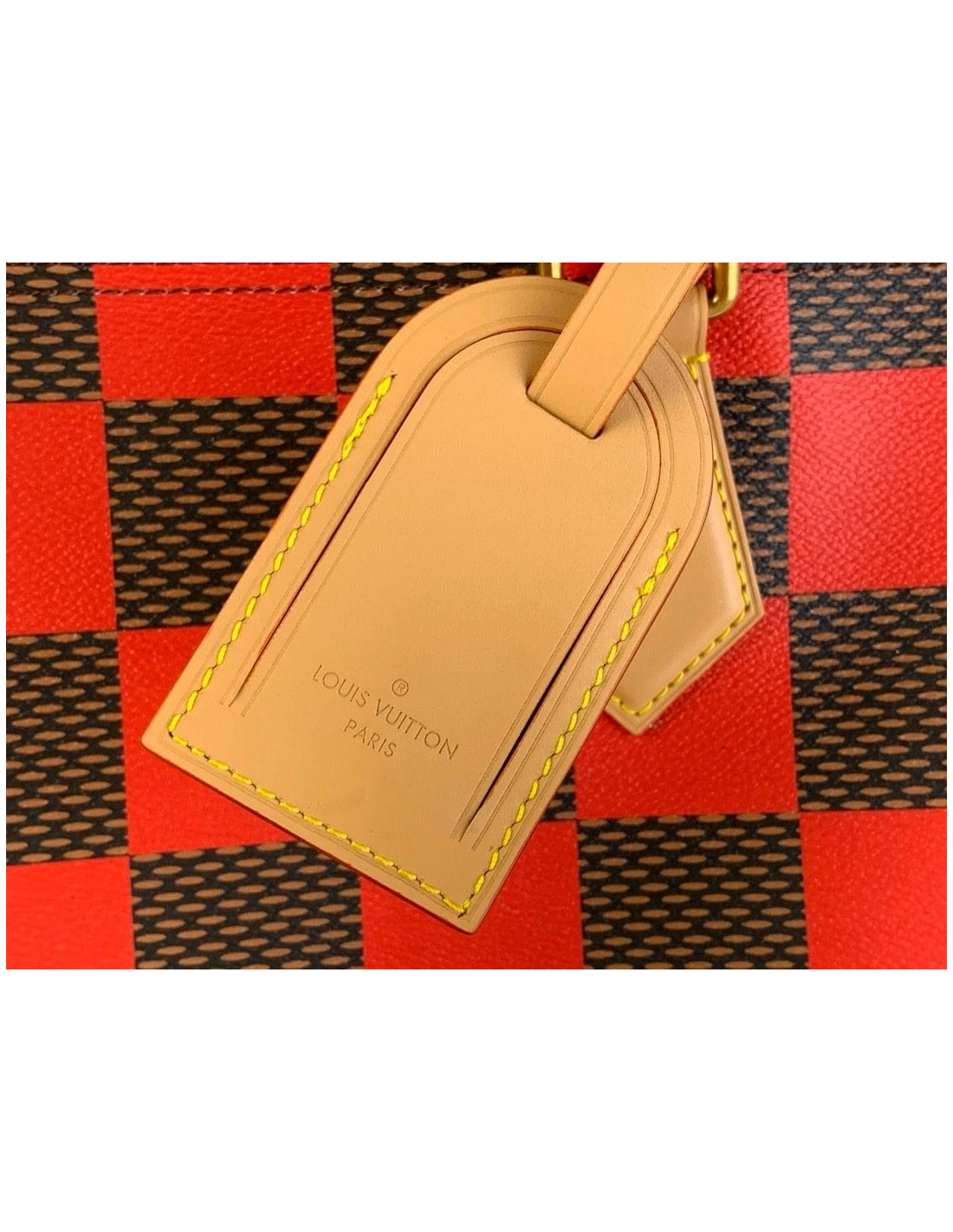This Speedy 40 Bandouliere Damier Pop is made from Damier Pop canvas, Creative Director Pharrell Williams new version of Houses Damier checkerboard. The colorful pattern is combined with natural cowhide leather on the top handles and shoulder strap and polished gold-color hardware, including a padlock. This slightly smaller version of the Speedy is ideal for weekend getaways.