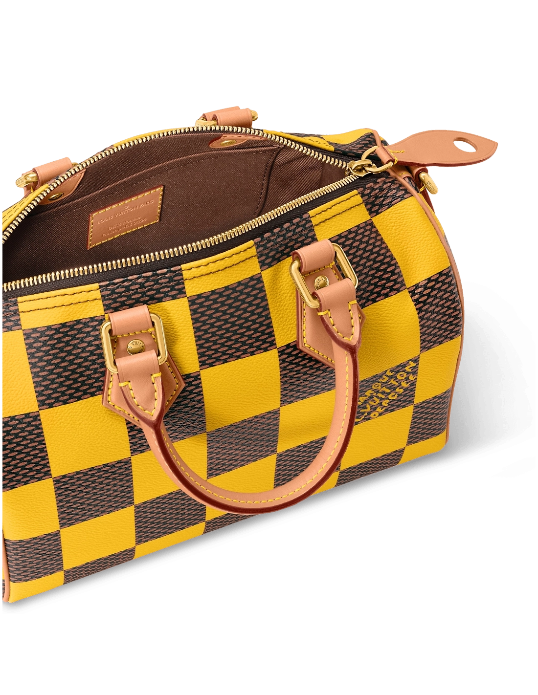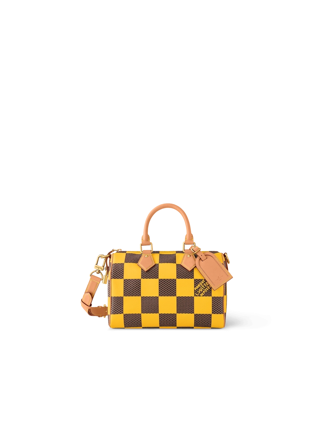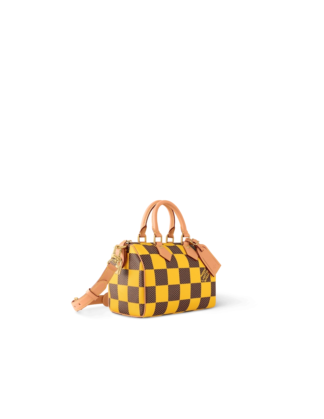 This Speedy 25 Bandouliere Damier Pop displays the same trapezoid lines as the classic Speedy but made from supple Damier Pop coated canvas, the bottom of the bag drapes casually. The new colorway brings a touch of playfulness while the natural cowhide-leather trim and polished gold-color hardware pay homage to the Houses classic bags.