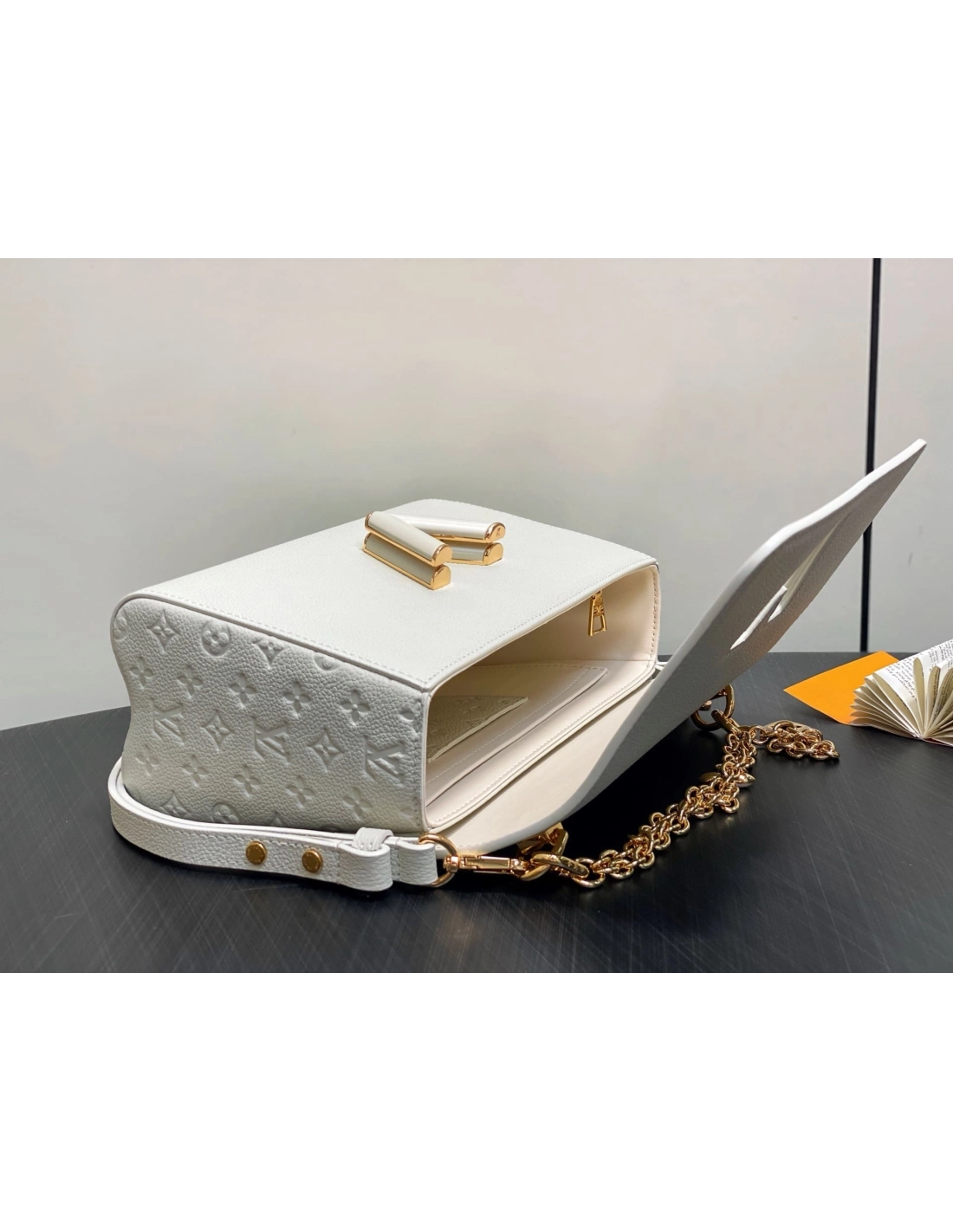 The Harmony collection reimagines the Twist MM Slim with a decorative chain, inspired by Monogram Flowers and the Puffygram jewelry line. Embellished with an LV Twist lock, this edition is crafted from Taurillon leather in a timeless colorway, elevated with a hint of pink for a playful finish. Use the removable mirror for makeup touch-ups.