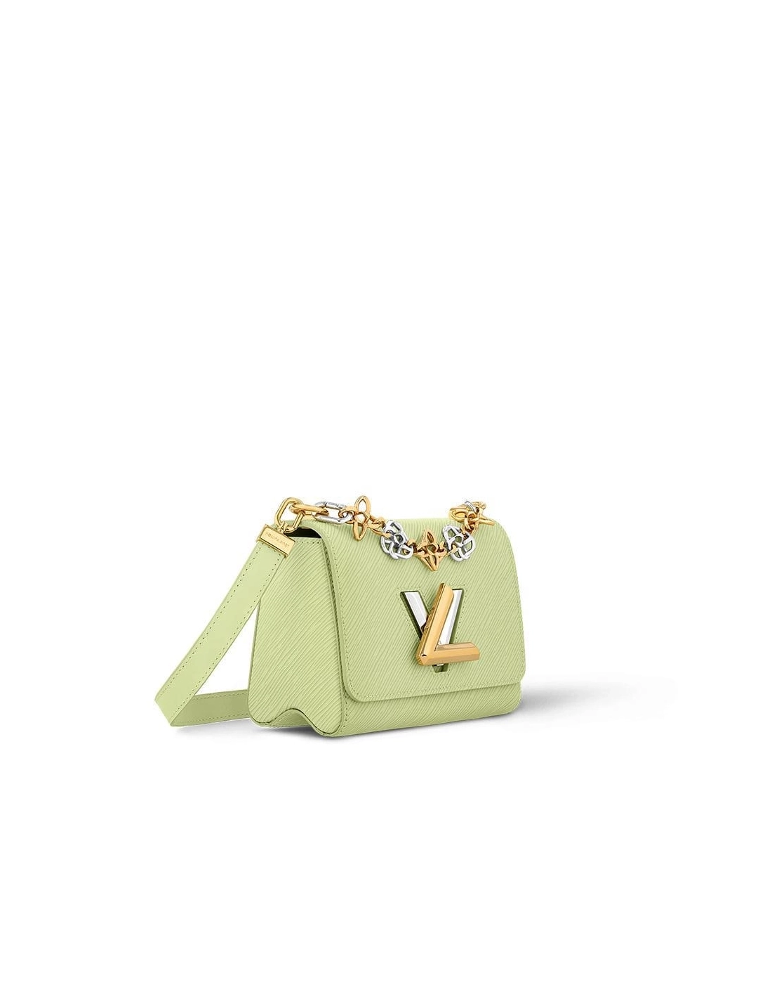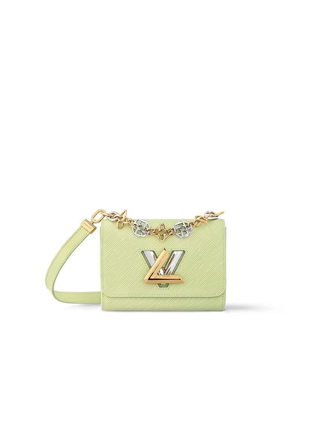 This Twist PM handbag features a gold-and-silver-color chain, adorned with Monogram Flowers delicately twisted so that they become links in the chain. The chain can function as a decorative accessory or be attached to the removable shoulder strap to enable cross-body carry. The signature LV Twist lock also a gold and silver color.