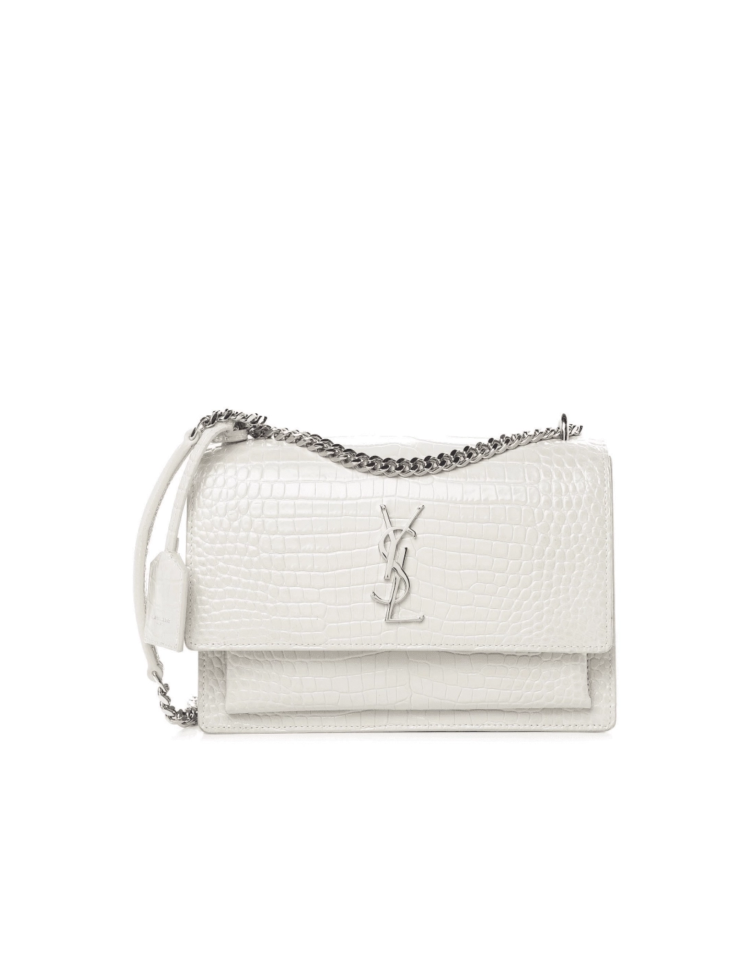 This is SAINT LAURENT Calfskin Crocodile Embossed Medium Monogram Sunset in Icy White. This stylish shoulder bag is crafted of croc embossed calfskin leather in off white. The bag features a polished silver chain link shoulder strap with a leather shoulder pad, a front facing flap with a signature silver YSL logo, gusseted sides and both an interior and exterior pocket. This fold over bag is complete with magnetic snap that opens to a beige partitioned interior with a patch pocket. This is an ideal bag for any occasion, only from Saint Laurent!