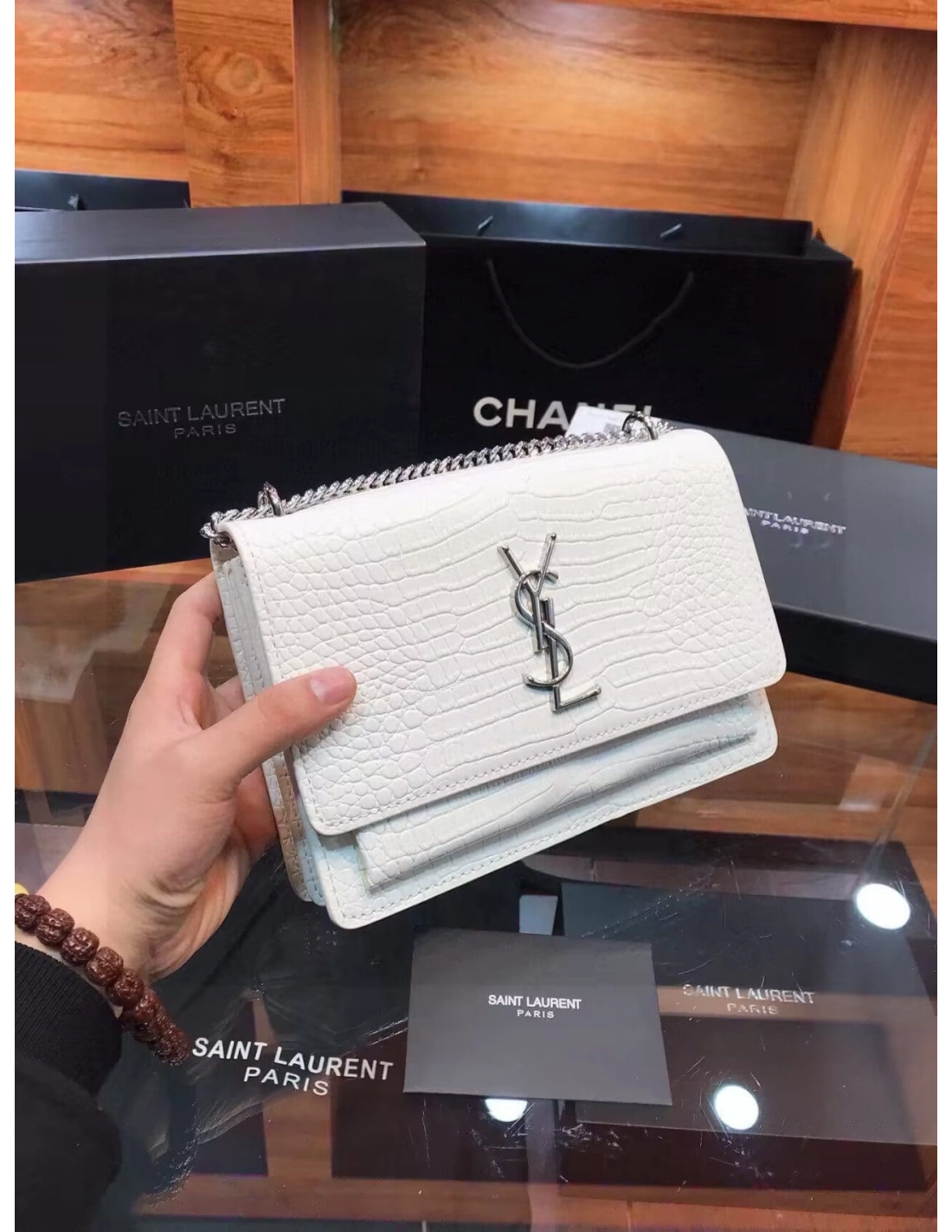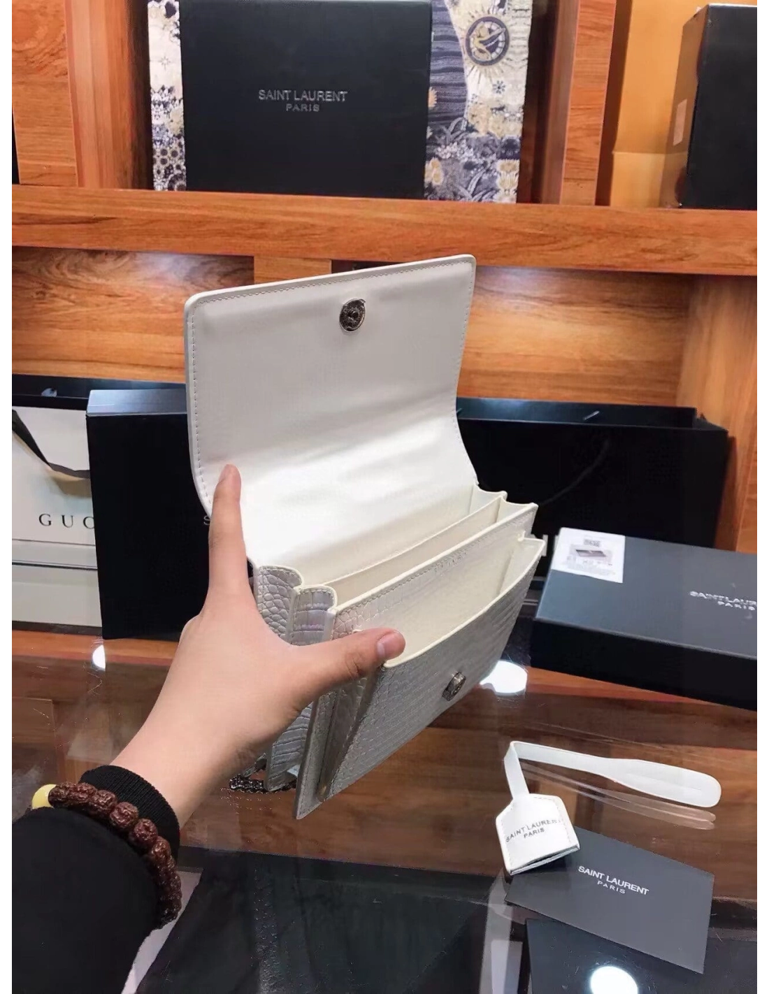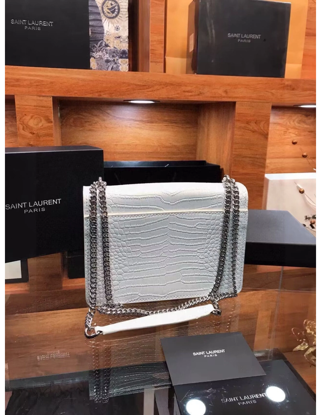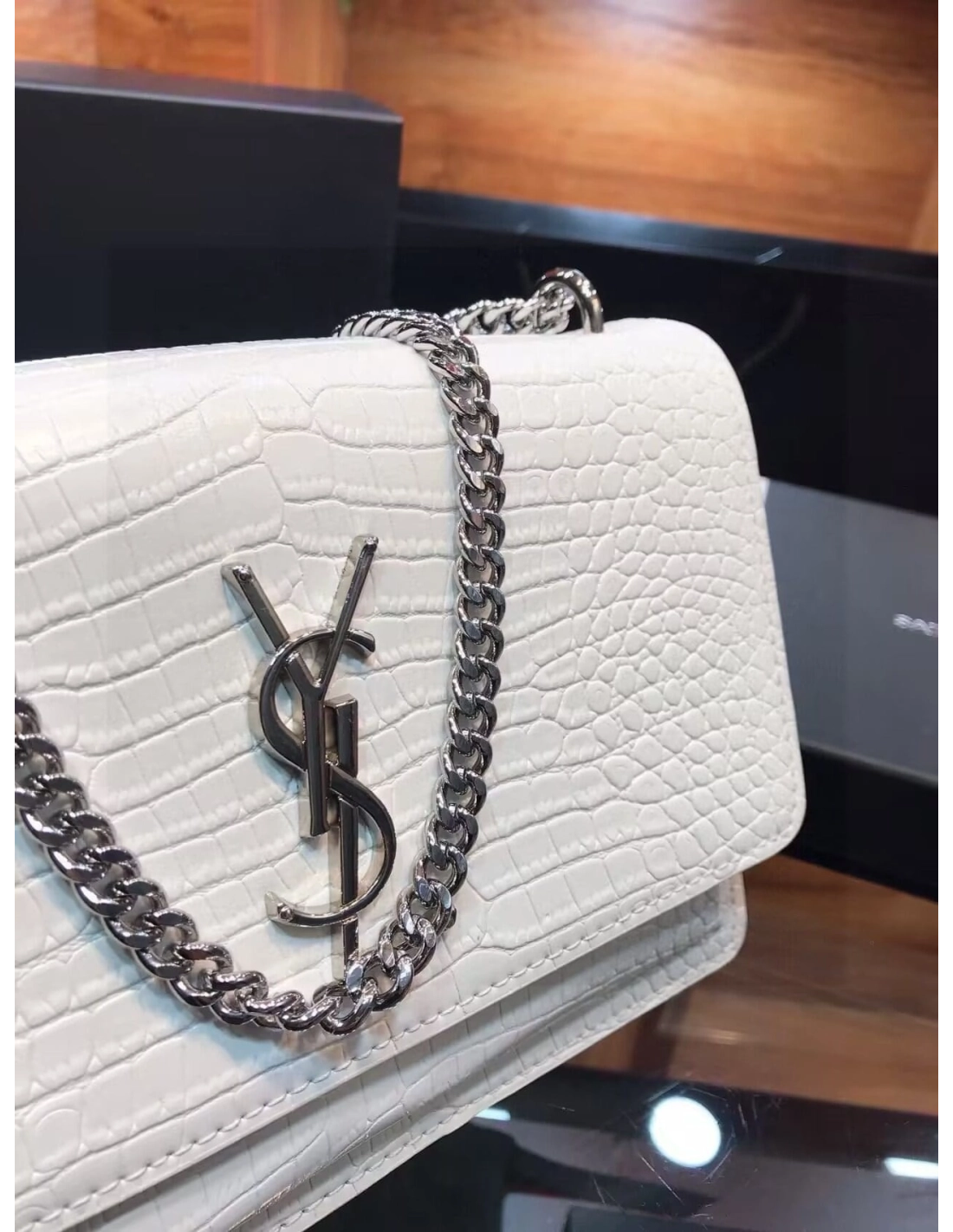 SAINT LAURENT Calfskin Crocodile Embossed Medium Monogram Sunset Icy White