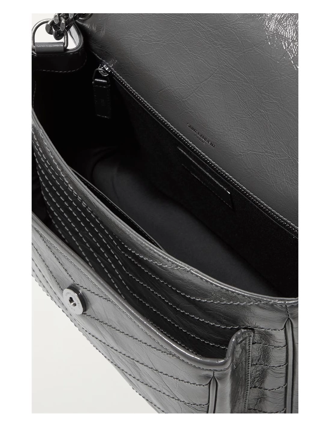 SAINT LAURENTs Niki bag has been made in Italy from crinkled glossed-leather for a vintage feel and detailed with signature chevron stitching. Its embellished with a tonal YSL plaque at the front and has adjustable chain straps.