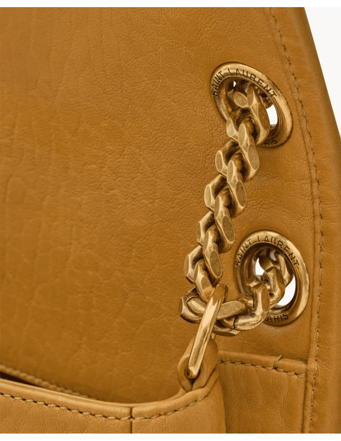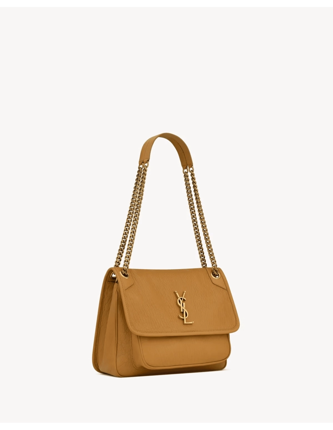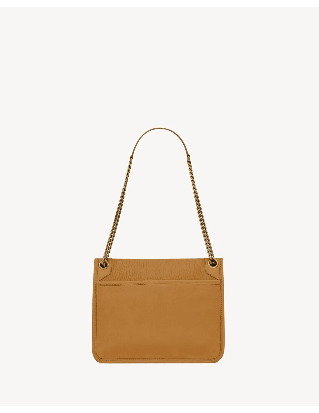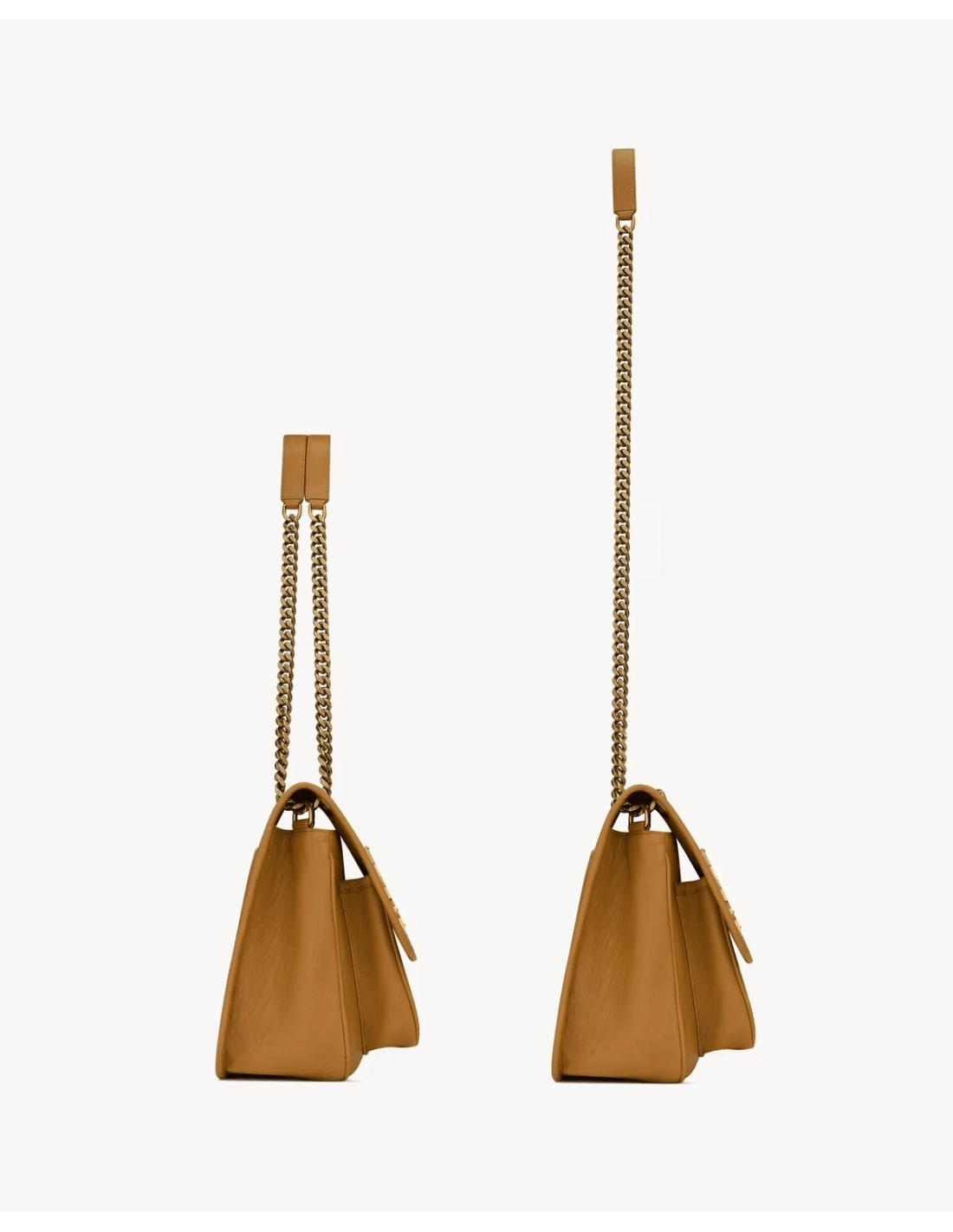 This spacious bag features multiple pockets, while a sliding leather-and-chain shoulder strap allows for both shoulder and crossbody carry options.