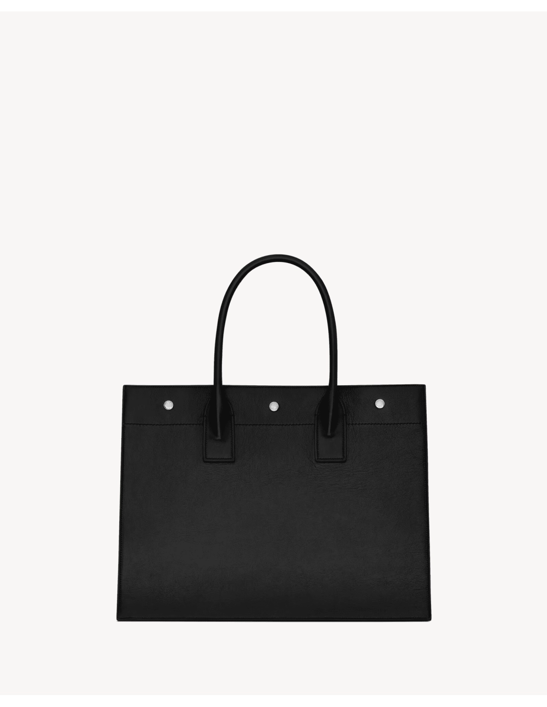 Saint Laurent Rive Gauche small tote bag with tubular handles, fastened with three Saint Laurent-engraved snap buttons and featuring an inside zip pocket.